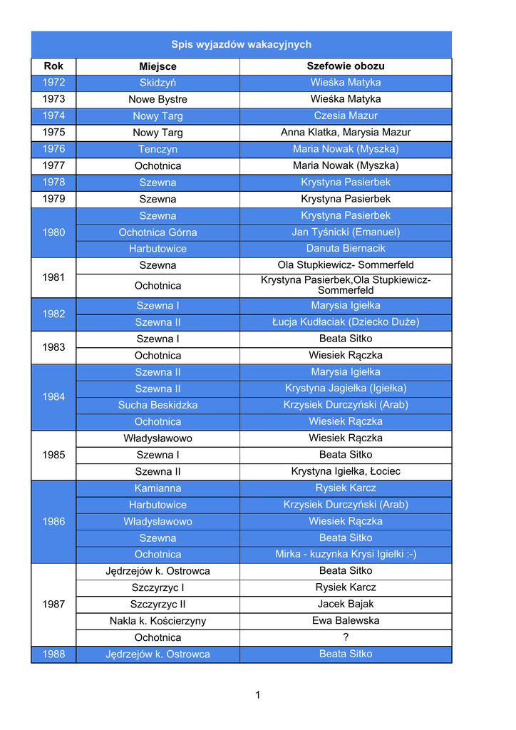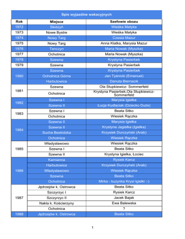 Spis wyjazdów wakacyjnych Rok Miejsce Szefowie obozu 1972 Skidzyń Wieśka Matyka 1973 Nowe Bystre Wieśka Matyka 1974 Nowy Targ Czesia Mazur 1975 Nowy Targ Anna Klatka, Marysia Mazur 1976 Tenczyn Maria Nowak (Myszka) 1977 Ochotnica Maria Nowak (Myszka) 1978 Szewna Krystyna Pasierbek 1979 Szewna Krystyna Pasierbek Szewna Krystyna Pasierbek Ochotnica Górna Jan Tyśnicki (Emanuel) Harbutowice Danuta Biernacik Szewna Szewna I Ola Stupkiewicz- Sommerfeld Krystyna Pasierbek,Ola StupkiewiczSommerfeld Marysia Igiełka Szewna II Łucja Kudłaciak (Dziecko Duże) Szewna I Beata Sitko Ochotnica Wiesiek Rączka Szewna II Marysia Igiełka Szewna II Krystyna Jagiełka (Igiełka) Sucha Beskidzka Krzysiek Durczyński (Arab) Ochotnica Wiesiek Rączka Władysławowo Wiesiek Rączka Szewna I Beata Sitko Szewna II Krystyna Igiełka, Łociec Kamianna Rysiek Karcz Harbutowice Krzysiek Durczyński (Arab) Władysławowo Wiesiek Rączka Szewna Beata Sitko Ochotnica Mirka - kuzynka Krysi Igiełki :-) Jędrzejów k. Ostrowca Beata Sitko Szczyrzyc I Rysiek Karcz Szczyrzyc II Jacek Bajak Nakla k. Kościerzyny Ewa Balewska Ochotnica ? Jędrzejów k. Ostrowca Beata Sitko 1980 1981 1982 1983 1984 1985 1986 1987 1988 Ochotnica 1 Jędrzejów k. Ostrowca (obóz rodzinny) Beata Sitko Klewki Tułowice Wojtek Budziło, Agata Grochal Sławomir Kowalski,Dorota Kądziołka (Młoda Limanówka) Jacek Bajak, Jacek Tarnowski Ochotnica Mirka - kuzynka Krysi Igiełki :-) Jędrzejów k. Ostrowca Beata Sitko Szczyrzyc I Rysiek Karcz Szczyrzyc II Jacek Bajak Nakla k. Kościerzyny Ewa Balewska Ochotnica ? Jędrzejów k. Ostrowca Beata Sitko Jędrzejów k. Ostrowca (obóz rodzinny) Beata Sitko Klewki Tułowice Wojtek Budziło, Agata Grochal Sławomir Kowalski i Dorota Kądziołka (Młoda Limanówka) Jacek Bajak, Jacek Tarnowski Jędrzejów k. Ostrowca Beata Sitko Klewki I Przemek Budziło Klewki II Agata Grochal Tułowice I Barbara Turmańska Tułowice II Romek Sokorski, Jacek Bajak Turawa k. Opola Piotr Baran Żukowo ? Jędrzejów k. Ostrowca Beata Sitko Klewki Przemek Budziło Tułowice Roman Sokorski, Barbara Warzecka Krasnobród Andrzej Obidowicz Żukowo ? Ochotnica Agata Grochal Siedliska k. Zamościa Piotr Baran Jędrzejów k. Ostrowca Bożena Święchowicz (Murzyn) Tułowice Klewki Jaśka Mielczuch Barbara Branicka, Roman Sokorski, Agata Wróbel ? Ochotnica I Wojtek Budziło Ochotnica II ? Pasierbiec 1987 1988 Pasierbiec 1989 1990 1991 1992 Bezmiechowa (Bieszczady) 2 Radawa Paweł Kołodziejski Dorota Papież,Barbara Branicka,Roman Sokorski Władek Gurba Ochotnica Wojtek Budziło Gdańsk-BrzeĽno Wiesiek Rączka Chałupki Dębniańskie k. Leżajska Barbara Branicka,Roman Sokorski Radawa Władek Gurba Gołkowice k. Nowego Sącza Paweł Konkol (Banan) Jarosław Władek Gurba Gołkowice Paweł Konkol (Banan) Sorkwity Władek Gurba Spychowo Grzesiek Sotoła Szymbark Marycha Stróżniak Grywałd Paweł Konkol (Banan) Sorkwity Władek Gurba Spychowo Grzesiek Sotoła Władysławowo Marycha Stróżniak Spychowo Kasia Słonecka, Piotrek Gurba Spychowo Grzesiek Sotoła Radymno Marycha Strużniak Nętno Piotrek Gurba Nętno Grzesiek Sotoła Radymno Marycha Stróżniak ??? Agnieszka Karch Nętno Kasia Słonecka Nętno Grzesiek Sotoła Płaska Kasia Słonecka Płaska Grzesiek Sotoła Kudowa Agnieszka Karch-Czerlunczakiewicz Płaska Monika Podenkiewicz Płaska Grzesiek Sotoła Warpuny-Zyndaki Monika Podenkiewicz Warpuny-Zyndaki Grzesiek Sotoła Kudowa Dorota Zańko, Agnieszka Czerlunczakiewicz Warpuny-Zyndaki Asia Pstrusińska Warpuny-Zyndaki Grzesiek Sotoła Jastrzębia Góra Agnieszka Czerlunczakiewicz Tułowice Wilkowice 1993 1994 1995 1996 1997 1998 1999 2000 2001 2002 2004 3 2005 2006 2007 2008 2009 2010 2011 2012 2013 2014 2015 Studzienice Grzesiek Sotoła Studzienice Asia Pstrusińska,Staszek Gurba Studzienice Grzesiek Sotoła Studzienice Paweł Jachym Kudowa Zdrój Agnieszka Czerlunczakiewisz Studzienice Staszek Gurba Rydzewo Grzesiek Sotoła Rydzewo Staszek Gurba Rydzewo Grzesiek Sotoła Rydzewo Damian Dudziński Rydzewo Grzesiek Sotoła Rydzewo Damian Dudziński, Kama Guzik Rydzewo Grzesiek Sotoła Drawno Kama Guzik Drawno Grzesiek Sotoła Studzienice Justa Rosek, Kama Guzik Drawno Grzesiek Sotoła Studzienice Justa Rosek Drawno Grzesiek Sotoła Rydzewo Beata Cichy (Grupa Studencka) Drawno Grzesiek Sotoła (Grupa Rodzinna) Rydzewo (Grupa Studencka) Rajgród (Grupa Rodzinna) Obozy zaznaczone kursywą, to te co do których brak pewności kiedy i gdzie się odbyły. 4