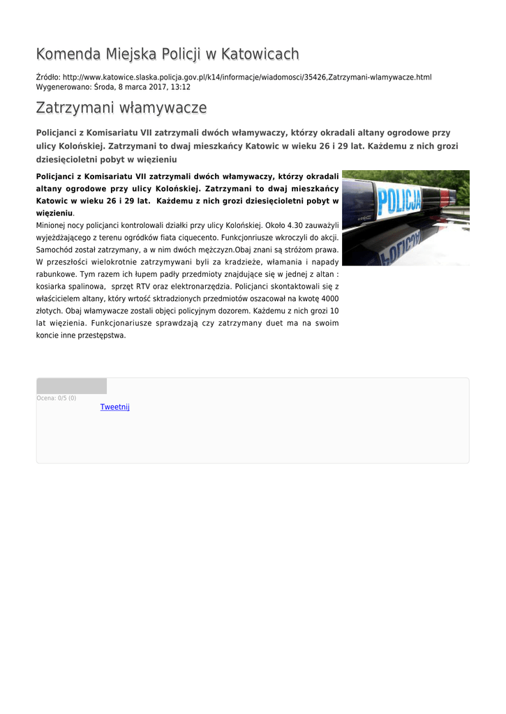 Komenda Miejska Policji w Katowicach Źródło: http://www.katowice.slaska.policja.gov.pl/k14/informacje/wiadomosci/35426,Zatrzymani-wlamywacze.html Wygenerowano: Środa, 8 marca 2017, 13:12 Zatrzymani włamywacze Policjanci z Komisariatu VII zatrzymali dwóch włamywaczy, którzy okradali altany ogrodowe przy ulicy Kolońskiej. Zatrzymani to dwaj mieszkańcy Katowic w wieku 26 i 29 lat. Każdemu z nich grozi dziesięcioletni pobyt w więzieniu Policjanci z Komisariatu VII zatrzymali dwóch włamywaczy, którzy okradali altany ogrodowe przy ulicy Kolońskiej. Zatrzymani to dwaj mieszkańcy Katowic w wieku 26 i 29 lat. Każdemu z nich grozi dziesięcioletni pobyt w więzieniu. Minionej nocy policjanci kontrolowali działki przy ulicy Kolońskiej. Około 4.30 zauważyli wyjeżdżającego z terenu ogródków fiata ciquecento. Funkcjonriusze wkroczyli do akcji. Samochód został zatrzymany, a w nim dwóch mężczyzn.Obaj znani są stróżom prawa. W przeszłości wielokrotnie zatrzymywani byli za kradzieże, włamania i napady rabunkowe. Tym razem ich łupem padły przedmioty znajdujące się w jednej z altan : kosiarka spalinowa, sprzęt RTV oraz elektronarzędzia. Policjanci skontaktowali się z właścicielem altany, który wrtość sktradzionych przedmiotów oszacował na kwotę 4000 złotych. Obaj włamywacze zostali objęci policyjnym dozorem. Każdemu z nich grozi 10 lat więzienia. Funkcjonariusze sprawdzają czy zatrzymany duet ma na swoim koncie inne przestępstwa. Ocena: 0/5 (0) Tweetnij
