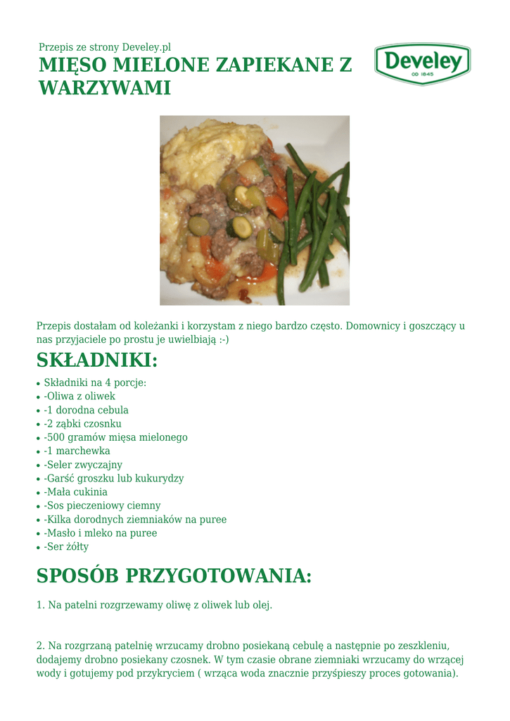 Przepis ze strony Develey.pl MIĘSO MIELONE ZAPIEKANE Z WARZYWAMI Przepis dostałam od koleżanki i korzystam z niego bardzo często. Domownicy i goszczący u nas przyjaciele po prostu je uwielbiają :-) SKŁADNIKI: ● ● ● ● ● ● ● ● ● ● ● ● ● Składniki na 4 porcje: -Oliwa z oliwek -1 dorodna cebula -2 ząbki czosnku -500 gramów mięsa mielonego -1 marchewka -Seler zwyczajny -Garść groszku lub kukurydzy -Mała cukinia -Sos pieczeniowy ciemny -Kilka dorodnych ziemniaków na puree -Masło i mleko na puree -Ser żółty SPOSÓB PRZYGOTOWANIA: 1. Na patelni rozgrzewamy oliwę z oliwek lub olej. 2. Na rozgrzaną patelnię wrzucamy drobno posiekaną cebulę a następnie po zeszkleniu, dodajemy drobno posiekany czosnek. W tym czasie obrane ziemniaki wrzucamy do wrzącej wody i gotujemy pod przykryciem ( wrząca woda znacznie przyśpieszy proces gotowania). 3. Na patelnie, na której, znajduje się cebula i czosnek, dodajemy mięso mielone staramy się go opiec w miarę szybko z każdej strony. Doprawiamy solą i pieprzem. W czasie, gdy nasze mięso się podsmaża, wrzucamy posiekaną w plasterki marchewkę do wrzącej wody tak, aby ugotować ja na pólmiękko. 4. Starając się mieszać mięso od czasu do czasu, przygotowujemy sos pieczeniowy. Gdy mięso jest już gotowe to w tej samej patelni zalewamy go wcześniej przygotowanym sosem. Skręcamy palnik na mniejszą temperaturę. 5. Następnie dodajemy warzywa: posiekany w plasterki seler zwyczajny, garść groszku lub kukurydzy, posiekaną w plasterki cukinie oraz na pól miękką marchewkę. Zostawiamy nasze danie na kilka kolejnych minut na małym ogniu. 6. Do tego czasu nasze ziemniaki powinny być już gotowe wiec przygotowujemy nasze puree. 7. Gdy sos zacznie wrzeć przelewamy wszystko do naczynia żaroodpornego oraz ziemniaczane puree przekładamy delikatnie na wierzch. 8. Wkładamy do piekarnika na około 30 minut na 180⁰C( czas zależny jest od waszego piekarnika, więc proponuję monitorować przebieg pieczenia). 9. Po tym czasie wyciągamy nasze danie i posypujemy żółtym serem startym na drobnym tarle i wkładamy ponownie do piekarnika na około 20 minut. 10. Możemy podkręcić temperaturę. Nasze danie jest gotowe wówczas, gdy ser ładnie się roztopi i zarumieni. 11. Danie możemy podawać np. z fasolką zieloną jak na zdjęciu, ale może być to również brokuł lub inne warzywo, które lubicie SMACZNEGO