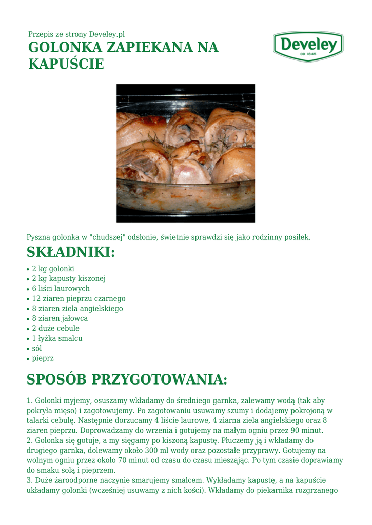 Przepis ze strony Develey.pl GOLONKA ZAPIEKANA NA KAPUŚCIE Pyszna golonka w "chudszej" odsłonie, świetnie sprawdzi się jako rodzinny posiłek. SKŁADNIKI: ● ● ● ● ● ● ● ● ● ● 2 kg golonki 2 kg kapusty kiszonej 6 liści laurowych 12 ziaren pieprzu czarnego 8 ziaren ziela angielskiego 8 ziaren jałowca 2 duże cebule 1 łyżka smalcu sól pieprz SPOSÓB PRZYGOTOWANIA: 1. Golonki myjemy, osuszamy wkładamy do średniego garnka, zalewamy wodą (tak aby pokryła mięso) i zagotowujemy. Po zagotowaniu usuwamy szumy i dodajemy pokrojoną w talarki cebulę. Następnie dorzucamy 4 liście laurowe, 4 ziarna ziela angielskiego oraz 8 ziaren pieprzu. Doprowadzamy do wrzenia i gotujemy na małym ogniu przez 90 minut. 2. Golonka się gotuje, a my sięgamy po kiszoną kapustę. Płuczemy ją i wkładamy do drugiego garnka, dolewamy około 300 ml wody oraz pozostałe przyprawy. Gotujemy na wolnym ogniu przez około 70 minut od czasu do czasu mieszając. Po tym czasie doprawiamy do smaku solą i pieprzem. 3. Duże żaroodporne naczynie smarujemy smalcem. Wykładamy kapustę, a na kapuście układamy golonki (wcześniej usuwamy z nich kości). Wkładamy do piekarnika rozgrzanego do 180 stopni i pieczemy przez około 20-30 minut.