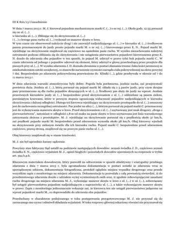 III K 820/13 Uzasadnienie W dniu 7 marca 2013 r. M. J. kierował pojazdem mechanicznym marki C. (...) o nr rej. (...). Około godz. 12:55 poruszał się on ul. (...) w kierunku ul. (...). Zbliżając się do skrzyżowania ul. (...) i (...) z lewego pasa ruchu ul. (...) wykonał on manewr skrętu w lewo. W tym czasie nie obserwował należycie drogi i nie zauważył nadjeżdżającego ul. (...) w kierunku ul. (...) środkowym pasem przeznaczonym do jazdy prosto pojazdu marki M. o nr rej. (...) kierowanego przez E. N.. Pojazd marki M. wjeżdżając na skrzyżowanie znajdował się częściowo na sąsiednim pasie ruchu. W wyniku niezachowania należytej ostrożności podczas zbliżania się do skrzyżowania i nie ustąpienia pierwszeństwa pojazdowi kierowanemu przez E. N. doszło do zderzenia obu pojazdów w ten sposób, że pojazd M. uderzył w prawy tylni bok pojazdu marki C.. W czasie zderzenia od jednego z pojazdów oderwał się element, który uderzył w głowę przechodzącą przez przejście dla pieszych przy ul. (...). W wyniku zdarzenia J. D. doznała obrażenia w postaci złamania trzonu i łuku kości jarzmowej ze zniekształceniem zatoki szczękowej, co stanowiło naruszenie czynności narządu ciała pokrzywdzonej na okres powyżej 7 dni. Bezpośrednio po zdarzeniu pokrzywdzoną przewieziono do Kliniki (...), gdzie przebywała w okresie od 7 do 11 marca 2013 r. W dniu zdarzenia warunki atmosferyczne były dobre. Pogoda była pochmurna, jezdnia sucha, zaś przejrzystość powietrza duża. Jezdnia ul. (...), którą poruszał się pojazd marki M. składa się z 3 pasów jazdy, przy czym skrajne pasy przeznaczone są dla ruchu pojazdów skręcających w ul. (...). Środkowy pas służy do jazdy na wprost. Jezdnie przeciwnych kierunków jazdy ul. (...) bezpośrednio przed skrzyżowaniem z ul. (...) oddzielone są pasem zieleni, porośniętym krzewami, które w pewnym stopniu ograniczają widoczność pojazdów nadjeżdżających w kierunku skrzyżowania z dalszej odległości. Dlatego też kierowca wjeżdżający na skrzyżowanie prostopadle do ul. (...) zmuszony jest do zachowania szczególnej ostrożności. Pas jezdni na ulicy (...), którym poruszał się pojazd marki C. przeznaczony jest do wykonywania manewru skrętu w lewo. Przed skrzyżowaniem z ul. (...) usytuowany jest znak drogowy „droga z pierwszeństwem”, natomiast w odległości 1,8 m od znaku na pasie skrętu w lewo usytuowana jest linia warunkowego zatrzymania złożona z prostokątów. M. J. wjeżdżając na skrzyżowanie poruszał się z prędkością około 37 km/h, zaś prędkość pojazdu marki M. bezpośrednio przed zderzeniem wynosiła około 58 km/h. Obaj kierowcy wjechali na skrzyżowanie przy zielonym świetle dla ich kierunku ruchu. Pojazd marki C. bezpośrednio przed zdarzeniem częściowo, prawą stroną, znajdował się na prawym pasie ruchu ul. (...). Obaj kierowcy znajdowali się w stanie trzeźwości. M. J. nie był uprzednio karany sądownie. Powyższy stan faktyczny Sąd ustalił na podstawie następujących dowodów: zeznań świadka J. D., częściowo zeznań świadka E. N., częściowo wyjaśnień M. J., opinii biegłych i pozostałych dowodów ujawnionych na rozprawie w trybie art. 394 k.p.k. Kluczowym materiałem dowodowym, który pozwolił na odtworzenie w sposób obiektywny i wiarygodny przebiegu zdarzenia z dnia 7 marca 2013 r. była zgromadzona dokumentacja w postaci notatki ze zdarzenia wraz ze sporządzonym szkicem, dokumentacja fotograficzna, protokół oględzin miejsca wypadku drogowego oraz przede wszystkim zapis z monitoringu na miejscu zdarzenia. Dokumentacja ta pozwalała z całą pewnością stwierdzić, iż do przedmiotowego zdarzenia doszło z udziałem wyżej wymienionych osób oraz, iż zgodnie zobowiązującymi zasadami ruchu drogowego na miejscu zdarzenia M. J., wykonując manewr skrętu w lewo z ul. (...) w ul. (...), zobowiązany był ustąpić pierwszeństwa pojazdom nadjeżdżającym z naprzeciwka ul. (...), a także wykonującym manewr skrętu w prawo. Zapis z monitoringu jednoznacznie wskazuje zaś, że kierowca ten nie ustąpił pierwszeństwa jadącemu na wprost pojazdowi marki M., co doprowadziło do zderzenia obu pojazdów. Przesłuchany w charakterze podejrzanego w toku postępowania przygotowawczego M. J. nie przyznał się do zarzucanego mu czynu i odmówił składania wyjaśnień. W toku rozprawy głównej oskarżony również nie przyznawał się do winy. W złożonych wyjaśnieniach kwestionował on ustaloną przez biegłego prędkość, z jaką poruszał się kierowca M. oraz podnosił, iż kierowca M. w sposób nieuprawniony poruszał się prawym pasem ruchu pomimo, iż jechał on na wprost. W jego ocenie nieprawidłowe ustawienie pojazdu M. na jezdni oraz nadmierna prędkość spowodowały, iż nie był on w stanie, przy zachowaniu reguł ostrożności, w porę zauważyć nadjeżdżający z prawej strony samochód. W odniesieniu do powyższego wskazać w pierwszej kolejności należy, iż wyjaśnienia oskarżonego co do rzekomej prędkości, z jaką poruszał się pojazd marki M. nie znajdują odzwierciedlenia w pozostałym materiale dowodowym. Przybliżona bowiem prędkość obu uczestników zdarzenia została w sposób rzetelny i wiarygodny wyliczona przez biegłego z zakresu badań wypadków drogowych. Posługując się tą samą metodą w obu wypadkach biegły ustalił, iż prędkość pojazdu kierowanego przez oskarżonego na skrzyżowaniu wynosiła około 37 km/h, zaś pojazdu marki M. około 58 km/h. Biegły w tym zakresie wskazał, iż dokładne wyliczenie prędkości nie było możliwe z uwagi na brak wystarczających danych, wobec czego metodą służącą oszacowaniu przybliżonych prędkości było wyliczenie prędkości na podstawie przebytych odcinków drogi z wykorzystaniem zapisu monitoringu z miejsca zdarzenia i poczynionych pomiarów. Sposób wyliczenia został zaprezentowany przez biegłego w sposób logiczny i nie budzący wątpl