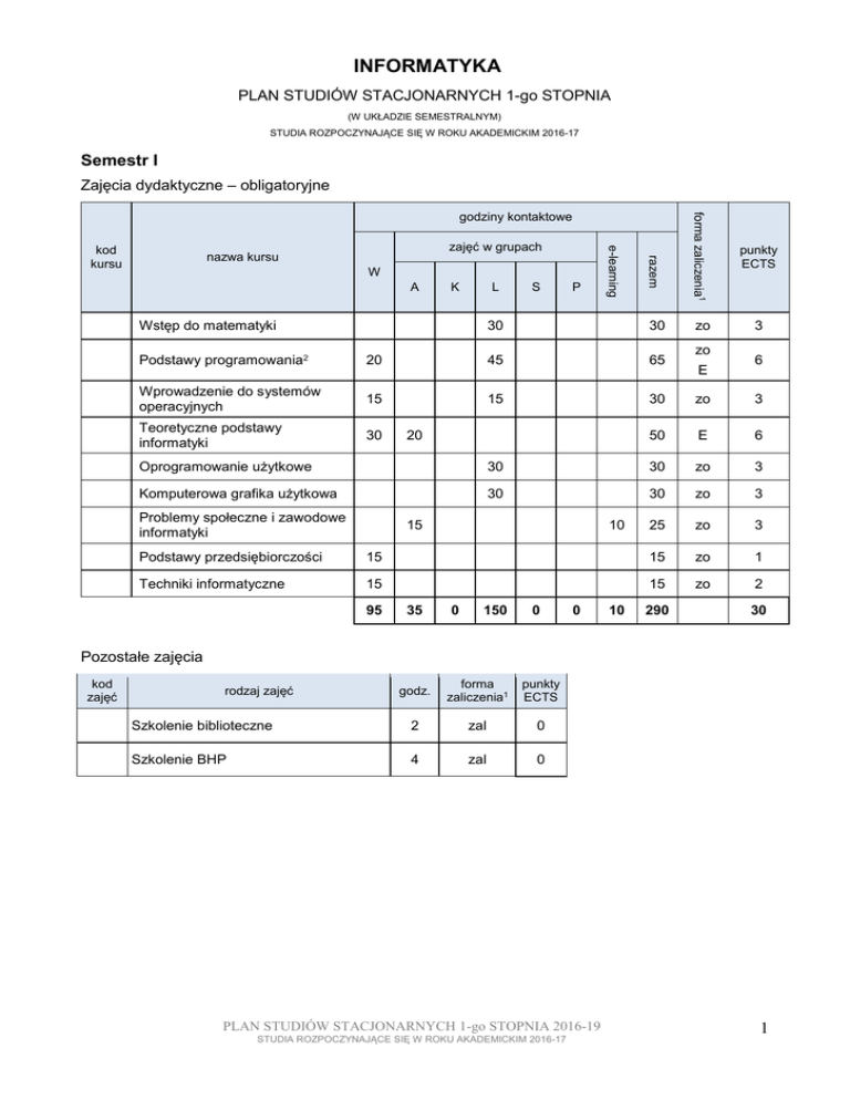 INFORMATYKA PLAN STUDIÓW STACJONARNYCH 1-go STOPNIA (W UKŁADZIE SEMESTRALNYM) STUDIA ROZPOCZYNAJĄCE SIĘ W ROKU AKADEMICKIM 2016-17 Semestr I Zajęcia dydaktyczne – obligatoryjne zajęć w grupach W A K L Wstęp do matematyki S P razem nazwa kursu e-learning kod kursu 30 30 forma zaliczenia1 godziny kontaktowe zo zo punkty ECTS 3 Podstawy programowania2 20 45 65 Wprowadzenie do systemów operacyjnych 15 15 30 zo 3 Teoretyczne podstawy informatyki 30 50 E 6 20 E 6 Oprogramowanie użytkowe 30 30 zo 3 Komputerowa grafika użytkowa 30 30 zo 3 25 zo 3 Problemy społeczne i zawodowe informatyki 15 10 Podstawy przedsiębiorczości 15 15 zo 1 Techniki informatyczne 15 15 zo 2 95 35 0 150 0 0 10 290 30 Pozostałe zajęcia kod zajęć godz. forma zaliczenia1 punkty ECTS Szkolenie biblioteczne 2 zal 0 Szkolenie BHP 4 zal 0 rodzaj zajęć PLAN STUDIÓW STACJONARNYCH 1-go STOPNIA 2016-19 STUDIA ROZPOCZYNAJĄCE SIĘ W ROKU AKADEMICKIM 2016-17 1 Semestr II Zajęcia dydaktyczne – obligatoryjne zajęć w grupach W A Fizyczne podstawy działania urządzeń informatycznych 15 Algorytmy i struktury danych 30 Matematyka 1 30 Organizacja i architektura komputerów 30 Języki hipertekstowe i tworzenie stron WWW Programowanie proceduralne K L S P razem nazwa kursu e-learning kod kursu forma zaliczenia1 godziny kontaktowe punkty ECTS 15 zo 2 60 E 5 60 E 6 30 60 zo 5 10 45 55 zo 3 15 30 45 E 5 30 30 0 135 0 0 0 P e-learning 130 30 295 26 Kursy do wyboru3 zajęć w grupach nazwa kursu W A Język obcy K L S razem kod kursu 40 40 40 40 forma zaliczenia1 godziny kontaktowe zal punkty ECTS 3 3 Pozostałe zajęcia kod zajęć godz. forma zaliczenia1 punkty ECTS Ochrona własności intelektualnej 15 zal 1 Projektowanie ścieżki edukacyjnej i kariery zawodowej 2 zal 0 rodzaj zajęć PLAN STUDIÓW STACJONARNYCH 1-go STOPNIA 2016-19 STUDIA ROZPOCZYNAJĄCE SIĘ W ROKU AKADEMICKIM 2016-17 2 Semestr III Zajęcia dydaktyczne – obligatoryjne zajęć w grupach W A Matematyka 2 30 Programowanie obiektowe 15 Systemy operacyjne Relacyjne bazy danych K L S P punkty ECTS 60 E 5 30 45 E 5 20 30 50 zo 3 15 15 30 zo 2 Przetwarzanie dokumentów XML i zaawansowane techniki WWW 30 30 zo 2 Komunikacja i zarządzanie projektami 15 15 zo 1 30 60 E 4 30 30 zo 2 Sieci komputerowe 30 razem nazwa kursu e-learning kod kursu forma zaliczenia1 godziny kontaktowe 30 Języki skryptowe 30 0 180 0 0 0 P e-learning 110 320 24 Kursy do wyboru3 zajęć w grupach nazwa kursu W A Język obcy K L S razem kod kursu 40 40 40 40 forma zaliczenia1 godziny kontaktowe zal punkty ECTS 3 3 Moduły specjalności do wyboru4 kod modułu nazwa modułu punkty ECTS Administracja systemami informatycznymi 3 Multimedia i technologie internetowe 3 Social Media 3 PLAN STUDIÓW STACJONARNYCH 1-go STOPNIA 2016-19 STUDIA ROZPOCZYNAJĄCE SIĘ W ROKU AKADEMICKIM 2016-17 3 Semestr IV Zajęcia dydaktyczne – obligatoryjne zajęć w grupach W A K L S P razem nazwa kursu e-learning kod kursu forma zaliczenia1 godziny kontaktowe punkty ECTS Multimedia i ich zastosowania 15 15 zo 1 Wstęp do programowania w języku Java 30 30 zo 2 Kryptografia i bezpieczeństwo systemów komputerowych 15 30 45 E 3 Systemy wbudowane 15 30 45 zo 3 0 0 105 0 0 0 P e-learning 30 135 9 Kursy do wyboru3 zajęć w grupach nazwa kursu W A Język obcy K L S 30 Kultura fizyczna 30 Wykład/y ogólnouczelniany5 15/30 15/30 30 30 0 0 0 0 razem kod kursu forma zaliczenia1 godziny kontaktowe punkty ECTS 30 E 4 30 zal 1 15/ 30 zal 2 75/ 90 7 Moduły specjalności do wyboru4 kod modułu nazwa modułu punkty ECTS Administracja systemami informatycznymi 14 Multimedia i technologie internetowe 14 Social media 14 PLAN STUDIÓW STACJONARNYCH 1-go STOPNIA 2016-19 STUDIA ROZPOCZYNAJĄCE SIĘ W ROKU AKADEMICKIM 2016-17 4 Semestr V Zajęcia dydaktyczne – obligatoryjne zajęć w grupach W A K L S P razem nazwa kursu e-learning kod kursu forma zaliczenia1 godziny kontaktowe punkty ECTS Metody numeryczne 11 22 33 E 4 Bazy danych w aplikacjach internetowych 20 33 53 zo 4 Inżynieria oprogramowania 11 22 33 E 4 Programowanie grafiki 11 11 22 zo 3 0 0 88 0 0 0 P e-learning 53 141 15 Kursy do wyboru3 zajęć w grupach nazwa kursu W A Wykład/y ogólnouczelniany5 K L S 15/30 punkty ECTS 15/ 30 zal 2 11 11 zo 2 11 26/ 41 15/30 Seminarium dziedzinowe 1 razem kod kursu forma zaliczenia1 godziny kontaktowe 4 Moduły specjalności do wyboru4 kod modułu nazwa modułu punkty ECTS Administracja systemami informatycznymi 11 Multimedia i technologie internetowe 11 Social media 11 PLAN STUDIÓW STACJONARNYCH 1-go STOPNIA 2016-19 STUDIA ROZPOCZYNAJĄCE SIĘ W ROKU AKADEMICKIM 2016-17 5 Semestr VI Zajęcia dydaktyczne – obligatoryjne zajęć w grupach W A Podstawy modelowania i symulacji 15 Informatyka kwantowa 15 Sztuczna inteligencja 15 L S P 15 20 0 0 35 0 0 0 P e-learning 45 K razem nazwa kursu e-learning kod kursu forma zaliczenia1 godziny kontaktowe punkty ECTS 30 E 4 15 zo 1 35 zo 3 80 8 Kursy do wyboru zajęć w grupach nazwa kursu W A K Seminarium dziedzinowe 2 L S razem kod kursu 30 30 30 30 forma zaliczenia1 godziny kontaktowe zo punkty ECTS 3 3 Moduły specjalności do wyboru4 kod modułu nazwa modułu punkty ECTS Administracja systemami informatycznymi 11 Multimedia i technologie internetowe 11 Social media 11 Egzamin dyplomowy Tematyka Przedmiotem egzaminu dyplomowego jest problematyka pracy dyplomowej oraz dyscyplin naukowych, których znajomość była niezbędna do napisania pracy. Zakres egzaminu dyplomowego obejmuje również treści przedmiotów z grupy zajęć kierunkowych i wybranej przez studenta specjalności. Szczegóły znajdują się na stronie internetowej Instytutu Informatyki (http://www.ii.up.krakow.pl). PLAN STUDIÓW STACJONARNYCH 1-go STOPNIA 2016-19 STUDIA ROZPOCZYNAJĄCE SIĘ W ROKU AKADEMICKIM 2016-17 Punkty ECTS 8 6 Uwagi: 1) Formy zaliczenia: E – egzamin, zo – zaliczenie z oceną, zal – zaliczenie bez oceny. 2) Kurs Podstawy Programowania kończy się zaliczeniem z oceną z ćwiczeń oraz eg