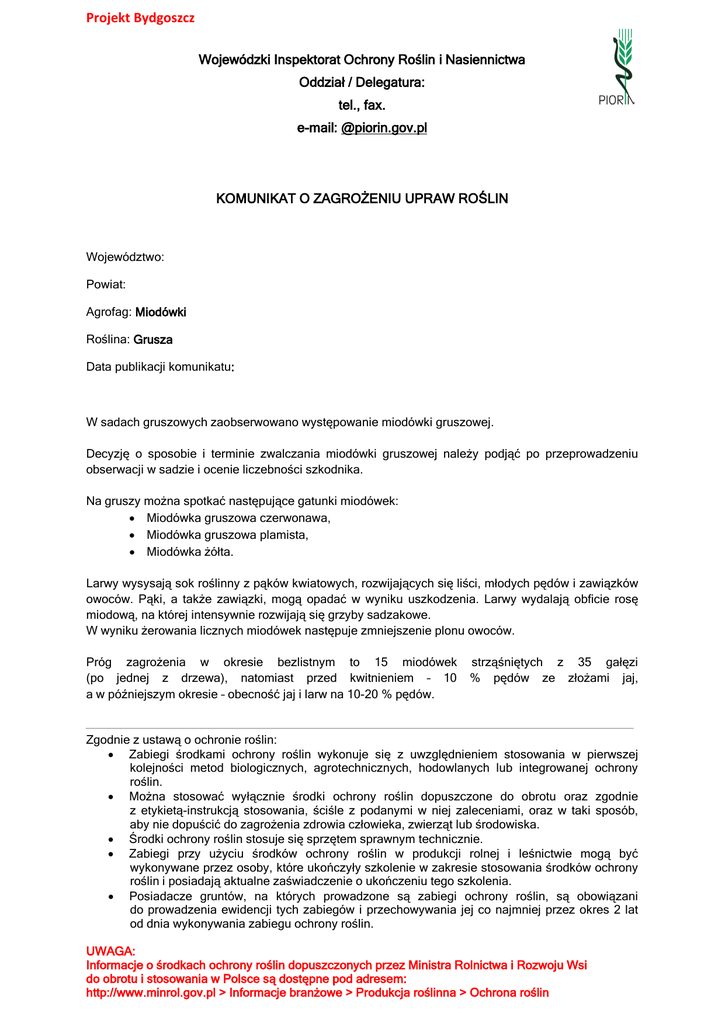 Projekt Bydgoszcz Wojewódzki Inspektorat Ochrony Roślin i Nasiennictwa Oddział / Delegatura: tel., fax. e-mail: @piorin.gov.pl KOMUNIKAT O ZAGROŻENIU UPRAW ROŚLIN Województwo: Powiat: Agrofag: Miodówki Roślina: Grusza Data publikacji komunikatu: W sadach gruszowych zaobserwowano występowanie miodówki gruszowej. Decyzję o sposobie i terminie zwalczania miodówki gruszowej należy podjąć po przeprowadzeniu obserwacji w sadzie i ocenie liczebności szkodnika. Na gruszy można spotkać następujące gatunki miodówek: • Miodówka gruszowa czerwonawa, • Miodówka gruszowa plamista, • Miodówka żółta. Larwy wysysają sok roślinny z pąków kwiatowych, rozwijających się liści, młodych pędów i zawiązków owoców. Pąki, a także zawiązki, mogą opadać w wyniku uszkodzenia. Larwy wydalają obficie rosę miodową, na której intensywnie rozwijają się grzyby sadzakowe. W wyniku żerowania licznych miodówek następuje zmniejszenie plonu owoców. Próg zagrożenia w okresie bezlistnym to 15 miodówek (po jednej z drzewa), natomiast przed kwitnieniem – 10 a w późniejszym okresie – obecność jaj i larw na 10-20 % pędów. strząśniętych z 35 gałęzi % pędów ze złożami jaj, Zgodnie z ustawą o ochronie roślin: • Zabiegi środkami ochrony roślin wykonuje się z uwzględnieniem stosowania w pierwszej kolejności metod biologicznych, agrotechnicznych, hodowlanych lub integrowanej ochrony roślin. • Można stosować wyłącznie środki ochrony roślin dopuszczone do obrotu oraz zgodnie z etykietą-instrukcją stosowania, ściśle z podanymi w niej zaleceniami, oraz w taki sposób, aby nie dopuścić do zagrożenia zdrowia człowieka, zwierząt lub środowiska. • Środki ochrony roślin stosuje się sprzętem sprawnym technicznie. • Zabiegi przy użyciu środków ochrony roślin w produkcji rolnej i leśnictwie mogą być wykonywane przez osoby, które ukończyły szkolenie w zakresie stosowania środków ochrony roślin i posiadają aktualne zaświadczenie o ukończeniu tego szkolenia. • Posiadacze gruntów, na których prowadzone są zabiegi ochrony roślin, są obowiązani do prowadzenia ewidencji tych zabiegów i przechowywania jej co najmniej przez okres 2 lat od dnia wykonywania zabiegu ochrony roślin. UWAGA: Informacje o środkach ochrony roślin dopuszczonych przez Ministra Rolnictwa i Rozwoju Wsi do obrotu i stosowania w Polsce są dostępne pod adresem: http://www.minrol.gov.pl > Informacje branżowe > Produkcja roślinna > Ochrona roślin