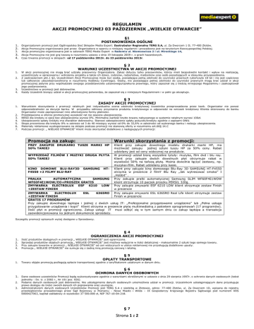 REGULAMIN AKCJI PROMOCYJNEJ 03 PAŹDZIERNIK „WIELKIE OTWARCIE” §1 POSTANOWIENIA OGÓLNE 1. 2. 3. 3. 4. Organizatorem promocji jest Ogólnopolska Sieć Sklepów Media Expert: Dystrybutor Regionalny TERG S.A, ul. Za Dworcem 1 D; 77-400 Złotów. Akcja Promocyjna organizowana jest przez Organizatora w oparciu o niniejszy regulamin i prowadzona jest na terytorium Rzeczypospolitej Polskiej. Akcja promocyjna organizowana jest w salonach TERG Media Expert w Radomiu ul. Niemcewicza 2 i ul. Mireckiego 14, Akcja Promocyjna nie jest grą losową w rozumieniu ustawy z dnia 19 listopada 2009 r. o grach hazardowych. Czas trwania promocji w sklepach: od 17 października 2013r. do 23 października 2013r. §2 WARUNKI UCZESTNICTWA W AKCJI PROMOCYJNEJ 1. 2. 3. 4. W akcji promocyjnej nie mogą brać udziału pracownicy Organizatora. Zakaz dotyczy tylko pracowników, którzy mieli bezpośredni kontakt i wpływ na realizację, uczestniczyły w opracowaniu i wdrożeniu projektu a także ich dzieci, rodziców, rodzeństwa, małżonków oraz osób pozostających w stosunku przysposobienia. Z zastrzeżeniem pkt.1 §2, Uczestnikiem Akcji Promocyjnej może być osoba, posiadająca pełną zdolność do czynności prawnych (ukończyła 18 lat i nie jest częściowo lub całkowicie ubezwłasnowolniona w rozumieniu Kodeksu Cywilnego). Osoby, nie posiadające pełnej zdolności do czynności prawnych mogą brać udział w akcji promocyjnej jedynie przy współudziale swojego przedstawiciela ustawowego/opiekuna prawnego, który zapoznał się z treścią niniejszego Regulaminu i zaakceptował jego postanowienia. Uczestnictwo w promocji jest dobrowolne. Każdy Uczestnik biorący udział w akcji promocyjnej potwierdza, że zapoznał się z niniejszym Regulaminem i w pełni go akceptuje. §3 ZASADY AKCJI PROMOCYJNEJ 1. 2. 3. 4. 5. 6. 7. Warunkiem skorzystania z promocji ratalnych jest indywidualna ocena zdolności kredytowej Uczestnika przeprowadzona przez bank. Organizator nie ponosi odpowiedzialności za decyzje banku. W przypadku odmowy przyznania produktu kredytowego w odpowiedzi na wniosek kredytowy Klienta skierowany do banku Organizator może zaproponować inne alternatywne formy płatności. Przedstawiona w ofercie promocyjnej wysokość rat nie zawiera ubezpieczenia. RRSO dla kredytu w opcji bez ubezpieczenia wynosi 0%. Minimalna wartość brutto towaru nabywanego w systemie ratalnym wynosi 100zł. Ubezpieczenie spłaty kredytu ma charakter dobrowolny. Stanowi zabezpieczenie spłaty pożyczki/kredytu zgodnie z zapisami OWU. Stopa procentowa dla kredytu 0% w zakresie od 3 do 40 miesięcy wynosi od 0% do 32,6% w zależności od wybranego banku i rodzaju ubezpieczenia. Materiały reklamowe wyeksponowane na sklepie podczas promocji nie stanowią oferty w rozumieniu art.66§ 1K.C Podczas promocji: „ WIELKIE OTWARCIE” Klient może skorzystać dodatkowo z następujących promocji: Promocja na zakup: Warunki skorzystania z promocji: PRZY ZAKUPIE DRUKARKI TUSZE MARKI HP 50% TANIEJ Klient przy zakupie dowolnego modelu drukarki marki HP, ma możliwość zakupu jednej sztuki tuszu HP za 50% ceny. Rabat udzielany jest od ceny widocznej na produkcie. W promocji udział biorą wszystkie tytuły: muzyka, film dvd i blu ray. Klient przy zakupie dwóch dowolnych płyt otrzymuje rabat w wysokości 50% na tańszą płytę. Można dowolnie łączyć zestawy, np. muzyka+film. Rabat udzielany przy kasie. Klient przy zakupie kina domowego Blu-Ray 3D SAMSUNG HT-F4550 otrzyma w prezencie 2 filmY Blu Ray „Jak wytresować smoka” I „Hobbit” . Przy zakupie pralki automatycznej Samsung SLIM WF60F4E1WOW klient otrzymuje 10 paczek proszku PERSIL 320g. Przy zakupie zmywarki ESF 6210 LOW klient otrzymuje zestaw Finish w prezencie Przy zakupie zmywarki ESL 6365RO Real Life klient otrzymuje zestaw Finish w prezencie WYPRZEDAŹ FILMÓW I MUZYKI DRUGA PŁYTA 50% TANIEJ KINO DOMOWE BLU-RAY3D F4550 +2 FILMY BLU-RAY SAMSUNG HT- PRALKA AUTOMATYCZNA SAMSUNG WF60F4E1WOW/EO+PROSZEK GRATIS ZMYWARKA ELECTROLUX ESF 6210 LOW +ZESTAW FINISH ZMYWARKA ELECTROLUX ESL 6365RO +ZESTAW FINISH GRATIS 17 PROGRAMÓW Przy zakupie dowolnego laptopa i jednej z dwóch usług IT: „Profesjonalne przygotowanie urządzenia” lub „Pełna usługa przygotowanie urządzenia i kopii” Klient otrzyma w prezencie płytę multimedialną z pakietem oprogramowań (17 programów). Ilość płyt w promocji ograniczona. Zakup usługi IT musi odbyć się w tym samym dniu co zakup laptopa a transakcja zaewidencjonowana na jednym dokumencie sprzedaży. Szczegóły promocji opisanych wyżej dostępne u Sprzedawcy. §4 OGRANICZENIA AKCJI PROMOCYJNEJ 1. 2. 3. 4. Ilość produktów dostępnych w promocji „ WIELKIE OTWARCIE” jest ograniczona. Sprzedaż produktów objętych promocją „ WIELKIE OTWARCIE” jest możliwa wyłącznie w ilości detalicznej - maksymalnie 2 sztuki tego samego towaru. Przy zakupie towarów w promocji „ WIELKIE OTWARCIE” od cen widocznych w ulotce reklamowej nie przysługują dodatkowe upusty. Promocja „ WIELKIE OTWARCIE” nie sumuje się z żadną inną promocją cenową i ratalną. §5 OPŁATY TRANSPORTOWE 1. Towary objęte promocją podlegają opłacie transportowej zgodnie z taryfikatorem ustalonym w danym dniu. §6 OCHRONA DANYCH OSOBOWYCH 1. 2. 3. Dane osobowe uczestników Promocji będą wykorzystywane zgodnie z warunkami określonymi w ustawie z dnia 29 sierpnia 1997r. o ochronie danych osobowych (tekst jednolity : Dz. U. z 2002 r., Nr 101 poz. 926). Podanie danych osobowych jest dobrowolne. Nie udostępnienie danych osobowych uniemożliwia udział w promocji. Uczestnikom udostępniającym dane przysługuje prawo dostępu do treści swoich danych ich poprawiania oraz usunięcia. Administratorem danych osobowych Uczestników Promocji jest TERG S.A z siedzibą w Złotowie, adres: 77-400 Złotów, ul. Za Dworcem 1D, wpisana do rejestru przedsiębiorców prowadzonego przez Sąd Rejonowy w Poznaniu - Nowe Miasto i Wilda – IX Gospodarczy 