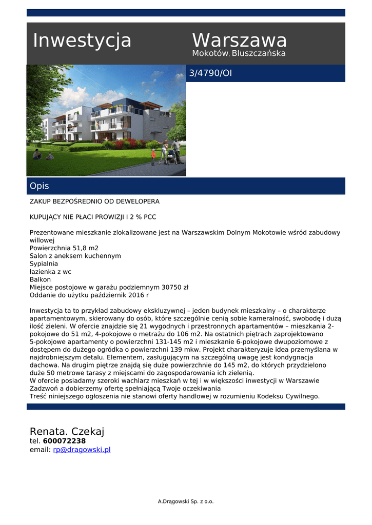 Inwestycja Warszawa Mokotów Bluszczańska , 3/4790/OI Opis ZAKUP BEZPOŚREDNIO OD DEWELOPERA KUPUJĄCY NIE PŁACI PROWIZJI I 2 % PCC Prezentowane mieszkanie zlokalizowane jest na Warszawskim Dolnym Mokotowie wśród zabudowy willowej Powierzchnia 51,8 m2 Salon z aneksem kuchennym Sypialnia łazienka z wc Balkon Miejsce postojowe w garażu podziemnym 30750 zł Oddanie do użytku październik 2016 r Inwestycja ta to przykład zabudowy ekskluzywnej – jeden budynek mieszkalny – o charakterze apartamentowym, skierowany do osób, które szczególnie cenią sobie kameralność, swobodę i dużą ilość zieleni. W ofercie znajdzie się 21 wygodnych i przestronnych apartamentów – mieszkania 2pokojowe do 51 m2, 4-pokojowe o metrażu do 106 m2. Na ostatnich piętrach zaprojektowano 5-pokojowe apartamenty o powierzchni 131-145 m2 i mieszkanie 6-pokojowe dwupoziomowe z dostępem do dużego ogródka o powierzchni 139 mkw. Projekt charakteryzuje idea przemyślana w najdrobniejszym detalu. Elementem, zasługującym na szczególną uwagę jest kondygnacja dachowa. Na drugim piętrze znajdą się duże powierzchnie do 145 m2, do których przydzielono duże 50 metrowe tarasy z miejscami do zagospodarowania ich zielenią. W ofercie posiadamy szeroki wachlarz mieszkań w tej i w większości inwestycji w Warszawie Zadzwoń a dobierzemy ofertę spełniającą Twoje oczekiwania Treść niniejszego ogłoszenia nie stanowi oferty handlowej w rozumieniu Kodeksu Cywilnego. Renata. Czekaj tel. 600072238 email: [email protected] A.Drągowski Sp. z o.o. Powered by TCPDF (www.tcpdf.org)