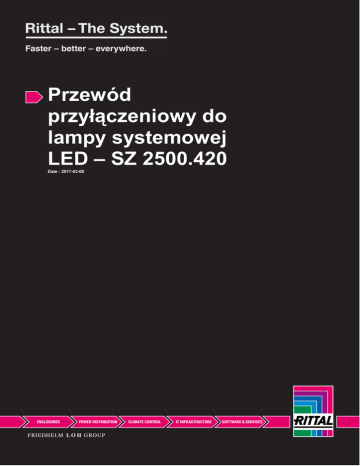Przewód przyłączeniowy do lampy systemowej LED – SZ 2500.420 Date : 2017-03-08 Przewód przyłączeniowy do lampy systemowej LED – SZ 2500.420 created: 08.03.2017 on www.rittal.com/pl-pl Opis produktu Opis: Do szybkiego i łatwego podłączenia lampy systemowej LED. Kolor: Pomarańczowy Cechy produktu Wersja: Zasilanie, 2-bieg. (z gniazdkiem, bez wtyku) Wymiary: Długość: 3000 mm Napięcie znamionowe robocze: 100 V - 240 V, 1~, 50 Hz/60 Hz Jednostka opakowania: 5 szt. EAN: 4028177809116 Numer taryfy celnej: 85444290 ETIM 6.0: EC001576 ETIM 5.0: EC001576 eCl@ss 8.0/8.1: 27060402 © Rittal 2017 1 eCl@ss 7.0/7.1: 27119116 eCl@ss 6.0/6.1: 27119116 eCl@ss 5.1/5.1.4: 27189241 2017 © Rittal Sp. z o o. © Rittal 2017 2