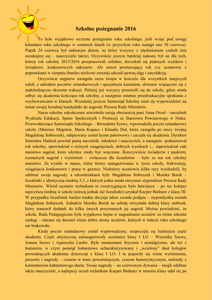 Szkolne pożegnanie 2016 To było wyjątkowo wczesne pożegnanie roku szkolnego, jeśli wziąć pod uwagę kalendarz roku szkolnego w ostatnich latach (w przyszłym roku nastąpi ono 30 czerwca). Piątek 24 czerwca był radosnym dniem, na który wszyscy z utęsknieniem czekali (nie oszukujmy się – nauczyciele także). Oczywiście jeszcze bardziej radosny był on dla tych, którzy rok szkolny 2015/2016 przepracowali solidnie, doczekali się pięknych wyników i świadectw, konkursowych sukcesów. Ale nawet powtarzający rok czy uczniowie z poprawkami w sierpniu (bardzo nieliczni zresztą) odczuli pewną ulgę i satysfakcję. Oczywiście najpierw nastąpiła msza święta w kościele dla wszystkich tutejszych szkół, z udziałem pocztów sztandarowych i specjalnym kazaniem, słowami wiążącymi się z nadchodzącym okresem wakacji. Później już wszyscy przenieśli się do szkoły, gdzie miała odbyć się akademia kończąca rok szkolny, a następnie ostatnie przedwakacyjne spotkania z wychowawcami w klasach. Wcześniej jeszcze Samorząd Szkolny miał się wypowiedzieć na temat swojej licealnej kandydatki do nagrody Prezesa Rady Ministrów. Nasze szkolne zakończenie uświetniła swoją obecnością pani Anna Orzoł – naczelnik Wydziału Edukacji, Spraw Społecznych i Promocji ze Starostwa Powiatowego w Nisku. Przewodnicząca Samorządu Szkolnego – Bernadetta Szewc, wprowadziła poczet sztandarowy szkoły (Mateusz Magolon, Marta Kopacz i Klaudia Dul, która zastąpiła po mszy świętej Magdalenę Sobieszek), odśpiewany został hymn państwowy i zaczęła się akademia. Dyrektor Stanisław Haduch powitał panią naczelnik, młodzież i nauczycieli, a następnie podsumował rok szkolny, opowiedział o różnych osiągnięciach, dobrych wynikach i... zapowiedział całe mnóstwo nagród, które wkrótce miały być wręczone. Rzeczywiście świadectw z paskiem, rozmaitych nagród i wyróżnień – zwłaszcza dla licealistów – było za ten rok szkolny mnóstwo. Za wyniki w nauce, różne formy zaangażowania w życie szkoły, frekwencję, osiągnięcia konkursowe i pracę w gazetce. Niektórzy uczniowie kilka razy wychodzili, by odebrać swoje nagrody, a rekordzistkami były Magdalena Sobieszek i Monika Borek – licealistki z identyczną średnią 5,3, z których jedna miała otrzymać stypendium Prezesa Rady Ministrów. Wśród uczniów technikum to rozstrzygnięcie było łatwiejsze – po raz kolejny najwyższą średnią w szkole (niższą jednak niż licealistki) uzyskał Kacper Bednarz z klasy III. W przypadku licealistek bardzo trudna decyzja także została podjęta – stypendystką została Magdalena Sobieszek. Jednakże Monika Borek na osłodę otrzymała dobrej klasy netbook, który stanowił dodatek do kilku innych przyznanych jej nagród. Można powiedzieć, że szkoła, Rada Pedagogiczna była wyjątkowa hojna w nagradzaniu uczniów za różne szkolne zasługi – starano się docenić różne dobre strony uczniów, których w trakcie roku szkolnego nie brakowało. Kiedy poczet sztandarowy został wyprowadzony, rozpoczęła się luźniejsza część akademii. Część artystyczną zainaugurowały uczennice klasy I LO – Weronika Szewc, Joanna Szewc i Agnieszka Laufer. Było momentami lirycznie i nostalgicznie, ale też z humorem, w czym pomógł kabaretowo ucharakteryzowany i „wcielony” duet kolegów prowadzących akademię dziewcząt z klasy I LO. I tu pojawiły się różne wyróżnienia, prezenty i nagrody – czasem w tonie poważniejszym, czasem humorystycznym, niekiedy z komentarzem kabaretowego duetu. Swoje nagrody – na czerwonym dywanie – mogli odebrać także nauczyciele, a najlepszy uczeń technikum Kacper Bednarz w imieniu klasy udał się po „antylaur” dla... najgorzej uczącej się klasy w szkole. Dawid Furtak chyba zabiegał o wyższą ocenę z matematyki i fizyki, bo humorystycznie przerobił „Pana Tadeusza”, nawiązując do profesora Jacka Chudzika niczym do Jacka Soplicy z epopei Mickiewicza. W dobrych nastrojach w ten prawie już wakacyjny dzień uczniowie poszczególnych klas udali się jeszcze na spotkania z wychowawcami, odebrali pozostałe świadectwa i dobre życzenia na czas wakacji, które dopełniły te wypowiedziane ze sceny przez dyrektora Stanisława Haducha. Wszyscy pożegnali się na okres wakacji, licząc, że spotkają się w komplecie (z poprawkowiczami włącznie) i będą mieli okazję poznać we wrześniu nowych kolegów, w tym dziewczyny (może nie tylko?) na nowym kierunku kosmetycznym technikum. Ryszard Mścisz