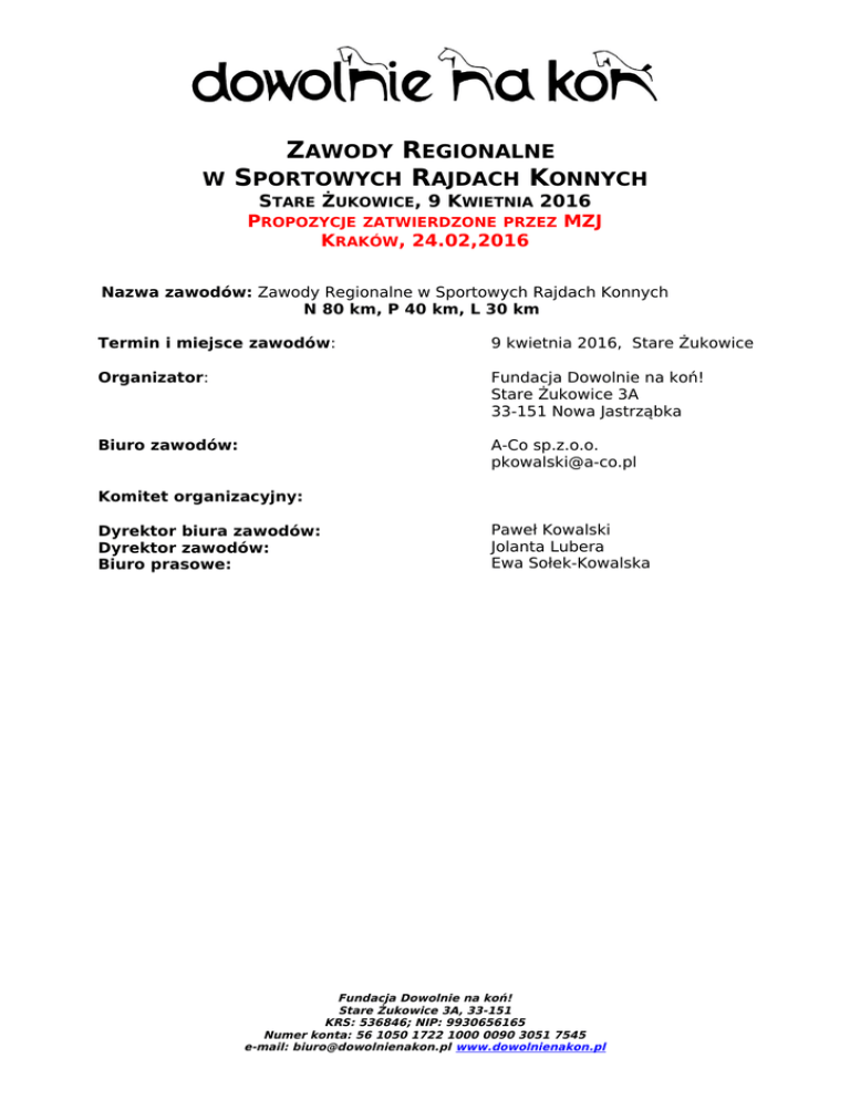 ZAWODY REGIONALNE W SPORTOWYCH RAJDACH KONNYCH STARE ŻUKOWICE, 9 KWIETNIA 2016 PROPOZYCJE ZATWIERDZONE PRZEZ MZJ KRAKÓW, 24.02,2016 Nazwa zawodów: Zawody Regionalne w Sportowych Rajdach Konnych N 80 km, P 40 km, L 30 km Termin i miejsce zawodów: 9 kwietnia 2016, Stare Żukowice Organizator: Fundacja Dowolnie na koń! Stare Żukowice 3A 33-151 Nowa Jastrząbka Biuro zawodów: A-Co sp.z.o.o. [email protected] Komitet organizacyjny: Dyrektor biura zawodów: Dyrektor zawodów: Biuro prasowe: Paweł Kowalski Jolanta Lubera Ewa Sołek-Kowalska Fundacja Dowolnie na koń! Stare Żukowice 3A, 33-151 KRS: 536846; NIP: 9930656165 Numer konta: 56 1050 1722 1000 0090 3051 7545 e-mail: [email protected] www.dowolnienakon.pl PRZEPISY OGÓLNE Zawody odbywają się w oparciu o obowiązujące przepisy i regulaminy PZJ oraz według niniejszych propozycji. OSOBY OFICJALNE - Zawody Regionalne Komisja sędziowska Sędzia Główny Komisja sędziowska Gospodarz toru Komisja weterynaryjna Przewodniczący Lekarz weterynarii zawodów Zabezpieczenie medyczne zawodów i lekarz dla zawodników Serwis kowalski Grażyna Kańka Anna Hadala Eulalia Michalik Paweł Kowalski Jacek Kańka Marek Tischner Paweł Szpar Marek Tischner Mariusz Czyżycki Tomasz Kowal Fundacja Dowolnie na koń! Stare Żukowice 3A, 33-151 KRS: 536846; NIP: 9930656165 Numer konta: 56 1050 1722 1000 0090 3051 7545 e-mail: [email protected] www.dowolnienakon.pl PROGRAM ZAWODÓW Sobota 9.04.2016 Godzina 7.00 – przegląd weterynaryjny Godzina 7.30 – odprawa techniczna Konkurs Dzień startu Przewidywana Godzina Startu Miejsce zawodów ZR N 80 km 9.04.2016 8.00 Stare Żukowice ZR P 40 km 9.04.2016 9.00 Stare Żukowice ZR L 30 km 9.04.2016 9.30 Stare Żukowice Godziny rozpoczęcia konkursów mogą zostać zmienione na odprawie technicznej. Zakończenie zawodów i uroczyste ogłoszenie wyników godz. 16:30 INFORMACJA O TRASIE Opis trasy: zawody rozgrywane będą na terenach Płaskowyżu Tarnowskiego. Start i meta: Stare Żukowice, obok ośrodka Ranczo Palomino. Trasa przebiega terenem nizinnym, częściowo zalesionym Podłoże - drogi leśne, polne, piaszczyste, dłuższe odcinki dróg bitych, utwardzonych, szutrowych, odcinki asfaltu. Różnica wzniesień: 5-30 metrów. Dwie pętle o długości 10 km i 20 km. Mapa dostępna będzie na stronie internetowej www.dowolnienakon.pl ŚWIADCZENIA Zakwaterowanie: zakwaterowania: Noclegi proszę rezerwować indywidualnie. Możliwe miejsca Gospodarstwo Agroturystyczne " Jaś i Małgosia" Stare Żukowice 3, 33 - 151 Nowa Jastrząbka, tel. +48 14 678 68 24 Ranczo Palomino, Stare Żukowice 3A, 33-151 Nowa Jastrząbka, tel. +48 602491343 Roleski Ranch, Stare Żukowice 1A, 33-151 Nowa Jastrząbka, tel. +48 14 678 67 00 Hotel „Tarnovia”, ul. Kościuszki, Tarnów tel. 14 630 03 50 Hotel Wesoła, Nowa Jastrząbka 92A, 33-151 Nowa Jastrząbka, tel. 14 678 62 14 Organizator zapewnia drobny poczęstunek. Możliwe wyżywienie we własnym zakresie na terenie ośrodka Roleski Ranch. Fundacja Dowolnie na koń! Stare Żukowice 3A, 33-151 KRS: 536846; NIP: 9930656165 Numer konta: 56 1050 1722 1000 0090 3051 7545 e-mail: [email protected] www.dowolnienakon.pl Możliwość przyjazdu 8 kwietnia 2016. Boksy dostępnie w ośrodku Roleski Ranch. W zgłoszeniu proszę wpisać informację o rezerwacji boksów. Opłata za boks: 100 zł/doba Ilość boksów ograniczona. Decyduje kolejność zgłoszeń. ZGŁOSZENIA WAŻNE!!! Zgłoszenia przyjmowane są wyłącznie drogą elektroniczną. Formularz zgłoszeniowy dostępny jest na stronie www.dowolnienakon.pl Zgłoszenia muszą zawierać komplet informacji dotyczących zawodnika, konia i niezbędnych kwalifikacji do danych konkursów. Zgłoszenia niekompletne lub zgłoszone inną drogą nie będą przyjmowane. Elektroniczne formularze zgłoszeń zostaną uruchomione 10.03.2016. Zgłoszenia przyjmowane wyłącznie do 7.04.2016 Opłaty: Opłata startowa: 100 zł plus 5zł od każdej pary startujace w zawodach regionalnych na Fundusz Nagród 2016 (zgodnie z uchwałą 23/01/2014 Zarządu Małopolskiego Związku Jeździeckiego) Za potwierdzone Organizator uznaje wyłącznie zgłoszenie wraz z wpłatą na konto Fundacji w wysokości 50 zł (50% całości opłaty startowej) w terminie do 7.04.2016. Fundacja Dowolnie na koń! Stare Żukowice 3A, 33-151 KRS: 536846; NIP: 9930656165 Numer konta: 56 1050 1722 1000 0090 3051 7545 • Potwierdzenie wpłaty zawodnik musi posiadać podczas rejestracji na zawodach odbierając numer startowy. Telefon kontaktowy: 602 491 343, 601 822 454 WARUNKI TECHNICZNE Obowiązuje dokumentacja dla zawodników i koni zgodna z przepisami PZJ w dyscyplinie sportowe rajdy konne oraz przepisami ogólnymi PZJ. W przypadku braku dokumentacji jeźdźca lub konia para ta może zostać niedopuszczona do zawodów. WAŻNE !!!: Niezwłocznie po przybyciu na miejsce zawodów zawodnicy zobowiązani są do zarejestrowania się w Biurze Zawodów, mieszczącym się przy bramce weterynaryjnej, dopełniając wszystkich niezbędnych formalności (przekazanie dokumentów, dokonanie płatności pozostałych 50 zł wpisowego za udział w zawodach). Po dokonaniu ostatecznej rejestracji w Biurze Zawodów zawodnicy otrzymają numery startowe. Osoby, które nie dopełnią ww. formalności nie zostaną dopuszczone do przeglądu weterynaryjnego. Fundacja Dowolnie na koń! Stare Żukowice 3A, 33-151 KRS: 536846; NIP: 9930656165 Numer konta: 56 1050 1722 1000 0090 3051 7545 e-mail: [email protected] www.dowolnienakon.pl W czasie rajdu i treningów przed zawodami zawodnika obowiązuje twarde nakrycie głowy. Zawodnicy startujący w zawodach krajowych muszą posiadać dokumenty zgodne z przepisami PZJ lub WZJ. Szczepienia ochronne przeciwko grypie koni. Obowiązuje następujący schemat szczepień: a. szczepienie podstawowe: pierwsze szczepienie – w dniu rozpoczęcia szczepień drugie szczepienie – nie wcześniej niż 21-go dnia i nie później niż 92 dnia od pierwszego szczepienia. b. szczepie