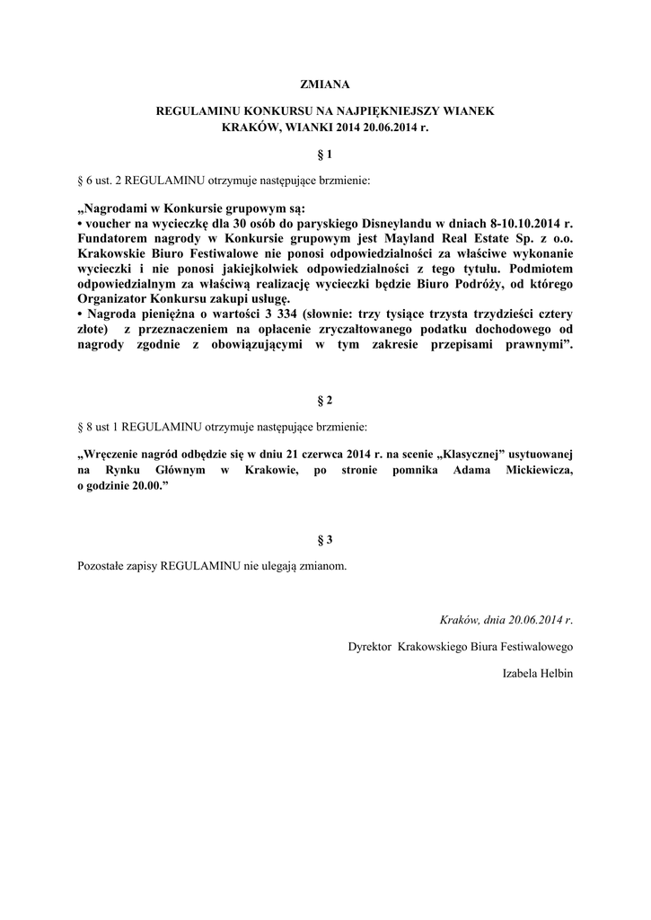 ZMIANA REGULAMINU KONKURSU NA NAJPIĘKNIEJSZY WIANEK KRAKÓW, WIANKI 2014 20.06.2014 r. §1 § 6 ust. 2 REGULAMINU otrzymuje następujące brzmienie: „Nagrodami w Konkursie grupowym są: • voucher na wycieczkę dla 30 osób do paryskiego Disneylandu w dniach 8-10.10.2014 r. Fundatorem nagrody w Konkursie grupowym jest Mayland Real Estate Sp. z o.o. Krakowskie Biuro Festiwalowe nie ponosi odpowiedzialności za właściwe wykonanie wycieczki i nie ponosi jakiejkolwiek odpowiedzialności z tego tytułu. Podmiotem odpowiedzialnym za właściwą realizację wycieczki będzie Biuro Podróży, od którego Organizator Konkursu zakupi usługę. • Nagroda pieniężna o wartości 3 334 (słownie: trzy tysiące trzysta trzydzieści cztery złote) z przeznaczeniem na opłacenie zryczałtowanego podatku dochodowego od nagrody zgodnie z obowiązującymi w tym zakresie przepisami prawnymi”. §2 § 8 ust 1 REGULAMINU otrzymuje następujące brzmienie: „Wręczenie nagród odbędzie się w dniu 21 czerwca 2014 r. na scenie „Klasycznej” usytuowanej na Rynku Głównym w Krakowie, po stronie pomnika Adama Mickiewicza, o godzinie 20.00.” §3 Pozostałe zapisy REGULAMINU nie ulegają zmianom. Kraków, dnia 20.06.2014 r. Dyrektor Krakowskiego Biura Festiwalowego Izabela Helbin