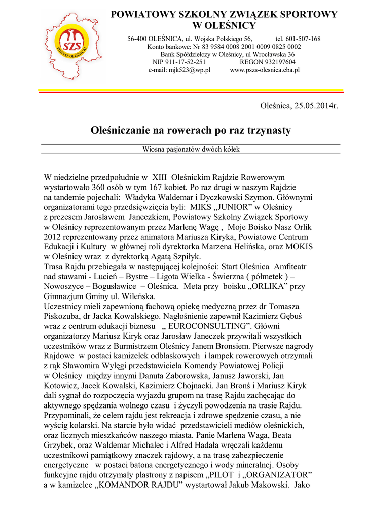POWIATOWY SZKOLNY ZWIĄZEK SPORTOWY W OLEŚNICY 56-400 OLEŚNICA, ul. Wojska Polskiego 56, tel. 601-507-168 Konto bankowe: Nr 83 9584 0008 2001 0009 0825 0002 Bank Spółdzielczy w Oleśnicy, ul Wrocławska 36 NIP 911-17-52-251 REGON 932197604 e-mail: [email protected] www.pszs-olesnica.cba.pl Oleśnica, 25.05.2014r. Oleśniczanie na rowerach po raz trzynasty Wiosna pasjonatów dwóch kółek W niedzielne przedpołudnie w XIII Oleśnickim Rajdzie Rowerowym wystartowało 360 osób w tym 167 kobiet. Po raz drugi w naszym Rajdzie na tandemie pojechali: Władyka Waldemar i Dyczkowski Szymon. Głównymi organizatorami tego przedsięwzięcia byli: MIKS „JUNIOR” w Oleśnicy z prezesem Jarosławem Janeczkiem, Powiatowy Szkolny Związek Sportowy w Oleśnicy reprezentowanym przez Marlenę Wagę , Moje Boisko Nasz Orlik 2012 reprezentowany przez animatora Mariusza Kiryka, Powiatowe Centrum Edukacji i Kultury w głównej roli dyrektorka Marzena Helińska, oraz MOKIS w Oleśnicy wraz z dyrektorką Agatą Szpiłyk. Trasa Rajdu przebiegała w następującej kolejności: Start Oleśnica Amfiteatr nad stawami - Lucień – Bystre – Ligota Wielka - Świerzna ( półmetek ) – Nowoszyce – Bogusławice – Oleśnica. Meta przy boisku „ORLIKA” przy Gimnazjum Gminy ul. Wileńska. Uczestnicy mieli zapewnioną fachową opiekę medyczną przez dr Tomasza Piskozuba, dr Jacka Kowalskiego. Nagłośnienie zapewnił Kazimierz Gębuś wraz z centrum edukacji biznesu „ EUROCONSULTING”. Główni organizatorzy Mariusz Kiryk oraz Jarosław Janeczek przywitali wszystkich uczestników wraz z Burmistrzem Oleśnicy Janem Bronsiem. Pierwsze nagrody Rajdowe w postaci kamizelek odblaskowych i lampek rowerowych otrzymali z rąk Sławomira Wylęgi przedstawiciela Komendy Powiatowej Policji w Oleśnicy między innymi Danuta Zaborowska, Janusz Jaworski, Jan Kotowicz, Jacek Kowalski, Kazimierz Chojnacki. Jan Bronś i Mariusz Kiryk dali sygnał do rozpoczęcia wyjazdu grupom na trasę Rajdu zachęcając do aktywnego spędzania wolnego czasu i życzyli powodzenia na trasie Rajdu. Przypominali, że celem rajdu jest rekreacja i zdrowe spędzenie czasu, a nie wyścig kolarski. Na starcie było widać przedstawicieli mediów oleśnickich, oraz licznych mieszkańców naszego miasta. Panie Marlena Waga, Beata Grzybek, oraz Waldemar Michalec i Alfred Hadała wręczali każdemu uczestnikowi pamiątkowy znaczek rajdowy, a na trasę zabezpieczenie energetyczne w postaci batona energetycznego i wody mineralnej. Osoby funkcyjne rajdu otrzymały plastrony z napisem „PILOT i „ORGANIZATOR” a w kamizelce „KOMANDOR RAJDU” wystartował Jakub Makowski. Jako pierwszy na motorze jechał nadkomisarz Sławomir Wylęga z Powiatowej Komendy Policji, który zabezpieczał całość trasy pod względem bezpieczeństwa razem z Maciejem Wylęgą, natomiast Janusz Bieniek jadąc Samochodem combi z napisem „koniec rajdu” zamykał cały peleton, który jednocześnie był zabezpieczeniem technicznym. Po pokonaniu części trasy, w miejscowości Świerzna w „Wietrznej Stajni” Eweliny Stróżyk odbyła się przerwa wypoczynkowa, podczas której wszyscy zostali poczęstowani kiełbasą z grilla przygotowaną przez właścicieli stajni. Na półmetku wręczono upominki, koszulki sportowe, talony do wykorzystania w American Pizza Express na Placu Zwycięstwa między innymi dla: Najstarszych uczestników: 1. 2. 3. 4. Marian Gwiżdż Kazimierz Chojnacki Stanisław Grabka Jan Kotowicz Najstarszych uczestniczek: 1. 2. 3. 4. Anna Klimkiewicz Anna Zaborowska Czesława Kucharska Leokadia Grabka Najmłodszych uczestników: 1. 2. 3. 4. Szymon Niedworak Jan Stankiewicz Tymoteusz Krall Miłosz Piniło Najmłodszych uczestniczek: 1. 2. 3. 4. Lena Żyto Ewa Garbaczewska Elzbieta Sztukowska Emilka Sokół Dodatkowa atrakcją dla najmłodszych był sprawnościowy wielozadaniowy tor przeszkód, nie liczył się wynik, nie czas lecz dobra zabawa i uczestnictwo. Każdy kto ukończył ten tor otrzymywał drobny upominek. Nad całością pieczę sprawowali Jarosław Janeczek i Mariusz Kiryk. Dodatkowo można było skorzystać z takich atrakcji jak: jazda konna, strzelanie z łuku i wiatrówki, z mini golfa oraz z dmuchanego zamku. Organizatorzy wręczali upominki i talony na pizzę najliczniejszym rodzinom biorącym udział w rajdzie: Trzaskom, Bidom, Kowakskim, Siedleckim, Helińskim, Grabkom, Chirowskim, Piskozubom, oraz Świerczynskim. Podsumowując, rajd został przeprowadzony zgodnie z jego założeniami . Uczestnicy imprezy byli bardzo zadowoleni i wyrazili chęć udziału w następnych edycjach Rajdu, głośno mówiono już o organizacji Rajdu w okresie jesiennym. Impreza była dofinansowana przez Urząd Miasta w Oleśnicy, Starostwo Powiatowe w Oleśnicy, Urząd Gminy Oleśnica oraz MOKiS w Oleśnicy i PCEiK w Oleśnicy. Fundatorami nagród Rajdu byli: Powiat Oleśnicki, Miasto Oleśnica, Gmina Oleśnica, MOKIS Oleśnica, PCEIK Oleśnica, YURECO Sp. Z o.o. Centrum Stomatologiczne dr Macieja Kozłowskiego, Firma Vobisnet, sklep rowerowy „Walbi” Janusza Bieńka ,hurtownia „Vimpel” w Sycowie, sklep chemiczny „Chemar”, sklep sportowy „Sport Edukator”, Pracownia Protetyczna Ludwika Marhefkäy, P.H.U. TWOJE HOBBY Floriana Pilarskiego, Intermarche w Oleśnicy, Firma Penny, SPORT STYL ANNA Anny i Andrzeja Zwierzyków, WKS „Oleśniczanka”, właściciel „American Pizza Express”. Patronem medialnym tego Rajdu była Panorama Oleśnicka Tygodnik „Oleśniczanin”, Moja Oleśnica, Oleśnicki Sport. Ponadto wielu uczestników rajdu otrzymało nagrody niespodzianki. Wszystkim uczestnikom, instytucjom, sponsorom, organizatorom i osobom pomagającym przy bezpiecznym przebiegu rajdu serdecznie – DZIĘKUJEMY. Szczególne podziękowania dla nadkomisarza Sławomira Wylęgi i Macieja Wylęgi z Powiatowej Komendy Policji w Oleśnicy za zapewnienie bezpieczeństwa na trasie rajdu, Serdecznie dziękujemy Januszowi Bieńkowi za pełnienie funkcji tec