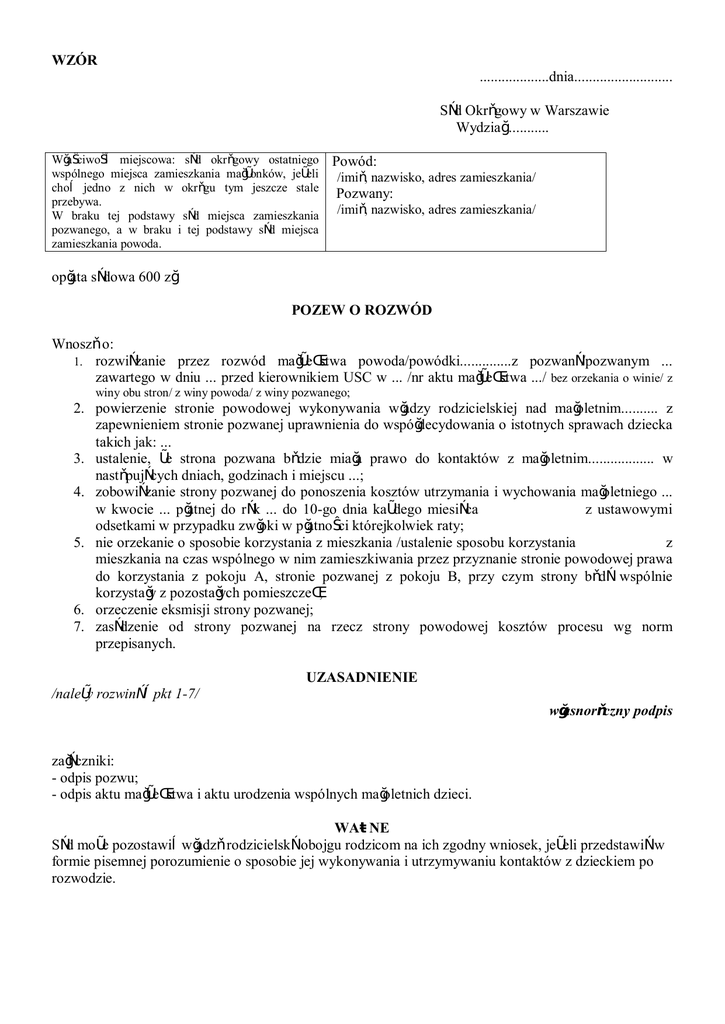 WZÓR ...................dnia........................... Sąd Okręgowy w Warszawie Wydział ........... Właściwość miejscowa: sąd okręgowy ostatniego Powód: wspólnego miejsca zamieszkania małżonków, jeżeli /imię, nazwisko, adres zamieszkania/ choć jedno z nich w okręgu tym jeszcze stale Pozwany: przebywa. W braku tej podstawy sąd miejsca zamieszkania /imię, nazwisko, adres zamieszkania/ ostat pozwanego, a w braku i tej podstawy sąd miejsca zamieszkania powoda. opłata sądowa 600 zł POZEW O ROZWÓD Wnoszę o: 1. rozwiązanie przez rozwód małżeństwa powoda/powódki..............z pozwaną/pozwanym ... zawartego w dniu ... przed kierownikiem USC w ... /nr aktu małżeństwa .../ bez orzekania o winie/ z winy obu stron/ z winy powoda/ z winy pozwanego; 2. powierzenie stronie powodowej wykonywania władzy rodzicielskiej nad małoletnim.......... z zapewnieniem stronie pozwanej uprawnienia do współdecydowania o istotnych sprawach dziecka takich jak: ... 3. ustalenie, że strona pozwana będzie miała prawo do kontaktów z małoletnim.................. w następujących dniach, godzinach i miejscu ...; 4. zobowiązanie strony pozwanej do ponoszenia kosztów utrzymania i wychowania małoletniego ... w kwocie ... płatnej do rąk ... do 10-go dnia każdego miesiąca z ustawowymi odsetkami w przypadku zwłoki w płatności którejkolwiek raty; 5. nie orzekanie o sposobie korzystania z mieszkania /ustalenie sposobu korzystania z mieszkania na czas wspólnego w nim zamieszkiwania przez przyznanie stronie powodowej prawa do korzystania z pokoju A, stronie pozwanej z pokoju B, przy czym strony będą wspólnie korzystały z pozostałych pomieszczeń; 6. orzeczenie eksmisji strony pozwanej; 7. zasądzenie od strony pozwanej na rzecz strony powodowej kosztów procesu wg norm przepisanych. UZASADNIENIE /należy rozwinąć pkt 1-7/ własnoręczny podpis załączniki: - odpis pozwu; - odpis aktu małżeństwa i aktu urodzenia wspólnych małoletnich dzieci. WAŻNE Sąd może pozostawić władzę rodzicielską obojgu rodzicom na ich zgodny wniosek, jeżeli przedstawią w formie pisemnej porozumienie o sposobie jej wykonywania i utrzymywaniu kontaktów z dzieckiem po rozwodzie.