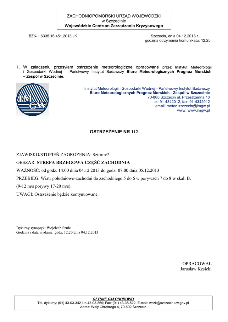 ZACHODNIOPOMORSKI URZĄD WOJEWÓDZKI w Szczecinie Wojewódzkie Centrum Zarządzania Kryzysowego BZK-II.6335.16.451.2013.JK Szczecin, dnia 04.12.2013 r. godzina otrzymania komunikatu: 12.25; 1. W załączeniu przesyłam ostrzeżenie meteorologiczne opracowane przez Instytut Meteorologii i Gospodarki Wodnej – Państwowy Instytut Badawczy Biuro Meteorologicznych Prognoz Morskich – Zespół w Szczecinie. Instytut Meteorologii i Gospodarki Wodnej - Państwowy Instytut Badawczy Biuro Meteorologicznych Prognoz Morskich - Zespół w Szczecinie 70-800 Szczecin ul. Przestrzenna 10 tel: 91-4342012, fax: 91-4342012 email: [email protected] www: www.imgw.pl OSTRZEŻENIE NR 112 ZJAWISKO/STOPIEŃ ZAGROŻENIA: Sztorm/2 OBSZAR: STREFA BRZEGOWA CZĘŚĆ ZACHODNIA WAŻNOŚĆ: od godz. 14:00 dnia 04.12.2013 do godz. 07:00 dnia 05.12.2013 PRZEBIEG: Wiatr południowo-zachodni do zachodniego 5 do 6 w porywach 7 do 8 w skali B. (9-12 m/s porywy 17-20 m/s). UWAGI: Ostrzeżenie będzie kontynuowane. Dyżurny synoptyk: Wojciech Szulc Godzina i data wydania: godz. 12:20 dnia 04.12.2013 OPRACOWAŁ Jarosław Kęsicki CZYNNE CAŁODOBOWO Tel. dyżurny: (91) 43-03-342 lub 43-03-360; Fax: (91) 43-38-522; E-mail: [email protected] Adres: Wały Chrobrego 4, 70-502 Szczecin