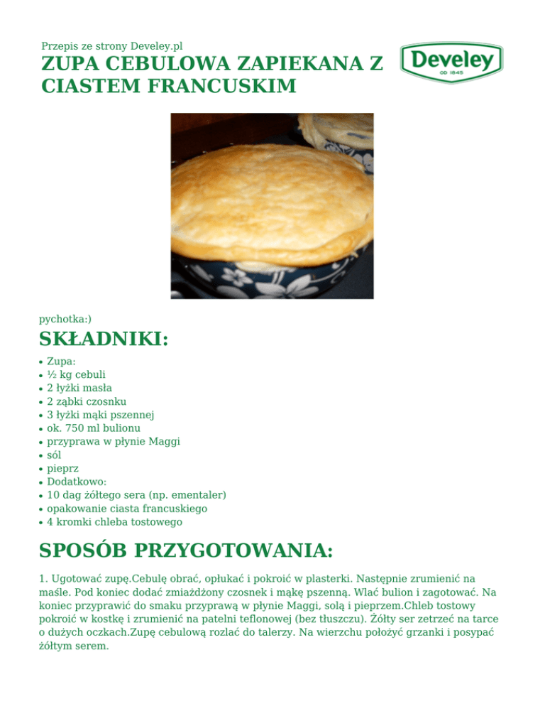 Przepis ze strony Develey.pl ZUPA CEBULOWA ZAPIEKANA Z CIASTEM FRANCUSKIM pychotka:) SKŁADNIKI: ● ● ● ● ● ● ● ● ● ● ● ● ● Zupa: ½ kg cebuli 2 łyżki masła 2 ząbki czosnku 3 łyżki mąki pszennej ok. 750 ml bulionu przyprawa w płynie Maggi sól pieprz Dodatkowo: 10 dag żółtego sera (np. ementaler) opakowanie ciasta francuskiego 4 kromki chleba tostowego SPOSÓB PRZYGOTOWANIA: 1. Ugotować zupę.Cebulę obrać, opłukać i pokroić w plasterki. Następnie zrumienić na maśle. Pod koniec dodać zmiażdżony czosnek i mąkę pszenną. Wlać bulion i zagotować. Na koniec przyprawić do smaku przyprawą w płynie Maggi, solą i pieprzem.Chleb tostowy pokroić w kostkę i zrumienić na patelni teflonowej (bez tłuszczu). Żółty ser zetrzeć na tarce o dużych oczkach.Zupę cebulową rozlać do talerzy. Na wierzchu położyć grzanki i posypać żółtym serem. 2. Przykryć talerze z zupą ciastem francuskim i zapiec w piekarniku ok. 20 minut do momentu zarumienienia cista francuskiego.