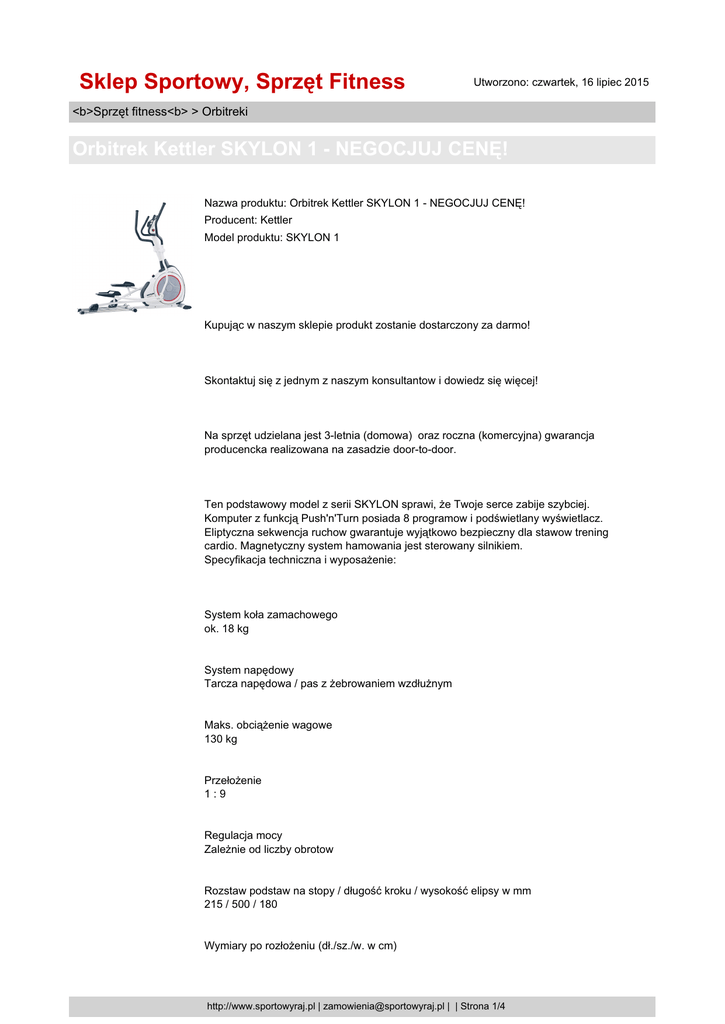 Sklep Sportowy, Sprzęt Fitness Utworzono: czwartek, 16 lipiec 2015 <b>Sprzęt fitness<b> > Orbitreki Orbitrek Kettler SKYLON 1 - NEGOCJUJ CENĘ! Nazwa produktu: Orbitrek Kettler SKYLON 1 - NEGOCJUJ CENĘ! Producent: Kettler Model produktu: SKYLON 1 Kupując w naszym sklepie produkt zostanie dostarczony za darmo! Skontaktuj się z jednym z naszym konsultantow i dowiedz się więcej! Na sprzęt udzielana jest 3-letnia (domowa) oraz roczna (komercyjna) gwarancja producencka realizowana na zasadzie door-to-door. Ten podstawowy model z serii SKYLON sprawi, że Twoje serce zabije szybciej. Komputer z funkcją Push'n'Turn posiada 8 programow i podświetlany wyświetlacz. Eliptyczna sekwencja ruchow gwarantuje wyjątkowo bezpieczny dla stawow trening cardio. Magnetyczny system hamowania jest sterowany silnikiem. Specyfikacja techniczna i wyposażenie: System koła zamachowego ok. 18 kg System napędowy Tarcza napędowa / pas z żebrowaniem wzdłużnym Maks. obciążenie wagowe 130 kg Przełożenie 1:9 Regulacja mocy Zależnie od liczby obrotow Rozstaw podstaw na stopy / długość kroku / wysokość elipsy w mm 215 / 500 / 180 Wymiary po rozłożeniu (dł./sz./w. w cm) http://www.sportowyraj.pl | [email protected] | | Strona 1/4 Sklep Sportowy, Sprzęt Fitness Utworzono: czwartek, 16 lipiec 2015 <b>Sprzęt fitness<b> > Orbitreki Orbitrek Kettler SKYLON 1 - NEGOCJUJ CENĘ! 193 / 66 / 172 Skala obciążenia 1 - 16 Zasilanie elektryczne Zasilanie sieciowe (230 V) Dodatkowy pałąk/uchwyt Kolor Jasnoszary Kołka transportowe Powierzchnia do stąpania Stabilna stopa plastikowa na płozie Wyrownanie wysokości Łożyskowane przeguby Kulkowe łożysko wahliwe w przegubach tarczowych, podwojne łożysko kulkowe Możliwość złożenia Waga urządzenia 76 kg Funkcje komputera: Wyświetlacz LCD LCD, podświetlenie Wyświetlacz graficzny Profil obciążenia http://www.sportowyraj.pl | [email protected] | | Strona 2/4 Sklep Sportowy, Sprzęt Fitness Utworzono: czwartek, 16 lipiec 2015 <b>Sprzęt fitness<b> > Orbitreki Orbitrek Kettler SKYLON 1 - NEGOCJUJ CENĘ! Wyświetlacz ciągły 7 funkcji Zużycie energii Tak (zależnie od stopnia hamowania) Dowolnie skalowane programy wydajnościowe 6 Gorna granica tętna Wyświetlanie procentowe oraz optyczny i akustyczny sygnał ostrzegawczy Kompatybilny z systemem POLAR odbiornik tętna, 5kHz, zintegrowany Liczba programow treningowych 8 Odporna na pot klawiatura foliowa Pomiar czasu, odcinek treningowy, odcinek całkowity, prędkość, kadencja Pomiar tętna Czujniki tętna w uchwytach, w zestawie klips na ucho, opcjonalnie pas na klatkę piersiową Pomiar tętna w fazie spoczynku z oceną sprawności Programy treningowe sterowane tętnem 1 Ręczne sterowanie obciążeniem Sterowanie parametrami Trening w strefie docelowej (FAT / FIT / MANUELL) http://www.sportowyraj.pl | [email protected] | | Strona 3/4 Sklep Sportowy, Sprzęt Fitness Utworzono: czwartek, 16 lipiec 2015 <b>Sprzęt fitness<b> > Orbitreki Orbitrek Kettler SKYLON 1 - NEGOCJUJ CENĘ! Wartości średnie na koniec treningu Cena: 3333.00zł Dostępność: Ten produkt został dodany do sklepu w dniu środa, 25 wrzesień 2013 http://www.sportowyraj.pl | [email protected] | | Strona 4/4