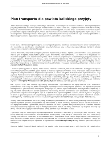 Starostwo Powiatowe w Kaliszu Plan transportu dla powiatu kaliskiego przyjęty „Plan zrównoważonego rozwoju publicznego transportu zbiorowego dla Powiatu Kaliskiego” został jednogłośnie przyjęty przez Radę Powiatu Kaliskiego na sesji w dniu 23 marca 2016 roku. Zaproponowano w nim trzy warianty. Pierwszy- skomunikowanie gmin powiatu kaliskiego z siedzibą gmin powiatu, drugi- skomunikowanie wiosek z gmin powiatu kaliskiego z siedzibami gmin , trzeci- jest rozwinięciem sieci komunikacyjnej o połączenia wykraczające poza obszar powiatu kaliskiego i miasta Kalisz. Jest to najbardziej rozbudowany wariant i do jego realizacji potrzebne są stosowne porozumienia z powiatami: ostrzeszowskim, sieradzkim i pleszewskim. Celem planu zrównoważonego transportu publicznego dla powiatu Kaliskiego jest zaplanowanie oferty transportu tak, aby spełniała ona oczekiwania mieszkańców powiatu kaliskiego przy zachowaniu odpowiedniego standardu jakości oraz wydajności systemu transportowego. -Jest to dokument, który jest wymagany prawem, wypełnienie go treścią będzie szalenie trudne. Coraz głośniej się mówi o tym, że będzie przesunięte wejście w życie dokumentu, który uchwalamy. Tak naprawdę w przyszłości ten dokument przyjdzie nam zrealizować wspólnie z tym tematem związana jest korespondencja jaką prowadzimy od dwóch tygodni z Prezydentem Kalisza, który zaoferował przekazanie PKS-u powiatowi kaliskiemu, więc my poprosiliśmy o więcej szczegółów. Jeśli będą znane, to przedstawiciele gmin spotkają się, jeśli mielibyśmy własną jednostkę transportową, to będzie to inna procedura jeśli chodzi o realizację transportu publicznego – mówił na sesji starosta kaliski Krzysztof Nosal. - Mam do planu pytanie o zapisy, które dziwią. Powiat kaliski nie planuje uruchamiania dublujących się linii komunikacyjnych zwłaszcza tam, gdzie będzie, to przewóz organizowało miasto Kalisz. W sytuacji, kiedy miasto Kalisz zorganizuje sieć przewozów do miejscowości Opatówek, a z okolic Szczytnik do mieszkańców będzie musiał już wójt zapłacić. Nam również w samorządach się pieniędzy nie przelewają. Jeśli wejdzie w życie plan transportowy, to obsługę poszczególnych linii będziemy uruchamiać na zasadzie przetargu. Czy Państwu jest znana kondycja firm przewozowych na ternie powiatu kaliskiego? Bo im nikt teraz nie dopłaca, a my z góry zakładamy, że będziemy dopłacać- mówił Jerzy Matuszewski wójt gminy Mycielin podczas sesji rady powiatu kaliskiego. Od 1 stycznia 2017 roku zmienią się przepisy transportowe i ulgi ustawowe nie będą ustalane przez wszystkich przewoźników. Nie każdy kto jeździ komercyjnie będzie sprzedawał bilety ulgowe, ponieważ nie będzie otrzymywał rekompensaty. Tylko operator, który będzie miał podpisaną umowę z powiatem będzie otrzymywał rekompensatę za ulgi. W planie transportu sieć została podzielona na warianty. Wariant podstawowy czyli połączenia komunikacyjne powiatu kaliskiego z siedzibami gmin, czyli to co powiat musi zapewnić zgodnie z ustawą. Powiat wyszedł z inicjatywą do Gmin co gwarantuje wariant uzupełniający. Zadaniem własnym gminy jest skomunikowanie wszystkich wiosek z siedzibą gminy. To znajduje się w wariancie uzupełniającym planu transportowego, który przyjęła Rada Powiatu. -Zapisy o współfinansowaniu linii przez gminy znalazły się, ponieważ te linie autobusowe prowadzące do miejscowości w poszczególnych gminach, mogą okazać się nierentowne. Z moich informacji wynikach, że jeśli nie będzie dopłat, to one będą nierentowne. Operatorem jest jeden podmiot lub kilku- w planie transportu nie jest to określone. Podczas konsultacji dużo uwag wpłynęło, żeby to PKS był operatorem. Jednak nie mamy informacji, czy przynosi dochody czy straty. Powiat uchwalając plan otwiera sobie furtkę, że może tego operatora wybrać. Zapis dotyczący linii dublujących się między powiatem, a miastem Kalisz dotyczy sytuacji jeśli jest możliwość, żeby gminy zawierały porozumienia z miastem Kalisz, wtedy gminy same płacą za kontynuację linii. Jeśli same gminy zawarły porozumienie z miastem, to nie ma konieczności, żeby powiat w tym samym miejscu puszczał konkurencyjną linię. Dokument pozwala wybrać operatora i ilość składek. Na każdym etapie może poddany być zmianom. I mogą być wprowadzane kolejne linie jeśli się okaże, że są rentowne- mówił Maciej Gabary z firmy Refunda opracowującej plan transportu. Starosta Kaliski Krzysztof Nosal stwierdził, że powiat czeka jeszcze wiele pracy, jeśli chodzi o jak najpełniejsze 1 Starostwo Powiatowe w Kaliszu zapewnienie potrzeb społecznych. Wójtowie poszczególnych gminy wnieśli jeszcze wiele uwag, ale każdy odkreślił, że to początek drogi nad organizacją transportu w powiecie kaliskim. Rada Powiatu Kaliskiego przyjęła jednogłośnie „Plan zrównoważonego rozwoju publicznego transportu zbiorowego dla Powiatu Kaliskiego”. Tekst/Foto: W.Przybylska 2
