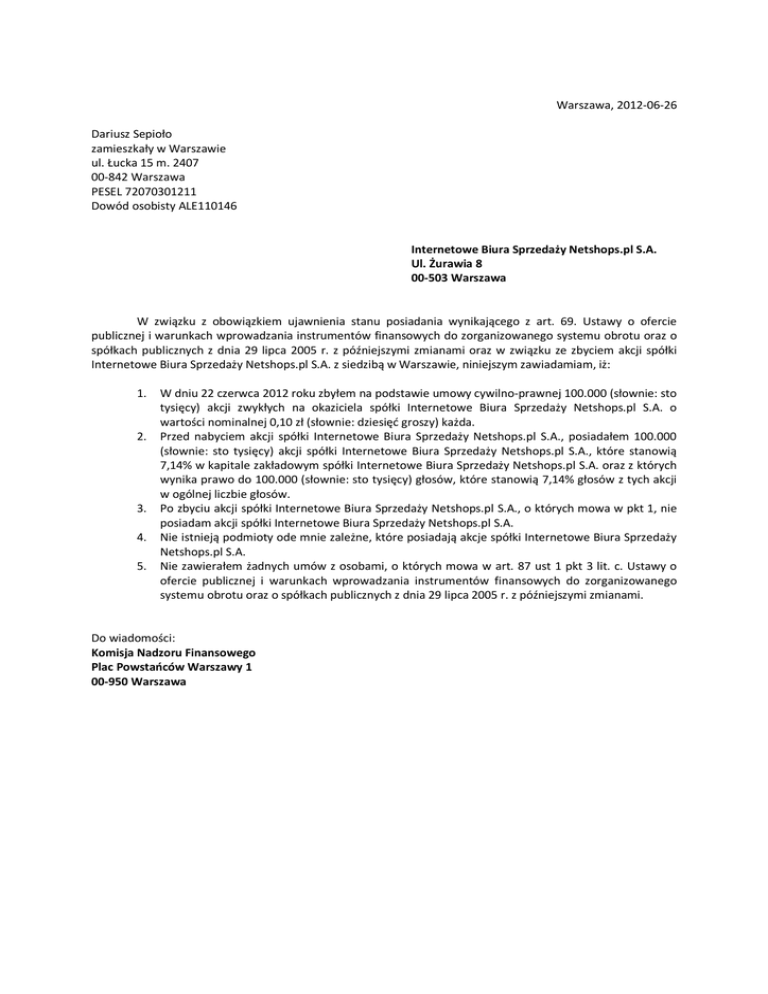 Warszawa, 2012-06-26 Dariusz Sepioło zamieszkały w Warszawie ul. Łucka 15 m. 2407 00-842 Warszawa PESEL 72070301211 Dowód osobisty ALE110146 Internetowe Biura Sprzedaży Netshops.pl S.A. Ul. Żurawia 8 00-503 Warszawa W związku z obowiązkiem ujawnienia stanu posiadania wynikającego z art. 69. Ustawy o ofercie publicznej i warunkach wprowadzania instrumentów finansowych do zorganizowanego systemu obrotu oraz o spółkach publicznych z dnia 29 lipca 2005 r. z późniejszymi zmianami oraz w związku ze zbyciem akcji spółki Internetowe Biura Sprzedaży Netshops.pl S.A. z siedzibą w Warszawie, niniejszym zawiadamiam, iż: 1. 2. 3. 4. 5. W dniu 22 czerwca 2012 roku zbyłem na podstawie umowy cywilno-prawnej 100.000 (słownie: sto tysięcy) akcji zwykłych na okaziciela spółki Internetowe Biura Sprzedaży Netshops.pl S.A. o wartości nominalnej 0,10 zł (słownie: dziesięć groszy) każda. Przed nabyciem akcji spółki Internetowe Biura Sprzedaży Netshops.pl S.A., posiadałem 100.000 (słownie: sto tysięcy) akcji spółki Internetowe Biura Sprzedaży Netshops.pl S.A., które stanowią 7,14% w kapitale zakładowym spółki Internetowe Biura Sprzedaży Netshops.pl S.A. oraz z których wynika prawo do 100.000 (słownie: sto tysięcy) głosów, które stanowią 7,14% głosów z tych akcji w ogólnej liczbie głosów. Po zbyciu akcji spółki Internetowe Biura Sprzedaży Netshops.pl S.A., o których mowa w pkt 1, nie posiadam akcji spółki Internetowe Biura Sprzedaży Netshops.pl S.A. Nie istnieją podmioty ode mnie zależne, które posiadają akcje spółki Internetowe Biura Sprzedaży Netshops.pl S.A. Nie zawierałem żadnych umów z osobami, o których mowa w art. 87 ust 1 pkt 3 lit. c. Ustawy o ofercie publicznej i warunkach wprowadzania instrumentów finansowych do zorganizowanego systemu obrotu oraz o spółkach publicznych z dnia 29 lipca 2005 r. z późniejszymi zmianami. Do wiadomości: Komisja Nadzoru Finansowego Plac Powstańców Warszawy 1 00-950 Warszawa