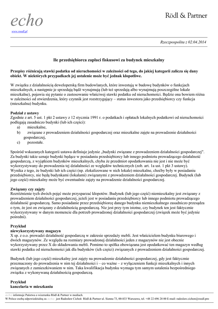 echo www.roedl.pl Rzeczpospolita z 02.04.2014 Ile przedsiębiorca zapłaci fiskusowi za budynek mieszkalny Przepisy różnicują stawki podatku od nieruchomości w zależności od tego, do jakiej kategorii zalicza się dany obiekt. W niektórych przypadkach jej ustalenie może być jednak kłopotliwe. W związku z działalnością deweloperską firm budowlanych, które inwestują w budowę budynków o funkcjach mieszkalnych, a następnie je sprzedają bądź wynajmują (lub też sprzedają albo wynajmują poszczególne lokale mieszkalne), pojawia się pytanie o zastosowanie właściwej stawki podatku od nieruchomości. Będzie ona bowiem różna w zależności od stwierdzenia, który czynnik jest rozstrzygający – status inwestora jako przedsiębiorcy czy funkcja (mieszkalna) budynku. Podział z ustawy Zgodnie z art. 5 ust. 1 pkt 2 ustawy z 12 stycznia 1991 r. o podatkach i opłatach lokalnych podatkowi od nieruchomości podlegają zasadniczo budynki (lub ich części): a) mieszkalne, b) związane z prowadzeniem działalności gospodarczej oraz mieszkalne zajęte na prowadzenie działalności gospodarczej, c) pozostałe. Spośród wskazanych kategorii ustawa definiuje jedynie „budynki związane z prowadzeniem działalności gospodarczej". Za budynki takie uznaje budynki będące w posiadaniu przedsiębiorcy lub innego podmiotu prowadzącego działalność gospodarczą, z wyjątkiem budynków mieszkalnych, chyba że przedmiot opodatkowania nie jest i nie może być wykorzystywany do prowadzenia tej działalności ze względów technicznych (zob. art. 1a ust. 1 pkt 3 ustawy). Wynika z tego, że budynki lub ich części (np. zlokalizowane w nich lokale) mieszkalne, choćby były w posiadaniu przedsiębiorcy, nie będą budynkami (lokalami) związanymi z prowadzeniem działalności gospodarczej. Budynek (lub jego część) mieszkalny może być ewentualnie zajęty na prowadzenie działalności gospodarczej. Związany czy zajęty Rozróżnienie tych dwóch pojęć może przysparzać kłopotów. Budynek (lub jego część) niemieszkalny jest związany z prowadzeniem działalności gospodarczej, jeżeli jest w posiadaniu przedsiębiorcy lub innego podmiotu prowadzącego działalność gospodarczą. Samo posiadanie przez przedsiębiorcę danego budynku niemieszkalnego zasadniczo przesądza o tym, że jest on związany z działalnością gospodarczą. Nie jest przy tym istotne, czy budynek ten jest faktycznie wykorzystywany w danym momencie dla potrzeb prowadzonej działalności gospodarczej (związek może być jedynie pośredni). Przykład niewykorzystywany magazyn X sp. z o.o. prowadzi działalność gospodarczą w zakresie sprzedaży mebli. Jest właścicielem budynku biurowego i dwóch magazynów. Ze względu na rozmiary prowadzonej działalności jeden z magazynów nie jest obecnie wykorzystywany przez X do składowania mebli. Pomimo to spółka obowiązana jest opodatkować ten magazyn według stawki podatku od nieruchomości jak dla budynków (ich części) związanych z prowadzeniem działalności gospodarczej. Budynek (lub jego część) mieszkalny jest zajęty na prowadzenie działalności gospodarczej, gdy jest faktycznie przeznaczony do prowadzenia w nim tej działalności i – co ważne – z wyłączeniem funkcji mieszkalnych i innych związanych z zamieszkiwaniem w nim. Taka kwalifikacja budynku wymaga tym samym ustalenia bezpośredniego związku z wykonywaną działalnością gospodarczą. Przykład kancelaria w mieszkaniu echo informuje Państwa o wizerunku Rödl & Partner w mediach. W Polsce osobą odpowiedzialną za echo jest Radosław Cichoń Rödl & Partner ul. Sienna 73, 00-833 Warszawa, tel. +48 22 696 28 00 E-mail: [email protected] Radca prawny Paweł Kowalski jest właścicielem lokalu mieszkalnego. W lokalu tym prowadzi również praktykę zawodową. Część lokalu, która zajmowana jest przez biurko i inne meble biurowe, komputer, drukarkę oraz dokumenty (archiwum), jest fizycznie wydzielona na prowadzenie działalności gospodarczej (nie jest wykorzystywana na potrzeby osobiste pana Pawła). Do tej części lokalu powinna zostać zastosowana stawka podatku od nieruchomości właściwa dla budynków (ich części) zajętych na prowadzenie działalności gospodarczej. Porównanie pojęć „związany" i „zajęty" wskazuje, że pojęcie „budynki (lub ich części) związane z prowadzeniem działalności gospodarczej" jest szersze od pojęcia „budynki (lub ich części) zajęte na prowadzenie działalności gospodarczej". Konieczna jest analiza Aby rozstrzygnąć, jaki jest charakter budynku i tym samym jaka jest właściwa stawka podatku od nieruchomości, trzeba przeprowadzić następującą analizę: krok 1: ustalenie, czy budynek jest mieszkalny czy niemieszkalny; krok 2: jeżeli budynek jest mieszkalny – ustalenie, czy jest zajęty na prowadzenie działalności gospodarczej; jeżeli budynek jest niemieszkalny – ustalenie, czy jest związany z prowadzeniem działalności gospodarczej. Decyduje funkcja Jeżeli budynek mieszkalny przeznaczony na sprzedaż jest własnością przedsiębiorcy (inwestora) i zlokalizowane w nim lokale są lokalami mieszkalnymi, to przedsiębiorca jest uprawniony do zastosowania stawki podatku od nieruchomości (dla całego budynku) jak dla mieszkalnego (tak również Naczelny Sąd Administracyjny w wyroku z 30 lipca 2013 r., II FSK 2012/11). Innymi słowy, rozstrzygający nie jest tu fakt bycia przedsiębiorcą, lecz funkcja mieszkalna budynku. Ma to istotne znaczenie, ponieważ pozwala na duże oszczędności podatkowe (por. stawki w tabeli). Na zmianę stawki mogłoby wpłynąć zajęcie (faktyczne) tego budynku (poszczególnych lokali) na prowadzenie działalności gospodarczej, o czym jest mowa niżej. Co w przypadku wynajmu Jeżeli inwestor wybuduje budynek o funkcjach mieszkalnych i budynek ten lub wyodrębnione w nim lokale mieszkalne przeznaczy na wynajem (pozostając tym samym, jako właściciel, podatnikiem podatk