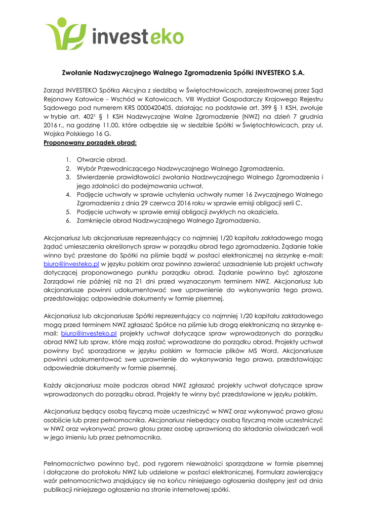 Zwołanie Nadzwyczajnego Walnego Zgromadzenia Spółki INVESTEKO S.A. Zarząd INVESTEKO Spółka Akcyjna z siedzibą w Świętochłowicach, zarejestrowanej przez Sąd Rejonowy Katowice - Wschód w Katowicach, VIII Wydział Gospodarczy Krajowego Rejestru Sądowego pod numerem KRS 0000420405, działając na podstawie art. 399 § 1 KSH, zwołuje w trybie art. 4021 § 1 KSH Nadzwyczajne Walne Zgromadzenie (NWZ) na dzień 7 grudnia 2016 r., na godzinę 11.00, które odbędzie się w siedzibie Spółki w Świętochłowicach, przy ul. Wojska Polskiego 16 G. Proponowany porządek obrad: 1. Otwarcie obrad. 2. Wybór Przewodniczącego Nadzwyczajnego Walnego Zgromadzenia. 3. Stwierdzenie prawidłowości zwołania Nadzwyczajnego Walnego Zgromadzenia i jego zdolności do podejmowania uchwał. 4. Podjęcie uchwały w sprawie uchylenia uchwały numer 16 Zwyczajnego Walnego Zgromadzenia z dnia 29 czerwca 2016 roku w sprawie emisji obligacji serii C. 5. Podjęcie uchwały w sprawie emisji obligacji zwykłych na okaziciela. 6. Zamknięcie obrad Nadzwyczajnego Walnego Zgromadzenia. Akcjonariusz lub akcjonariusze reprezentujący co najmniej 1/20 kapitału zakładowego mogą żądać umieszczenia określonych spraw w porządku obrad tego zgromadzenia. Żądanie takie winno być przesłane do Spółki na piśmie bądź w postaci elektronicznej na skrzynkę e-mail: [email protected] w języku polskim oraz powinno zawierać uzasadnienie lub projekt uchwały dotyczącej proponowanego punktu porządku obrad. Żądanie powinno być zgłoszone Zarządowi nie później niż na 21 dni przed wyznaczonym terminem NWZ. Akcjonariusz lub akcjonariusze powinni udokumentować swe uprawnienie do wykonywania tego prawa, przedstawiając odpowiednie dokumenty w formie pisemnej. Akcjonariusz lub akcjonariusze Spółki reprezentujący co najmniej 1/20 kapitału zakładowego mogą przed terminem NWZ zgłaszać Spółce na piśmie lub drogą elektroniczną na skrzynkę email: [email protected] projekty uchwał dotyczące spraw wprowadzonych do porządku obrad NWZ lub spraw, które mają zostać wprowadzone do porządku obrad. Projekty uchwał powinny być sporządzone w języku polskim w formacie plików MS Word. Akcjonariusze powinni udokumentować swe uprawnienie do wykonywania tego prawa, przedstawiając odpowiednie dokumenty w formie pisemnej. Każdy akcjonariusz może podczas obrad NWZ zgłaszać projekty uchwał dotyczące spraw wprowadzonych do porządku obrad. Projekty te winny być przedstawione w języku polskim. Akcjonariusz będący osobą fizyczną może uczestniczyć w NWZ oraz wykonywać prawo głosu osobiście lub przez pełnomocnika. Akcjonariusz niebędący osobą fizyczną może uczestniczyć w NWZ oraz wykonywać prawo głosu przez osobę uprawnioną do składania oświadczeń woli w jego imieniu lub przez pełnomocnika. Pełnomocnictwo powinno być, pod rygorem nieważności sporządzone w formie pisemnej i dołączone do protokołu NWZ lub udzielone w postaci elektronicznej. Formularz zawierający wzór pełnomocnictwa znajdujący się na końcu niniejszego ogłoszenia dostępny jest od dnia publikacji niniejszego ogłoszenia na stronie internetowej spółki. O udzieleniu pełnomocnictwa w postaci elektronicznej należy zawiadomić spółkę przy wykorzystaniu środków komunikacji elektronicznej w postaci informacji przesłanej pocztą elektroniczną na adres e-mail: [email protected] dokładając wszelkich starań, aby możliwa była skuteczna weryfikacja ważności pełnomocnictwa. Informacja o udzieleniu pełnomocnictwa powinna zawierać dokładne oznaczenie pełnomocnika i mocodawcy (ze wskazaniem imienia, nazwiska, numeru PESEL, adresu, telefonu i adresu poczty elektronicznej obu tych osób). Informacja o udzieleniu pełnomocnictwa powinna również zawierać jego zakres tj. wskazywać liczbę akcji, z których wykonywane będzie prawo głosu oraz datę i nazwę walnego zgromadzenia spółki, na którym prawa te będą wykonywane. Treść pełnomocnictwa powinna stanowić załącznik w formacie PDF do wiadomości e-mail. W wypadku udzielania pełnomocnictwa przez akcjonariusza niebędącego osobą fizyczną, konieczne jest dołączenie skanu w formacie PDF aktualnego odpisu z właściwego rejestru. Spółka podejmie odpowiednie działania służące identyfikacji akcjonariusza i pełnomocnika w celu weryfikacji ważności pełnomocnictwa udzielonego w postaci elektronicznej. Weryfikacja ta polegać może w szczególności na zwrotnym pytaniu w formie elektronicznej lub telefonicznej skierowanym do akcjonariusza i/lub pełnomocnika w celu potwierdzenia faktu udzielenia pełnomocnictwa i jego zakresu. Spółka zastrzega, że w takim przypadku brak udzielenia odpowiedzi na pytania zadawane w trakcie weryfikacji traktowany będzie jako brak możliwości weryfikacji udzielenia pełnomocnictwa i stanowił będzie podstawę dla odmowy dopuszczenia pełnomocnika do udziału w NWZ. Po przybyciu na NWZ a przed podpisaniem listy obecności pełnomocnik powinien okazać oryginał dokumentu tożsamości wymienionego w formularzu pełnomocnictwa celem potwierdzenia tożsamości pełnomocnika. Prawo do reprezentowania akcjonariusza niebędącego osobą fizyczną powinno wynikać z okazanego przy sporządzaniu listy obecności odpisu właściwego rejestru, ewentualnie ciągu pełnomocnictw. Osoba/osoby udzielające pełnomocnictwa w imieniu akcjonariusza niebędącego osobą fizyczną powinny być uwidocznione w aktualnym odpisie z właściwego dla danego akcjonariusza rejestru. Akcjonariusze i pełnomocnicy powinni posiadać przy sobie ważny dowód tożsamości. Członek Zarządu spółki i pracownik spółki mogą być pełnomocnikami akcjonariuszy na NWZ. Udzielenie dalszego pełnomocnictwa jest wyłączone. Spółka nie przewiduje możliwości uczestniczenia w NWZ przy wykorzystaniu środków komunikacji elektronicznej. Spółka nie przewiduje możliwości wypowiadania się w trakcie NWZ przy wykorzystaniu środkó