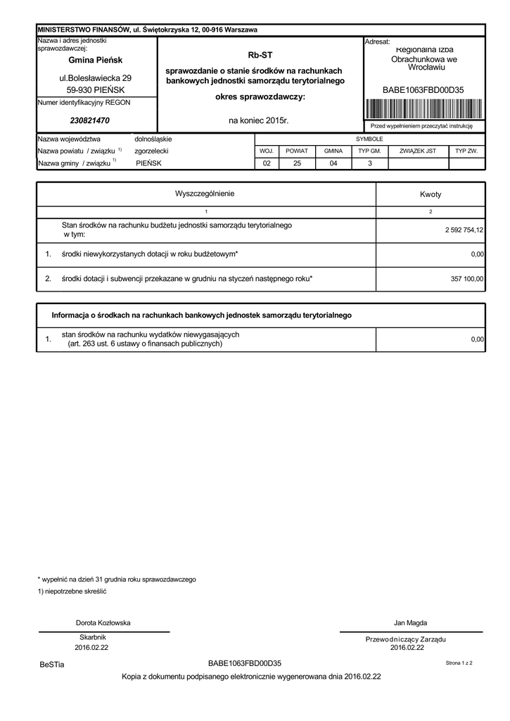 MINISTERSTWO FINANSÓW, ul. Świętokrzyska 12, 00-916 Warszawa Nazwa i adres jednostki sprawozdawczej: Rb-ST Gmina Pieńsk sprawozdanie o stanie środków na rachunkach bankowych jednostki samorządu terytorialnego ul.Bolesławiecka 29 59-930 PIEŃSK na koniec 2015r. 230821470 Nazwa powiatu / związku Nazwa gminy / związku dolnośląskie zgorzelecki 1) WOJ. PIEŃSK 1) 02 Regionalna Izba Obrachunkowa we Wrocławiu BABE1063FBD00D35 okres sprawozdawczy: Numer identyfikacyjny REGON Nazwa województwa Adresat: Przed wypełnieniem przeczytać instrukcję POWIAT 25 GMINA 04 SYMBOLE TYP GM. 3 ZWIĄZEK JST Wyszczególnienie Kwoty 1 2 Stan środków na rachunku budżetu jednostki samorządu terytorialnego w tym: 1. środki niewykorzystanych dotacji w roku budżetowym* 2. środki dotacji i subwencji przekazane w grudniu na styczeń następnego roku* TYP ZW. 2 592 754,12 0,00 357 100,00 Informacja o środkach na rachunkach bankowych jednostek samorządu terytorialnego 1. stan środków na rachunku wydatków niewygasających (art. 263 ust. 6 ustawy o finansach publicznych) 0,00 * wypełnić na dzień 31 grudnia roku sprawozdawczego 1) niepotrzebne skreślić Dorota Kozłowska BeSTia Skarbnik 2016.02.22 Jan Magda BABE1063FBD00D35 Przewo d n iczący Zarządu 2016.02.22 Kopia z dokumentu podpisanego elektronicznie wygenerowana dnia 2016.02.22 Strona 1 z 2 Wyjaśnienia do sprawozdania Rb-ST Dorota Kozłowska Jan Magda Skarbnik 2016.02.22 BeSTia Przewo d n iczący Zarządu BABE1063FBD00D35 Kopia z dokumentu podpisanego elektronicznie wygenerowana dnia 2016.02.22 2016.02.22 Strona 2 z 2