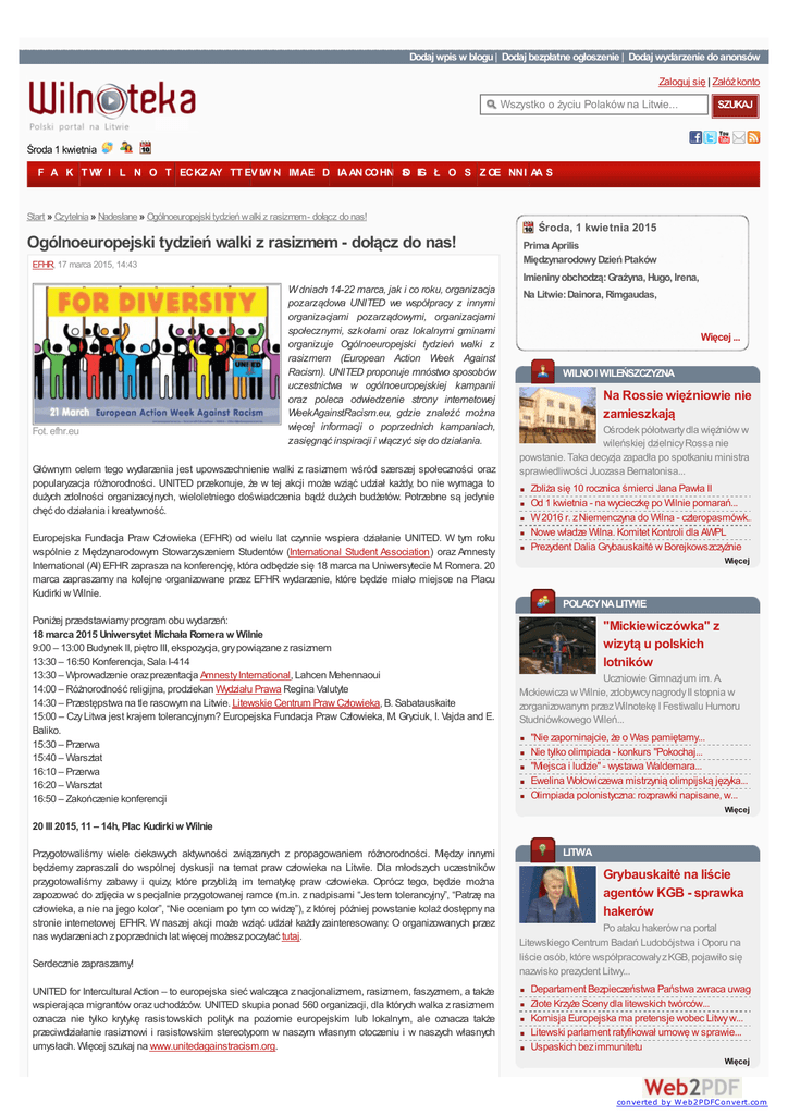 Dodaj wpis w blogu | Dodaj bezpłatne ogłoszenie | Dodaj wydarzenie do anonsów Zaloguj się | Załóż konto Wszystko o życiu Polaków na Litwie... SZUKAJ Środa 1 kwietnia F A K T WY I L N O T EC KZ AY TT EV LW N IM AE D IA AN CO HN S O EG Ł O S Z OE NN I AA S Start » Czytelnia » Nadesłane » Ogólnoeuropejski tydzień walki z rasizmem - dołącz do nas! Środa, 1 kwietnia 2015 Ogólnoeuropejski tydzień walki z rasizmem - dołącz do nas! EFHR, 17 marca 2015, 14:43 Prima Aprilis Międzynarodowy Dzień Ptaków Imieniny obchodzą: Grażyna, Hugo, Irena, Fot. efhr.eu W dniach 14-22 marca, jak i co roku, organizacja pozarządowa UNITED we współpracy z innymi organizacjami pozarządowymi, organizacjami społecznymi, szkołami oraz lokalnymi gminami organizuje Ogólnoeuropejski tydzień walki z rasizmem (European Action Week Against Racism). UNITED proponuje mnóstwo sposobów uczestnictwa w ogólnoeuropejskiej kampanii oraz poleca odwiedzenie strony internetowej WeekAgainstRacism.eu, gdzie znaleźć można więcej informacji o poprzednich kampaniach, zasięgnąć inspiracji i włączyć się do działania. Głównym celem tego wydarzenia jest upowszechnienie walki z rasizmem wśród szerszej społeczności oraz popularyzacja różnorodności. UNITED przekonuje, że w tej akcji może wziąć udział każdy, bo nie wymaga to dużych zdolności organizacyjnych, wieloletniego doświadczenia bądź dużych budżetów. Potrzebne są jedynie chęć do działania i kreatywność. Europejska Fundacja Praw Człowieka (EFHR) od wielu lat czynnie wspiera działanie UNITED. W tym roku wspólnie z Międzynarodowym Stowarzyszeniem Studentów (International Student Association) oraz Amnesty International (AI) EFHR zaprasza na konferencję, która odbędzie się 18 marca na Uniwersytecie M. Romera. 20 marca zapraszamy na kolejne organizowane przez EFHR wydarzenie, które będzie miało miejsce na Placu Kudirki w Wilnie. Na Litwie: Dainora, Rimgaudas, Więcej ... WILNO I WILEŃSZCZYZNA Na Rossie więźniowie nie zamieszkają Ośrodek półotwarty dla więźniów w wileńskiej dzielnicy Rossa nie powstanie. Taka decyzja zapadła po spotkaniu ministra sprawiedliwości Juozasa Bernatonisa... Zbliża się 10 rocznica śmierci Jana Pawła II Od 1 kwietnia - na wycieczkę po Wilnie pomarań... W 2016 r. z Niemenczyna do Wilna - czteropasmówk... Nowe władze Wilna. Komitet Kontroli dla AWPL Prezydent Dalia Grybauskaitė w Borejkowszczyźnie Więcej POLACY NA LITWIE Poniżej przedstawiamy program obu wydarzeń: 18 marca 2015 Uniwersytet Michała Romera w Wilnie 9:00 – 13:00 Budynek II, piętro III, ekspozycja, gry powiązane z rasizmem 13:30 – 16:50 Konferencja, Sala I-414 13:30 – Wprowadzenie oraz prezentacja Amnesty International, Lahcen Mehennaoui 14:00 – Różnorodność religijna, prodziekan Wydziału Prawa Regina Valutyte 14:30 – Przestępstwa na tle rasowym na Litwie. Litewskie Centrum Praw Człowieka, B. Sabatauskaite 15:00 – Czy Litwa jest krajem tolerancyjnym? Europejska Fundacja Praw Człowieka, M. Gryciuk, I. Vajda and E. Baliko. 15:30 – Przerwa 15:40 – Warsztat 16:10 – Przerwa 16:20 – Warsztat 16:50 – Zakończenie konferencji "Mickiewiczówka" z wizytą u polskich lotników Uczniowie Gimnazjum im. A. Mickiewicza w Wilnie, zdobywcy nagrody II stopnia w zorganizowanym przez Wilnotekę I Festiwalu Humoru Studniówkowego Wileń... "Nie zapominajcie, że o Was pamiętamy... Nie tylko olimpiada - konkurs "Pokochaj... "Miejsca i ludzie" - wystawa Waldemara... Ewelina Wołowiczewa mistrzynią olimpijską języka... Olimpiada polonistyczna: rozprawki napisane, w... Więcej 20 III 2015, 11 – 14h, Plac Kudirki w Wilnie Przygotowaliśmy wiele ciekawych aktywności związanych z propagowaniem różnorodności. Między innymi będziemy zapraszali do wspólnej dyskusji na temat praw człowieka na Litwie. Dla młodszych uczestników przygotowaliśmy zabawy i quizy, które przybliżą im tematykę praw człowieka. Oprócz tego, będzie można zapozować do zdjęcia w specjalnie przygotowanej ramce (m.in. z nadpisami “Jestem tolerancyjny”, “Patrzę na człowieka, a nie na jego kolor”, “Nie oceniam po tym co widzę”), z której później powstanie kolaż dostępny na stronie internetowej EFHR. W naszej akcji może wziąć udział każdy zainteresowany. O organizowanych przez nas wydarzeniach z poprzednich lat więcej możesz poczytać tutaj. Serdecznie zapraszamy! UNITED for Intercultural Action – to europejska sieć walcząca z nacjonalizmem, rasizmem, faszyzmem, a także wspierająca migrantów oraz uchodźców. UNITED skupia ponad 560 organizacji, dla których walka z rasizmem oznacza nie tylko krytykę rasistowskich polityk na poziomie europejskim lub lokalnym, ale oznacza także przeciwdziałanie rasizmowi i rasistowskim stereotypom w naszym własnym otoczeniu i w naszych własnych umysłach. Więcej szukaj na www.unitedagainstracism.org. LITWA Grybauskaitė na liście agentów KGB - sprawka hakerów Po ataku hakerów na portal Litewskiego Centrum Badań Ludobójstwa i Oporu na liście osób, które współpracowały z KGB, pojawiło się nazwisko prezydent Litwy... Departament Bezpieczeństwa Państwa zwraca uwagę... Złote Krzyże Sceny dla litewskich twórców... Komisja Europejska ma pretensje wobec Litwy w... Litewski parlament ratyfikował umowę w sprawie... Uspaskich bez immunitetu Więcej converted by W eb2PDFConvert.com ---------------------------------------------------------------------------------------------------------------------Redakcja Wilnoteki nie ponosi odpowiedzialności za treści artykułów nadesłanych. Wyślij znajomemu Komentarze Dodaj nowy komentarz Nazwisko lub pseudonim: Anonim E-mail: ZA MIEDZĄ Z Wileńszczyzny na studia do Suwałk Matury coraz bliżej, a co dalej? Najlepiej oczywiście zacząć studia. Mimo że uczelni na Litwie nie brakuje, a na wielu kierunkach zaczyna brakować student... Orędzie Warlikowskiego na Międzynarodowy D