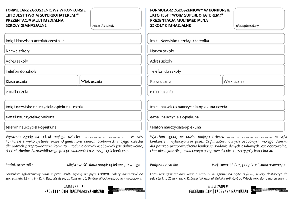 FORMULARZ ZGŁOSZENIOWY W KONKURSIE „KTO JEST TWOIM SUPERBOHATEREM?” PREZENTACJA MULTIMEDIALNA SZKOŁY GIMNAZJALNE pieczątka szkoły FORMULARZ ZGŁOSZENIOWY W KONKURSIE „KTO JEST TWOIM SUPERBOHATEREM?” PREZENTACJA MULTIMEDIALNA SZKOŁY GIMNAZJALNE Imię i Nazwisko ucznia/uczestnika Imię i Nazwisko ucznia/uczestnika Nazwa szkoły Nazwa szkoły Adres szkoły Adres szkoły Telefon do szkoły Telefon do szkoły Klasa ucznia Wiek ucznia Klasa ucznia pieczątka szkoły Wiek ucznia e-mail ucznia e-mail ucznia Imię i nazwisko nauczyciela-opiekuna ucznia Imię i nazwisko nauczyciela-opiekuna ucznia e-mail nauczyciela-opiekuna e-mail nauczyciela-opiekuna telefon nauczyciela-opiekuna telefon nauczyciela-opiekuna Wyrażam zgodę na udział mojego dziecka ……………………………… w w/w konkursie i wykorzystanie przez Organizatora danych osobowych mojego dziecka dla potrzeb przeprowadzenia konkursu. Podanie danych osobowych jest dobrowolne, choć niezbędne dla prawidłowego przeprowadzenia i rozstrzygnięcia konkursu. Wyrażam zgodę na udział mojego dziecka ……………………………… w w/w konkursie i wykorzystanie przez Organizatora danych osobowych mojego dziecka dla potrzeb przeprowadzenia konkursu. Podanie danych osobowych jest dobrowolne, choć niezbędne dla prawidłowego przeprowadzenia i rozstrzygnięcia konkursu. ……………………………… Podpis uczestnika ……………………………… Podpis uczestnika …………………… …………………………… Miejscowość i data; podpis opiekuna prawnego …………………… …………………………… Miejscowość i data; podpis opiekuna prawnego Formularz zgłoszeniowy wraz z prez. mult. zgraną na płytę CD/DVD, należy dostarczyć do sekretariatu ZS nr 4 im. K. K. Baczyńskiego, ul. Kaliska 108, 87-800 Włocławek, do 10 marca 2014 r. Formularz zgłoszeniowy wraz z prez. mult. zgraną na płytę CD/DVD, należy dostarczyć do sekretariatu ZS nr 4 im. K. K. Baczyńskiego, ul. Kaliska 108, 87-800 Włocławek, do 10 marca 2014 r.