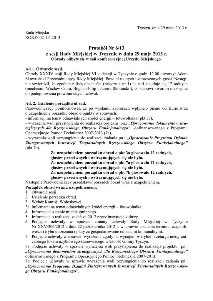 Tyczyn, dnia 29 maja 2013 r. Rada Miejska ROR.0002-1.6.2013 Protokół Nr 6/13 z sesji Rady Miejskiej w Tyczynie w dniu 29 maja 2013 r. Obrady odbyły się w sali konferencyjnej Urzędu Miejskiego. Ad.1. Otwarcie sesji. Obrady XXXIV sesji Rady Miejskiej VI kadencji w Tyczynie o godz. 12.00 otworzył Adam Skowroński Przewodniczący Rady Miejskiej. Powitał radnych i zaproszonych gości. Następnie stwierdził, że zgodnie z listą obecności (załącznik nr 1) na sali znajduje się 12 radnych (nieobecni: Wacław Ciura, Bogdan Filip i Janusz Skotnicki ), co stanowi kworum niezbędne do podejmowania prawomocnych uchwał. Ad. 2. Ustalenie porządku obrad. Przewodniczący poinformował, że po wysłaniu zaproszeń wpłynęło pismo od Burmistrza o uzupełnienie porządku obrad o punkty w sprawach: - informacji na temat odnawialnych źródeł energii – fotowoltaika (pkt 3a), - wyrażenia woli przystąpienia do realizacja projektu pn.: „Opracowanie dokumentów strategicznych dla Rzeszowskiego Obszaru Funkcjonalnego” dofinansowanego z Programu Operacyjnego Pomoc Techniczna 2007-2013 (7a), - wyrażenia woli przystąpienia do realizacji zadania pn.: „Opracowanie Programu Działań Zintegrowanych Inwestycji Terytorialnych Rzeszowskiego Obszaru Funkcjonalnego” (pkt 7b). Za uzupełnieniem porządku obrad o pkt 3a głosowało 12 radnych, głosów przeciwnych i wstrzymujących się nie było. Za uzupełnieniem porządku obrad o pkt 7a głosowało 12 radnych, głosów przeciwnych i wstrzymujących się nie było. Za uzupełnieniem porządku obrad o pkt 7b głosowało 12 radnych, głosów przeciwnych i wstrzymujących się nie było. Następnie Przewodniczący przedstawił porządek obrad wraz z uzupełnieniem. Porządek obrad wraz z uzupełnieniem: 1. Otwarcie sesji 2. Ustalenie porządku obrad. 3. Wybór Komisji Wnioskowej. 3a. Informacji na temat odnawialnych źródeł energii – fotowoltaika. 4. Informacja o stanie mienia gminnego. 5. Informacja o realizacji zadań za 2012 przez instytucje kultury. 6. Podjęcie uchwały w sprawie zmiany uchwały Rady Miejskiej w Tyczynie Nr XXV/206/2012 z dnia 22 października 2012 r. w sprawie ustalenia terminu, częstotliwości i trybu uiszczania opłaty za gospodarowanie odpadami komunalnymi. 7. Podjęcie uchwały w sprawie wyrażenia zgody na wynajem w trybie przetargu nieograniczonego lokalu użytkowego stanowiącego własność Gminy Tyczyn. 7a. Podjęcie uchwały w sprawie wyrażenia woli przystąpienia do realizacja projektu pn.: „Opracowanie dokumentów strategicznych dla Rzeszowskiego Obszaru Funkcjonalnego” dofinansowanego z Programu Operacyjnego Pomoc Techniczna 2007-2013. 7b. Podjęcie uchwały w sprawie wyrażenia woli przystąpienia do realizacji zadania pn.: „Opracowanie Programu Działań Zintegrowanych Inwestycji Terytorialnych Rzeszowskiego Obszaru Funkcjonalnego”. 8. Podjęcie uchwały w sprawie zmiany uchwały budżetowej gminy Tyczyn na 2013 r. 9. Informacja o międzysesyjnej działalności Burmistrza. 10. Sprawy różne. 11. Zapytania i interpelacje, wolne wnioski. 12. Głosowanie wniosków zgłoszonych podczas sesji. 13. Przyjęcie protokołów z sesji z dnia 22 marca i 26 kwietnia 2013 r. 14. Zakończenie sesji. O godz. 12.15 przyszedł radny Janusz Skotnicki. Rada w obecności 13 radnych - 13 „za”, 0 „przeciw”, 0„wstrzym. się” przegłosowała porządek obrad wraz z uzupełnieniem. Ad.3. Wybór Komisji Wnioskowej. Do Komisji Wnioskowej zaproponowano radnych: Krystynę Stachowską, Genowefę Szawarę i Danutę Szyszkę. Rada w obecności 13 radnych - 13„za”, 0 „przeciw”, 0„wstrzym. się” – wybrała Komisję Wnioskową. Do Komisji Wnioskowej weszli: Krystyna Stachowska, Genowefa Szawara i Danuta Szyszka. Ad.3a. Informacja na temat odnawialnych źródeł energii – fotowoltaika. Informacje na temat odnawialnych źródeł energii przedstawił Pan Witold Mikrut Prezes Firmy Sun Can Polska Energia Alternatywna Sp. z o.o. z Boguchwały. - Prezes W. Mikrut wyjaśnił, że fotowoltaika polega na bezpośrednim przetwarzaniu promieniowania słonecznego w energię elektryczną, a panele fotowoltaiczne są bezpieczne dla środowiska, nie emitują hałasu oraz zanieczyszczeń. Aby uzyskać większe napięcie czy moc pojedyncze ogniwa łączy się w panele. Wyjaśnił, że pojedyncze ogniwo produkuje maksymalnie do 2W energii elektrycznej, a urządzenia fotowoltaiczne charakteryzuje prostota konstrukcji i obsługi oraz trwałość. Dodał, że farmy fotowoltaiczne budowane są najczęściej na nieużytkach rolnych, można je również zintegrować z obiektami architektonicznymi (np. dachy, czy elewacje budynków)a w realizację farmy fotowoltaicznej mogą włączyć się również mieszkańcy gminy. Następnie rozpoczęła się dyskusja, w której głos zabrali Przewodniczący oraz radni: Janusz Skotnicki, Janusz Płodzień, Ryszard Fornal i Tomasz Chlebek. Ad.4. Informacja o stanie mienia gminnego. - Pracownik UM Aleksandra Szymańska-Jajuga omówiła stan mienia gminnego. Powiedziała, że w 2012 r. skomunalizowano grunty o pow. 7,2915 ha w tym ½ udziału na gruntach o pow. 4,079 ha (Tyczyn 3,4315 ha w tym ½ udziału na gruntach o pow. 1,769 ha, Borek Stary 2,8 ha w tym ½ udziału na gruntach o pow. 2,31 ha, Hermanowa 0,54 ha oraz Kielnarowa 0,52 ha). W 2013 r. skomunalizowano grunty o pow. 3,5241 ha (Tyczyn 1,4741 ha, Borek Stary 1,77 ha i Hermanowa 0,28 ha). Natomiast w 2012 r. zakupiono 3 działki o pow. 0,1650 ha za kwotę 37.176 zł (Matysówka 2 działki o pow. 0,09 ha za kwotę 32.776 zł, Kielnarowa 1 działka o pow. 0,0750 ha za kwotę 4.400 zł). W 2013 r. zakupiono 1 działkę w Tyczynie o pow. 0,0097 ha za kwotę 5.200 zł i przyjęto darowiznę 4 działek o pow. 0,0225 ha (1 działka w Hermanowej o pow. 0,0018 ha i 3 działki w Borku Starym o pow. 0,0207 ha). Dodała, że w 2012 r. sprzedano 5 działek pow. 0,2956 ha za kwotę 90.370 zł (Tyczyn sprzedano 3 działki o łącznej pow. 0,1503 za