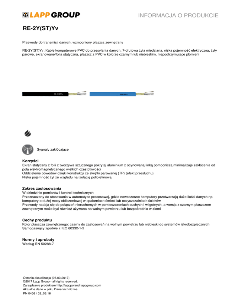 INFORMACJA O PRODUKCIE RE-2Y(ST)Yv Przewody do transmisji danych, wzmocniony płaszcz zewnętrzny RE-2Y(ST)Yv: Kable komputerowe PVC do przesyłania danych, 7-drutowa żyła miedziana, niska pojemność elektryczna, żyły parowe, ekranowane/folia statyczna, płaszcz z PVC w kolorze czarnym lub niebieskim, niepodtrzymujące płomieni Sygnały zakłócające Korzyści Ekran statyczny z folii z tworzywa sztucznego pokrytej aluminium z ocynowaną linką pomocniczą minimalizuje zakłócenia od pola elektromagnetycznego wielkich częstotliwości Oddzielenie obwodów dzięki konstrukcji ze skrętki parowanej (TP) (efekt przesłuchu) Niska pojemność żył ze względu na izolację poliolefinową Zakres zastosowania W dziedzinie pomiarów i kontroli technicznych Przeznaczony do stosowania w automatyce procesowej, gdzie nowoczesne komputery przetwarzają duże ilości danych np. komputery o dużej mocy obliczeniowej w spalarniach śmieci lub oczyszczalniach ścieków Przewody nadają się do połączeń nieruchomych w pomieszczeniach suchych i wilgotnych, a wersja z czarnym płaszczem zewnętrznym może być również używana na wolnym powietrzu lub bezpośrednio w ziemi Cechy produktu Kolor płaszcza zewnętrznego: czarny do zastosowań na wolnym powietrzu lub niebieski do systemów iskrobezpiecznych Samogasnący zgodnie z IEC 60332-1-2 Normy i aprobaty Według EN 50288-7 Ostania aktualizacja (06.03.2017) ©2017 Lapp Group - all rights reserved. Zarządzanie produktem http://lapppoland.lappgroup.com Aktualne dane w pliku Dane techniczne. PN 0456 / 02_03.16 INFORMACJA O PRODUKCIE RE-2Y(ST)Yv Budowa produktu Skrętka 7-żyłowa z czystej miedzi, izolacja żył z polietylenu (PE), żyły skręcone w pary, pary w warstwach Kompletna skrętka zawiera 1 żyłę komunikacyjną (koloru pomarańczowego) w wersjach jednoparowych brak żyły komunikacyjnej Obwój foliowy, ekran z laminowanej folii aluminiowej z cynowanym drutem uziemiającym Wzmocniony płaszcz zewnętrzny wykonany z PVC Kolor płaszcza zewnętrznego: czarny (RAL 9005) lub niebieski (RAL 5015) Dane techniczne Klasyfikacja: ETIM 5.0 Class-ID: EC000104 Opis klasy ETIM 5.0: Przewody do transmisji danych Oznaczenie żył: Żyła a: czarna Żyła a: biała z kolejnymi numerami: 1-1, 2-2, 3-3, 4-4 itd. Wersja potrójna: czarny, biały, czerwony Pojemność robocza: (Wartości orientacyjne dla 800 Hz): C/C: 0,5 mm²: maks. 75 nF/km Wartości orientacyjne dla 800 Hz: Żyła/żyła: 0,5 mm²: maks. 75 nF/km Żyła/żyła: 1,3 mm²: maks. 100nF/km Szczytowe napięcie robocze: (nie do zasilania) 300 V Rezystancja żyły: 0,5 mm²: maks. 39,2 Om/km 1,3 mm²: maks. 14,3 Om/km Minimalny promień gięcia: Sporadycznie ruchome: 15 x średnica zewnętrzna Połączenia nieruchome: 7,5 x średnica zewnętrzna Tłumienie przesłuchu zbliżonego: Przy 60 kHz: min. 0,88 dB/km Napięcie próbne: Żyła/żyła: 2000 V Żyła/ekran: 1000 V Impedancja falowa: Około 100 Om Zakres temperatury: Sporadycznie ruchome: od -5°C do +50°C Połączenia nieruchome: od -40°C do +80°C Wskazówka Wszystkie podane wartości dotyczące produktów są wartościami nominalnymi (o ile nie wskazano inaczej). Inne wartości, takie jak np. tolerancje mogą być przedstawione na zamówienie (jeżeli są dostępne i przeznaczone do publikacji). Standardowe odcinki proszę sprawdzić na: www.lapppolska.pl Rodzaj opakowania: krążek ≤ 30 kg lub ≤ 250 m, w przeciwnym razie bęben Prosimy określić wielkość opakowania (np. 1 x 500 m bęben lub 5 x 100 m krążek) Fotografie nie mogą być używane do wymiarowania oraz nie stanowią szczegółowego odwzorowania przedstawionych produktów. * Podane ceny to ceny netto bez podatku VAT i dodatkowych opłat. Sprzedaż klientom biznesowym. Ostania aktualizacja (06.03.2017) ©2017 Lapp Group - all rights reserved. Zarządzanie produktem http://lapppoland.lappgroup.com Aktualne dane w pliku Dane techniczne. PN 0456 / 02_03.16 Powered by TCPDF (www.tcpdf.org) Wymiary i przekrój w mm² Średnica zewnętrzna [mm] Indeks miedzi [kg/km] Waga [kg/km] 0032400 1.0 x 2.0 x 0,5 7,2 15 74 0032401 2.0 x 2.0 x 0,5 9,5 30 117 0032411 1.0 x 2.0 x 0,5 7,2 15 74 0032412 2.0 x 2.0 x 0,5 9,5 30 117 0032413 4.0 x 2.0 x 0,5 11,1 50 140 0032415 10.0 x 2.0 x 0,5 14,5 110 220 0032418 20.0 x 2.0 x 0,5 17,9 210 385 0032420 36.0 x 2.0 x 0,5 22,6 370 656 0032421 48.0 x 2.0 x 0,5 27,1 490 854 0032422 1.0 x 2.0 x 1,3 8,6 31 102 0032423 2.0 x 2.0 x 1,3 11,5 62 161 0032424 4.0 x 2.0 x 1,3 13,8 114 230 0032428 24.0 x 2.0 x 1,3 27,5 684 952 0032430 1.0 x 2.0 x 1,3 8,6 31 102 0032431 2.0 x 2.0 x 1,3 11,5 62 161 0032432 4.0 x 2.0 x 1,3 13,8 114 230 0032433 8.0 x 2.0 x 1,3 16,9 218 377 0032434 12.0 x 2.0 x 1,3 19,3 322 520 0032436 24.0 x 2.0 x 1,3 27,5 684 952 RE-2Y(ST)Yv 0,5 mm² niebieski 0,5 mm² czarny RE-2Y(ST)Yv Ostania aktualizacja (06.03.2017) ©2017 Lapp Group - all rights reserved. Zarządzanie produktem http://lapppoland.lappgroup.com Aktualne dane w pliku Dane techniczne. PN 0456 / 02_03.16 1,3 mm² niebieski 1,3 mm² czarny INFORMACJA O PRODUKCIE Powered by TCPDF (www.tcpdf.org) Numer katalogowy