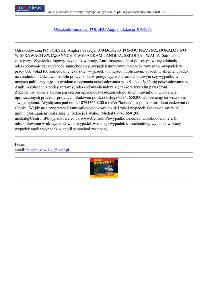 Dane pochodzą ze strony: http://polskieyorkshire.pl/. Wygenerowano dnia: 08-03-2017. Odszkodowania PO POLSKU Anglia i Szkocja 0794365 Odszkodowania PO POLSKU Anglia i Szkocja 07943650200 POMOC PRAWNA, DORADZTWO W SPRAWACH ZWIĄZANYCH Z WYPADKAMI, ANGLIA, SZKOCJA I WALIA Samochod zastepczy, Wypadek drogowy, wypadek w pracy, Auto zastępcze Nasi polscy prawnicy zdobędą odszkodowanie za: -wypadek samochodowy, wypadek motorowy, wypadek rowerowy -wypadek w pracy UK -błąd lub zaniedbanie lekarskie -wypadek w miejscu publicznym, upadek w sklepie, upadek na chodniku Odczuwanie bólu po wypadku w pracy, wypadku samochodowym czy wypadku w miejscu publicznym jest powodem otrzymania odszkodowania w UK. Należy Ci się odszkodowanie w Anglii wypłacane z polisy sprawcy, odszkodowania należą się także wszystkim pasażerom. Zapewnimy Tobie i Twoim pasażerom opiekę doświadczonych polskich prawników. Gwarancja uproszczonych procedur prawnych. Zadzwoń polska obsługa 07943650200 Odpowiemy na wszystkie Twoje pytania. Wyślij sms pod numer 07943650200 o treści "kontakt", a polski konsultant zadzwoni do Ciebie. Wejdź na stronę www.CentrumPowypadkowe.co.uk i zgłoś wypadek. Oddzwonimy w 10 minut. Obslugujemy cala Anglie, Szkocje i Walie. Michal 07943 650 200 [email protected] www.CentrumPowypadkowe.co.uk Odszkodowanie UK odszkodowanie w uk wypadek w uk wypadek w szkocji wypadek samochodowy wypadek w pracy wypadek anglia wypadek w anglii samochod zastepczy Dane: email: [email protected]