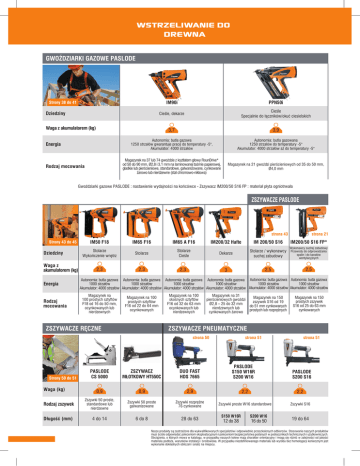 WSTRZELIWANIE DO DREWNA GWOŹDZIARKI GAZOWE PASLODE IM90i PPN50i Cieśle, dekarze Cieśle Specjalnie do łączników/okuć ciesielskich 3,7 3,9 Autonomia: butla gazowa 1250 strzałów gwarantuje pracę do temperatury -5°, Akumulator: 4000 strzałów Autonomia: butla gazowana 1250 strzałów do temperatury -5° Akumulator: 4000 strzałów aż do temperatury -5° Magazynek na 37 lub 74 gwoździe z ksztłatem głowy RounDrive* od 50 do 90 mm, Ø2,8 i 3,1 mm na laminowanej taśmie papierowej, gładkie lub pierścieniowe, standardowe, galwanizowane, cynkowane żarowo lub nierdzewne (stal chromowo-niklowa) Magazynek na 21 gwoździ pierścieniowych od 35 do 50 mm, Ø4,0 mm Strony 38 do 41 Dziedziny Waga z akumulatorem (kg) Energia Rodzaj mocowania Gwoździarki gazowe PASLODE : nastawienie wydajności na końcówce - Zszywacz IM200/50 S16 FP : materiał płyta ogniotrwała ZSZYWACZE PASLODE strona 43 Strony 43 do 45 Dziedziny Waga z akumulatorem (kg) Energia Rodzaj mocowania IM50 F18 IM65 F16 IM65 A F16 IM200/32 Hafte strona 21 IM 200/50 S16 IM200/50 S16 FP* Stolarze Wykończenie wnętrz Stolarze Stolarze Cieśle Dekarze Stolarze / wykonawcy suchej zabudowy Wykonawcy suchej zabudowy Przewody do odprowadzania spalin i do kanałów wentylacyjnych 2,3 2,3 2,3 3 2,5 2,5 Autonomia: butla gazowa Autonomia: butla gazowa Autonomia: butla gazowa Autonomia: butla gazowa Autonomia: butla gazowa Autonomia: butla gazowa 1000 strzałów 1000 strzałów 1000 strzałów 1000 strzałów 1000 strzałów 1000 strzałów Akumulator: 4000 strzałów Akumulator: 4000 strzałów Akumulator: 4000 strzałów Akumulator: 4000 strzałów Akumulator: 4000 strzałów Akumulator: 4000 strzałów Magazynek na 100 prostych sztyftów F18 od 16 do 50 mm, ocynkowanych lub nierdzewnych Magazynek na 100 prostych sztyftów F16 od 22 do 64 mm ocynkowanych ZSZYWACZE RĘCZNE Magazynek na 100 skośnych sztyftów F16 od 32 do 63 mm ocynkowanych lub nierdzewnych Magazynek na 31 Magazynek na 150 pierścieniowych gwoździ zszywek S16 od 19 Ø2,8 – 25 do 32 mm do 51 mm cynkowanych nierdzewnych lub prostych lub rozprężnych cynkowanych żarowo Magazynek na 150 prostych zszywek S16 od 25 do 63 mm cynkowanych ZSZYWACZE PNEUMATYCZNE strona 50 strona 51 PASLODE S150 W16R S200 W16 strona 51 PASLODE CS 5000 ZSZYWACZ MŁOTKOWY HT550C DUO FAST HDS 7665 0,9 0,9 2,9 2,2 2,2 Rodzaj zszywek Zszywki 50 proste, standardowe lub nierdzewne Zszywki 50 proste galwanizowane Zszywki rozprężne 76 cynkowane Zszywki proste W16 standardowe Zszywki S16 Długość (mm) 4 do 14 6 do 8 28 do 63 Strony 50 do 51 Waga (kg) S150 W16R S200 W16 12 do 38 16 do 50 PASLODE S200 S16 19 do 64 Nasze produkty są zastrzeżone dla wykwalifikowanych specjalistów i odpowiednio przeszkolonych odbiorców. Stosowanie naszych produktów musi ściśle odpowiadać poleceniom eksploatacyjnym i poleceniom bezpieczeństwa podanych w podręcznikach technicznych i użytkowniczych. Obciążenia, o których mowa w katalogu, w przypadku naszych kotew mają charakter orientacyjny i mogą się różnić w zależności od jakości materiału podłoża, warunków instalacji i środowiska. W przypadku niezdefiniowanego materiału lub wyrobu bez homologacji koniecznym jest wykonanie dokładnych obliczeń i analiz na miejscu. GWOŹDZIARKI PNEUMATYCZNE DO KONSTRUKCJI WYBÓR PROFESJONALISTY DO GWOŹDZI NA PAPIEROWEJ TAŚMIE PASLODE PSN90 Waga (kg) PASLODE PSN100 PASLODE F250 SPP 3,9 3,5 4 Gwoździe Ø2,5 do 3,1 mm Gwoździe Ø2,8 do 3,4 mm Rodzaj gwoździ gładkie lub pierścieniowe standardowe, cynkowane lub nierdzewne A2 Długość (mm) 45 do 90 Waga (kg) CNP65.1 2 2,2 Gwoździe Ø2,1 do 2,7 mm Rodzaj gwoździ Długość (mm) 40 do 50 35 do 65 Strona 49 CNP75.1 Waga (kg) 2,8 Gwoździe Ø2,5 do 2,7 mm 50 do 70 7,1 DFSN100 3,6 gładkie, pierścieniowe standardowe 90 do 130 100 do 160 gładkie lub skręcone, standardowe lub ocynkowane 50 do 100 DO GWOŹDZI PASKOWANYCH NA TARCZACH NA ZWOJU DRUCIAMYM gładkie pierścieniowe lub śrubowe standardowe, cynkowane, cynkowane żarowo lub nierdzewne A4 27 do 50 6,8 Gwoździe Ø4 mm powłoka galwaniczna 50 do 100 CNP50Y PASLODE 6625/160 SQ Gwoździe Ø3,4 do 3,8 mm Gwoździe Ø3,8 do 4,6 mm Gwoździe Ø2,8 do 4,1 mm DO GWOŹDZI PASKOWANYCH NA TARCZACH Z TAŚMY PLASTIKOWEJ Strona 48 PASLODE 6512/130 SQ HAUBOLD RNC45R HAUBOLD RNC65 S/W CNW70.1 CNW90 2,0 2,3 Rodzaj gwoździ PAPA Gwoździe Ø3 mm z szerokim łbem 10 mm gładkie, cynkowane żarowo Gwoździe Ø2,2 do 2,8 mm gładkie, pierścieniowe standardowe Długość (mm) 16 do 45 40 do 65 3,8 gładkie pierścieniowe lub śrubowe standardowe 50 do 70 PNEUMATYCZNE GWOŹDZIARKI WYKOŃCZENIOWE PASLODE FN1850 PASLODE FN1835 PASLODE FN1665.1 PASLODE FN16A65 1,2 1,2 1,7 1,7 Rodzaj gwoździ Proste gwoździe F18 12/44 Proste gwoździe F18 12/44 Proste gwoździe F16 14/60 Skośne gwoździe F16 cynkowane Długość (mm) 16 do 50 10 do 35 19 do 64 32 do 64 Strony 52-53 Waga (kg) 3,8 Gwoździe Ø2,5 Gwoździe Ø2,5 do 3,4 mm do 2,8 mm solidne mocowanie 50 do 90 WSTRZELIWANIE DREWNO DO DREWNA Strony 46-49 DO GWOŹDZI W TAŚMIE PLASTIKOWEJ WYBÓR PROFESJONALISTY SZYBKI WYBÓR GWOŹDZI DO WSTRZELIWANIA NORMA EUROCODE NIERDZEWNE KLASA 1,2,3 OD 03.2010 ŁATY DO PŁYT OSB ORAZ DESEK DESKOWANIE MOCOWANIE BELEK NA DREWNIANE SZKIELETY DOMÓW PŁYTA OSB PANELE DREWNIANE ELEWACJE Z RÓŻNYCH MATERIAŁÓW ŁĄCZNIKI CIESIELSKIE WSPORNIK BELKI OD DO OD DO OD DO OD DO OD DO OD DO OD DO OD DO 03.2010 03.2010 03.2010 03.2010 03.2010 03.2010 03.2010 03.2010 03.2010 03.2010 03.2010 03.2010 03.2010 03.2010 03.2010 03.2010 ŁATY DACHOWE 2500 do 3500 Pierścieniowy 51 i 70 Gładki 63 i 70 500 do 1200 Pierścieniowy 63 i 70 Pierścieniowy 90* Gładki 70 i 90 400 do 900 Pierścieniowy i gładki 63, 70 i 90* 1000 do 2000 Pierścieniowy 80 – 90 Gładki 90 500 do 1000 Pierścieniowy i gładki 51, 63, 70, 75, 80 i 90 2000 do 2500 Pierścieniowy 51 i 63 Gładki 63 i 70 Gładki 51 3500 do 5500 Gładki 63 200 - 500 Pierścieniowy 51, 55, 63 i 70 Gładki