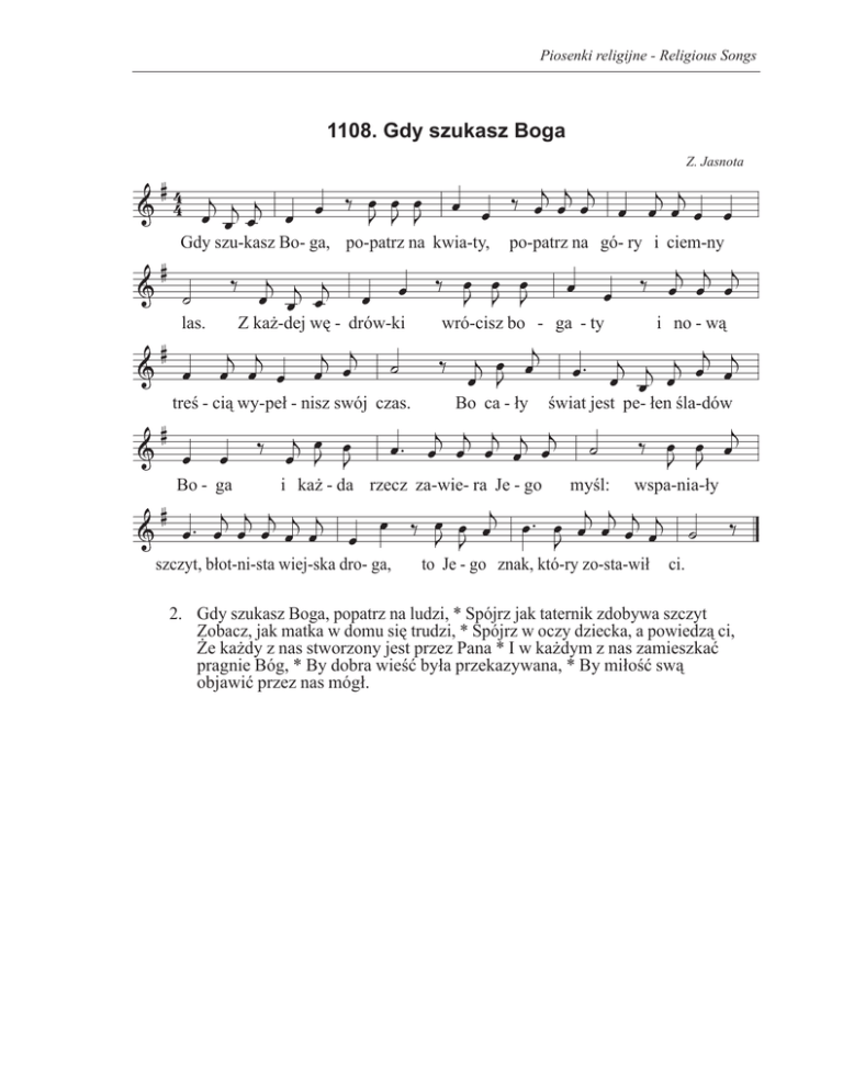 Piosenki religijne - Religious Songs 1108. Gdy szukasz Boga Z. Jasnota Gdy szu-kasz Bo- ga, po-patrz na kwia-ty, las. Z każ-dej wę - drów-ki treś - cią wy-peł - nisz swój czas. Bo - ga wró-cisz bo - ga - ty Bo ca - ły i każ - da rzecz za-wie- ra Je - go szczyt, błot-ni-sta wiej-ska dro- ga, 2. po-patrz na gó- ry i ciem-ny i no - wą świat jest pe- łen śla-dów myśl: wspa-nia-ły to Je - go znak, któ-ry zo-sta-wił ci. Gdy szukasz Boga, popatrz na ludzi, * Spójrz jak taternik zdobywa szczyt Zobacz, jak matka w domu się trudzi, * Spójrz w oczy dziecka, a powiedzą ci, Że każdy z nas stworzony jest przez Pana * I w każdym z nas zamieszkać pragnie Bóg, * By dobra wieść była przekazywana, * By miłość swą objawić przez nas mógł.