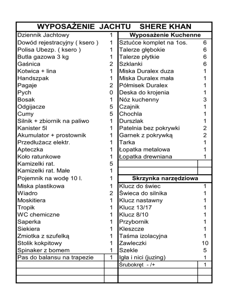 WYPOSAŻENIE JACHTU Dziennik Jachtowy Dowód rejestracyjny ( ksero ) Polisa Ubezp. ( ksero ) Butla gazowa 3 kg Gaśnica Kotwica + lina Handszpak Pagaje Pych Bosak Odgijacze Cumy Silnik + zbiornik na paliwo Kanister 5l Akumulator + prostownik Przedłużacz elektr. Apteczka Koło ratunkowe Kamizelki rat. Kamizelki rat. Małe Pojemnik na wodę 10 l. Miska plastikowa Wiadro Moskitiera Tropik WC chemiczne Saperka Siekiera Zmiotka z szufelką Stolik kokpitowy Spinaker z bomem Pas do balansu na trapezie 1 1 1 1 2 1 1 2 0 1 5 5 1 1 1 1 1 1 5 1 1 1 2 1 1 1 1 1 1 1 1 1 SHERE KHAN Wyposażenie Kuchenne Sztućce komplet na 1os. Talerze głębokie Talerze płytkie Szklanki Miska Duralex duza Miska Duralex mała Półmisek Duralex Deska do krojenia Nóz kuchenny Czajnik Chochla Durszlak Patelnia bez pokrywki Garnek z pokrywką Tarka Łopatka metalowa Łopatka drewniana Skrzynka narzędziowa Klucz do świec Świeca do silnika Klucz nastawny Klucz 13/17 Klucz 8/10 Przybornik Kleszcze Taśma izolacyjna Zawleczki Szekle Igła i nici (juzing) Śrubokręt - /+ 6 6 6 6 1 1 1 1 3 1 1 1 2 2 1 1 1 1 1 1 1 1 1 1 1 10 5 1 1