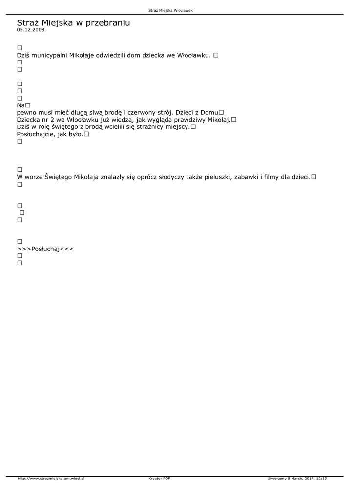Straż Miejska Włocławek Straż Miejska w przebraniu 05.12.2008. Dziś municypalni Mikołaje odwiedzili dom dziecka we Włocławku. Na pewno musi mieć długą siwą brodę i czerwony strój. Dzieci z Domu Dziecka nr 2 we Włocławku już wiedzą, jak wygląda prawdziwy Mikołaj. Dziś w rolę świętego z brodą wcielili się strażnicy miejscy. Posłuchajcie, jak było. W worze Świętego Mikołaja znalazły się oprócz słodyczy także pieluszki, zabawki i filmy dla dzieci. >>>Posłuchaj<<< http://www.strazmiejska.um.wlocl.pl Kreator PDF Utworzono 8 March, 2017, 12:13