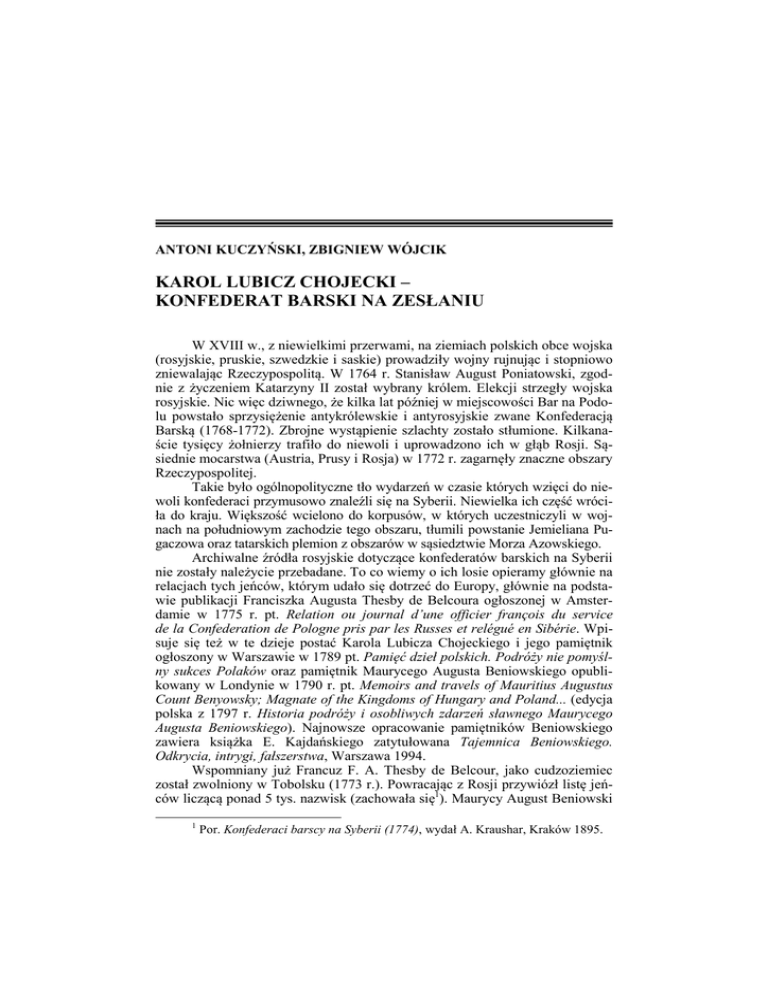 ANTONI KUCZYŃSKI, ZBIGNIEW WÓJCIK KAROL LUBICZ CHOJECKI – KONFEDERAT BARSKI NA ZESŁANIU W XVIII w., z niewielkimi przerwami, na ziemiach polskich obce wojska (rosyjskie, pruskie, szwedzkie i saskie) prowadziły wojny rujnując i stopniowo zniewalając Rzeczypospolitą. W 1764 r. Stanisław August Poniatowski, zgodnie z życzeniem Katarzyny II został wybrany królem. Elekcji strzegły wojska rosyjskie. Nic więc dziwnego, że kilka lat później w miejscowości Bar na Podolu powstało sprzysiężenie antykrólewskie i antyrosyjskie zwane Konfederacją Barską (1768-1772). Zbrojne wystąpienie szlachty zostało stłumione. Kilkanaście tysięcy żołnierzy trafiło do niewoli i uprowadzono ich w głąb Rosji. Sąsiednie mocarstwa (Austria, Prusy i Rosja) w 1772 r. zagarnęły znaczne obszary Rzeczypospolitej. Takie było ogólnopolityczne tło wydarzeń w czasie których wzięci do niewoli konfederaci przymusowo znaleźli się na Syberii. Niewielka ich część wróciła do kraju. Większość wcielono do korpusów, w których uczestniczyli w wojnach na południowym zachodzie tego obszaru, tłumili powstanie Jemieliana Pugaczowa oraz tatarskich plemion z obszarów w sąsiedztwie Morza Azowskiego. Archiwalne źródła rosyjskie dotyczące konfederatów barskich na Syberii nie zostały należycie przebadane. To co wiemy o ich losie opieramy głównie na relacjach tych jeńców, którym udało się dotrzeć do Europy, głównie na podstawie publikacji Franciszka Augusta Thesby de Belcoura ogłoszonej w Amsterdamie w 1775 r. pt. Relation ou journal d’une officier françois du service de la Confederation de Pologne pris par les Russes et relégué en Sibérie. Wpisuje się też w te dzieje postać Karola Lubicza Chojeckiego i jego pamiętnik ogłoszony w Warszawie w 1789 pt. Pamięć dzieł polskich. Podróży nie pomyślny sukces Polaków oraz pamiętnik Maurycego Augusta Beniowskiego opublikowany w Londynie w 1790 r. pt. Memoirs and travels of Mauritius Augustus Count Benyowsky; Magnate of the Kingdoms of Hungary and Poland... (edycja polska z 1797 r. Historia podróży i osobliwych zdarzeń sławnego Maurycego Augusta Beniowskiego). Najnowsze opracowanie pamiętników Beniowskiego zawiera książka E. Kajdańskiego zatytułowana Tajemnica Beniowskiego. Odkrycia, intrygi, fałszerstwa, Warszawa 1994. Wspomniany już Francuz F. A. Thesby de Belcour, jako cudzoziemiec został zwolniony w Tobolsku (1773 r.). Powracając z Rosji przywiózł listę jeńców liczącą ponad 5 tys. nazwisk (zachowała się1). Maurycy August Beniowski 1 Por. Konfederaci barscy na Syberii (1774), wydał A. Kraushar, Kraków 1895. ANTONI KUCZYŃSKI, ZBIGNIEW WÓJCIK 38 uciekł w czasie pobytu w Kazaniu, ale w drodze do Moskwy został złapany i wysłany na Kamczatkę, skąd zbiegł na porwanym okręcie, docierając z załogą rosyjską do Francji, natomiast Karol Lubicz Chojecki zbiegł z wojska podczas walk z Tatarami w 1776 r. z obozu nad rzeką Kalmus na Pomorzu Azowskim, skąd samotnie przez Zaporoże dotarł do Polski. Ze zrozumiałych względów, o ile chodzi o relacje dotyczące warunków pobytu konfederatów barskich na Syberii oraz w terenach przyległych od południa i południowo-zachodu, zapiski Karola Lubicz Chojeckiego są najpełniejsze. Pierwsze ich wydanie ukazało się w roku 1789 w Warszawie jako Pamięć dzieł polskich. Podróż i niepomyślny sukces Polaków przez Urodzonego Karola Lubicz Chojeckiego. Druga ich edycja, anonimowa ukazała się w roku 1790 jako Polak konfederat przez Moskwę na Syberyą zaprowadzony. Razem wiadomość o Buncie Puchaczewa. Ich wartość doceniono pod koniec XIX w. w Rosji i we fragmentach ogłoszono w „Kijewskiej Starinie” (1883) oraz na łamach serii wydawniczej „Ruskij Archiv” (1886). Na kolejne polskie edycje czekano ponad dwieście lat bowiem pierwsza z nich zatytułowana Pamięć dzieł polskich. Podróż i niepomyślny sukces Polaków. (Opracowanie, wstęp i przypisy Wojciech Turek), ukazała się w Gdańsku w 1992 roku, druga natomiast opatrzona krytycznym komentarzem została opublikowana pt. Karol Lubicz Chojecki, Pamięć dzieł polskich. Podróż i niepomyślny sukces Polaków. Na podstawie pierwodruku z 1789 roku wydali oraz przypisami i komentarzami opatrzyli Antoni Kuczyński i Zbigniew J. Wójcik, Bagno – Warszawa – Wrocław 1997.2 Żołnierka Z treści Pamięci dzieł polskich wynika, że konfederacka żołnierka Chojeckiego rozpoczęła się w pierwszej połowie 1768 r. Od czerwca do sierpnia bronił Krakowa obleganego przez Rosjan. Miasto poddało się w końcu sierpnia. Obrońców uwięziono na Wawelu i 1 września 1768 r. pod konwojem wyprowadzono na wschód. Pierwszy dłuższy pobyt (koniec października 1768 r. – początek 1769 r.) był w twierdzy kijowskiej. Z Kijowa pomaszerowali do Kazania, gdzie byli do jesieni 1769 r. Stąd przez Kungur dotarli do Solikamska, gdzie trzymano ich do lata 1770 r. Jesienią przekroczyli Ural (praktycznie nie odnotowany w relacji), dochodząc do syberyjskiego Wierchoturia, a stąd do Tiumenia, gdzie spędzili Boże Narodzenie. W styczniu skierowano ich do Tobolska, a potem do Tary (luty – marzec 1771). Już tam przekonali się, że stopniowo zmieniał się ich status. Młodych i zdrowych (w tym Chojeckiego) przygotowano do służby w wojsku syberyjskim, co też nastąpiło na wiosnę 1771 r. w Omsku. Początkowo służył w dragonach, później w regimencie pieszym. Złożyli, nie mając wyjścia, przysięgę. Całe lato 1771 r. zajął im pościg za Kałmukami uciekającymi z guberni orenburskiej do Chin. Przeszli przez ówczesny „Step Kirgiski” (dzisiejszy Kazachstan) docierając do granicy z Chinami. W drodze powrotnej poznali Semipałatyńsk, czyli miasta „siedmiu pałaców, których tam tylko mury widzieliśmy. Żadni tam mieszkańcy nie znajdują 2 W edycji tej zestawiono wszystkie wydania pamiętnika K. Lubicz Chojeckiego z uwzględnieniem przedruków niektórych ich fragment