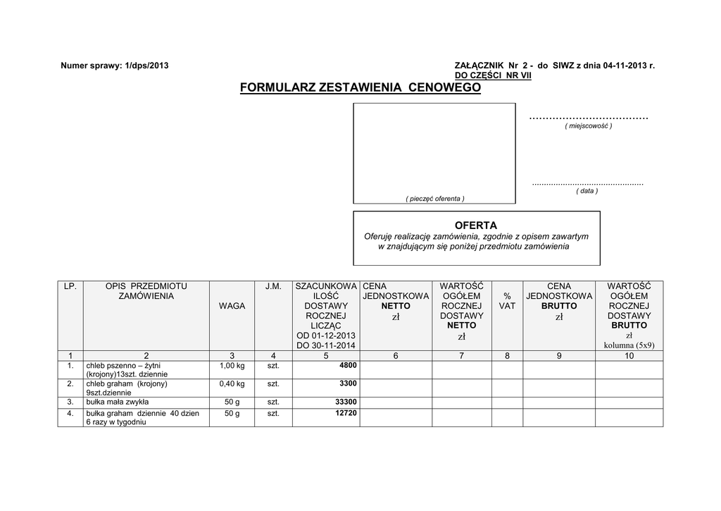 ZAŁĄCZNIK Nr 2 - do SIWZ z dnia 04-11-2013 r. DO CZĘŚCI NR VII Numer sprawy: 1/dps/2013 FORMULARZ ZESTAWIENIA CENOWEGO .................................... ( miejscowość ) ............................................... ( data ) ( pieczęć oferenta ) OFERTA Oferuję realizację zamówienia, zgodnie z opisem zawartym w znajdującym się poniżej przedmiotu zamówienia LP. OPIS PRZEDMIOTU ZAMÓWIENIA J.M. WAGA 1 1. 2. 3. 4. 2 chleb pszenno – żytni (krojony)13szt. dziennie chleb graham (krojony) 9szt.dziennie bułka mała zwykła bułka graham dziennie 40 dzien 6 razy w tygodniu SZACUNKOWA CENA ILOŚĆ JEDNOSTKOWA NETTO DOSTAWY ROCZNEJ zł LICZĄC OD 01-12-2013 DO 30-11-2014 5 6 3 4 1,00 kg szt. 4800 0,40 kg szt. 3300 50 g 50 g szt. szt. 33300 12720 WARTOŚĆ OGÓŁEM ROCZNEJ DOSTAWY NETTO % VAT CENA JEDNOSTKOWA BRUTTO zł zł 7 8 9 WARTOŚĆ OGÓŁEM ROCZNEJ DOSTAWY BRUTTO zł kolumna (5x9) 10 (2) 1 2 3 4 5 6 5 chałka 400 g szt. 50 6. pączek 90g szt 100 7. Wek. 400 g szt. 3324 8. bułka tarta kg 150 9. drożdże kg 60 10. babka Wielkanocna szt. 35 400 g 7 8 9 10 WARTOŚĆ OGÓŁEM DOSTAWY ROCZNEJ brutto netto ............................................................... ( podpis zamawiającego ) ................................................................... ( pieczęć i podpis oferenta )