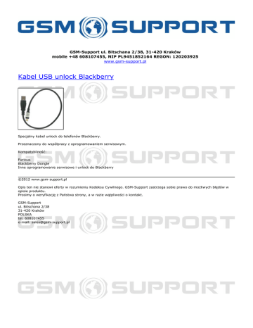 GSM-Support ul. Bitschana 2/38, 31-420 Kraków mobile +48 608107455, NIP PL9451852164 REGON: 120203925 www.gsm-support.pl Kabel USB unlock Blackberry Specjalny kabel unlock do telefonów Blackberry. Przeznaczony do współpracy z oprogramowaniem serwisowym. Kompatybilność: Furious Blackberry Dongle Inne oprogramowanie serwisowe i unlock do Blackberry ©2012 www.gsm-support.pl Opis ten nie stanowi oferty w rozumieniu Kodeksu Cywilnego. GSM-Support zastrzega sobie prawo do możliwych błędów w opisie produktu. Prosimy o weryfikację z Państwa strony, a w razie wątpliwości o kontakt. GSM-Support ul. Bitschana 2/38 31-420 Kraków POLSKA tel. 608107455 e-mail: [email protected] Powered by TCPDF (www.tcpdf.org)
