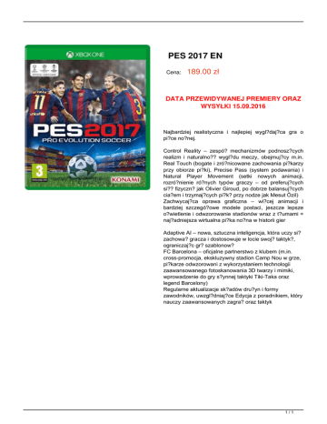 PES 2017 EN Cena: 189.00 zł DATA PRZEWIDYWANEJ PREMIERY ORAZ WYSYŁKI 15.09.2016 Najbardziej realistyczna i najlepiej wygl?daj?ca gra o pi?ce no?nej. Control Reality – zespó? mechanizmów podnosz?cych realizm i naturalno?? wygl?du meczy, obejmuj?cy m.in. Real Touch (bogate i zró?nicowane zachowania pi?karzy przy obiorze pi?ki), Precise Pass (system podawania) i Natural Player Movement (setki nowych animacji, rozró?nienie ró?nych typów graczy – od preferuj?cych si?? fizyczn? jak Olivier Giroud, po dobrze balansuj?cych cia?em i trzymaj?cych pi?k? przy nodze jak Mesut Özil) Zachwycaj?ca oprawa graficzna – wi?cej animacji i bardziej szczegó?owe modele postaci, jeszcze lepsze o?wietlenie i odwzorowanie stadionów wraz z t?umami = naj?adniejsza wirtualna pi?ka no?na w historii gier Adaptive AI – nowa, sztuczna inteligencja, która uczy si? zachowa? gracza i dostosowuje w locie swoj? taktyk?, ograniczaj?c gr? szablonow? FC Barcelona – oficjalne partnerstwo z klubem (m.in. cross-promocja, ekskluzywny stadion Camp Nou w grze, pi?karze odwzorowani z wykorzystaniem technologii zaawansowanego fotoskanowania 3D twarzy i mimiki, wprowadzenie do gry s?ynnej taktyki Tiki-Taka oraz legend Barcelony) Regularne aktualizacje sk?adów dru?yn i formy zawodników, uwzgl?dniaj?ce Edycja z poradnikiem, który nauczy zaawansowanych zagra? oraz taktyk 1/1 Powered by TCPDF (www.tcpdf.org)