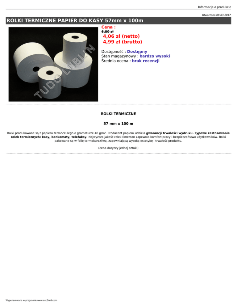 Informacje o produkcie Utworzono 08-03-2017 ROLKI TERMICZNE PAPIER DO KASY 57mm x 100m Cena : 6,00 zł 4,06 zł (netto) 4,99 zł (brutto) Dostępność : Dostępny Stan magazynowy : bardzo wysoki Średnia ocena : brak recenzji ROLKI TERMICZNE 57 mm x 100 m Rolki produkowane są z papieru termoczułego o gramaturze 48 g/m². Producent papieru udziela gwarancji trwałości wydruku. Typowe zastosowanie rolek termicznych: kasy, bankomaty, telefaksy. Najwyższa jakość rolek Emerson zapewnia komfort pracy i bezpieczeństwo użytkowników. Rolki pakowane są w folię termokurczliwą, zapewniającą wysoką estetykę i trwałość produktu. (cena dotyczy jednej sztuki) Wygenerowano w programie www.oscGold.com