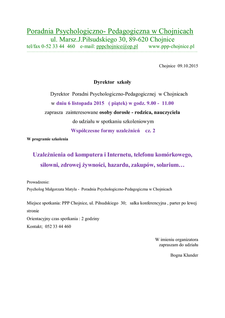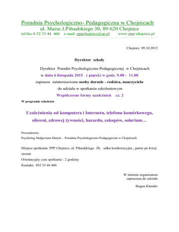 Poradnia Psychologiczno- Pedagogiczna w Chojnicach ul. Marsz.J.Pi sudskiego 30, 89-620 Chojnice tel/fax 0-52 33 44 460 e-mail: [email protected] www.ppp-chojnice.pl …………………………………………………………………………………………………………………………………………………….. Chojnice 09.10.2015 Dyrektor szko y Dyrektor Poradni Psychologiczno-Pedagogicznej w Chojnicach w dniu 6 listopada 2015 ( pi tek) w godz. 9.00 - 11.00 zaprasza zainteresowane osoby doros e - rodzica, nauczyciela do udzia u w spotkaniu szkoleniowym Wspó czesne formy uzale nie cz. 2 W programie szkolenia Uzale nienia od komputera i Internetu, telefonu komórkowego, si owni, zdrowej ywno ci, hazardu, zakupów, solarium… Prowadzenie: Psycholog Ma gorzata Matyla - Poradnia Psychologiczno-Pedagogiczna w Chojnicach Miejsce spotkania: PPP Chojnice, ul. Pi sudskiego 30; salka konferencyjna , parter po lewej stronie Orientacyjny czas spotkania : 2 godziny Kontakt; 052 33 44 460 W imieniu organizatora zapraszam do udzia u Bogna Klunder