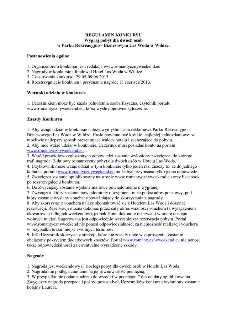 REGULAMIN KONKURSU Wygraj pobyt dla dwóch osób w Parku Rekreacyjno - Biznesowym Las Woda w Wildze. Postanowienia ogólne 1. Organizatorem konkursu jest: redakcja www.romantycznyweekend.eu 2. Nagrody w konkursie ufundował Hotel Las Woda w Wildze. 3. Czas trwania konkursu: 29.05-09.06.2013. 4. Rozstrzygnięcie konkursu i przyznanie nagród: 13 czerwca 2013. Warunki udziału w konkursie 1. Uczestnikiem może być każda pełnoletnia osoba fizyczna, czytelnik portalu www.romantycznyweekend.eu, która wyśle poprawne zgłoszenie. Zasady Konkursu 1. Aby wziąć udział w konkursie należy wymyślić hasło reklamowe Parku Rekreacyjno Biznesowego Las Woda w Wildze. Hasło powinno być krótkie, najlepiej jednozdaniowe, w możliwie najlepszy sposób prezentujące walory hotelu i zachęcające do pobytu. 2. Aby móc wziąć udział w konkursie, Uczestnik musi posiadać konto na portalu www.romantycznyweekend.eu. 3. Wśród prawidłowo zgłoszonych odpowiedzi zostanie wyłoniony zwycięzca, do którego trafi nagroda: 2-dniowy romantyczny pobyt dla dwóch osób w Hotelu Las Woda. 4. Użytkownik może wziąć udział w tym konkursie tylko jeden raz, znaczy to, że do jednego konta na portalu www.romantycznyweekend.eu może być przypisana tylko jedna odpowiedź. 5. Zwycięzca zostanie opublikowany na stronie www.romantycznyweekend.eu oraz Facebook po rozstrzygnięciu konkursu. 6. Do Zwycięzcy zostanie wysłane mailowe powiadomienie o wygranej. 7. Zwycięzca, który zostanie powiadomiony o wygranej, musi podać adres pocztowy, pod który zostanie wysłany voucher upoważniający do skorzystania z nagrody. 8. Aby skorzystać z vouchera należy skontaktować się z Hotelem Las Woda i dokonać rezerwacji. Rezerwacji można dokonać przez cały okres ważności vouchera (z wyłączeniem okresu świąt i długich weekendów), jednak Hotel dokonuje rezerwacji w miarę dostępu wolnych miejsc. Sugerowana jest odpowiednio wcześniejsza rezerwacja pobytu. Portal www.romantycznyweekend nie ponosi odpowiedzialności za niemożność realizacji vouchera w przypadku braku miejsc i wolnych terminów. 9. Jeśli Uczestnik skorzysta z atrakcji, które nie zostały ujęte w zaproszeniu, zostanie obciążony pokryciem dodatkowych kosztów. Portal www.romantycznyweekend.eu nie ponosi także odpowiedzialności za ewentualne wyrządzone szkody. Nagrody 1. Nagrodą jest weekendowy (1 nocleg) pobyt dla dwóch osób w Hotelu Las Woda. 2. Nagroda nie podlega zamianie na jej równowartość pieniężną. 3. W przypadku nie podania adresu do wysyłki w przeciągu 7 dni od daty opublikowania Zwycięzcy nagroda przepada i pośród pozostałych Uczestników konkursu wyłoniony zostanie kolejny Laureat. Postanowienia dodatkowe 1. Udział w konkursie jest jednoznaczny z akceptacją niniejszego regulaminu. 2. Biorąc udział w konkursie Uczestnicy wyrażają zgodę na zbieranie i przetwarzanie podanych przez nich danych osobowych przez www.romantycznyweekend.eu w celach związanych z przeprowadzeniem konkursów (zgodnie z ustawą o ochronie danych osobowych z dnia 29. sierpnia 1997 r. w celu umożliwienia przesłania nagrody). Jednocześnie zgadzają się na otrzymywanie informacji marketingowych drogą mailową od portalu www.romantycznyweekend.eu. 3. Udział w konkursie równoznaczny jest wyrażeniu zgody na opublikowanie nazwisk Zwycięzców na stronie www.romantycznyweekend.eu. 4. Organizator nie ponosi odpowiedzialności za nieprawidłowości związane z działaniem lub zaniechaniem osób trzecich w szczególności operatorów sieci komórkowych i telefonicznych, firm kurierskich, operatorów serwisów internetowych oraz za działania lub zaniechania Uczestników Konkursu. 5. Redakcja www.romantycznyweekend.eu zastrzega sobie możliwość zmiany niniejszego regulaminu. Informacje o wprowadzanych zmianach będą publikowane na stronie.