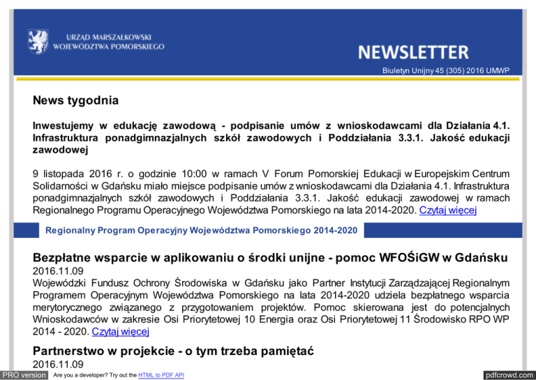 Biuletyn Unijny 45 (305) 2016 UMWP News tygodnia Inwestujemy w edukację zawodową - podpisanie umów z wnioskodawcami dla Działania 4.1. Infrastruktura ponadgimnazjalnych szkół zawodowych i Poddziałania 3.3.1. Jakość edukacji zawodowej 9 listopada 2016 r. o godzinie 10:00 w ramach V Forum Pomorskiej Edukacji w Europejskim Centrum Solidarności w Gdańsku miało miejsce podpisanie umów z wnioskodawcami dla Działania 4.1. Infrastruktura ponadgimnazjalnych szkół zawodowych i Poddziałania 3.3.1. Jakość edukacji zawodowej w ramach Regionalnego Programu Operacyjnego Województwa Pomorskiego na lata 2014-2020. Czytaj więcej Regionalny Program Operacyjny Województwa Pomorskiego 2014-2020 Bezpłatne wsparcie w aplikowaniu o środki unijne - pomoc WFOŚiGW w Gdańsku 2016.11.09 Wojewódzki Fundusz Ochrony Środowiska w Gdańsku jako Partner Instytucji Zarządzającej Regionalnym Programem Operacyjnym Województwa Pomorskiego na lata 2014-2020 udziela bezpłatnego wsparcia merytorycznego związanego z przygotowaniem projektów. Pomoc skierowana jest do potencjalnych Wnioskodawców w zakresie Osi Priorytetowej 10 Energia oraz Osi Priorytetowej 11 Środowisko RPO WP 2014 - 2020. Czytaj więcej Partnerstwo w projekcie - o tym trzeba pamiętać 2016.11.09 PRO version Are you a developer? Try out the HTML to PDF API pdfcrowd.com W celu wspólnej realizacji projektu współfinansowanego ze środków Regionalnego Programu Operacyjnego Województwa Pomorskiego na lata 2014-2020 może zostać utworzone partnerstwo. Partnerem musi być podmiot, który wniesie do projektu zasoby ludzkie, organizacyjne, techniczne lub finansowe, na warunkach określonych w porozumieniu albo umowie o partnerstwie.Jak dokonać wyboru partnera? Czytaj więcej Dni Otwarte Funduszy Europejskich 2017 2016.11.09 Informujemy, że Dni Otwarte Funduszy Europejskich w 2017 roku planowane są w terminie 18–21 maja. Na terenie województwa pomorskiego wydarzenie odbędzie się po raz piąty. Czytaj więcej Rewaloryzacja i adaptacja kościoła św. Jana w Gdańsku na Centrum św. Jana 2016.11.04 3 listopada br., w Ratuszu Staromiejskim w Gdańsku podpisano umowę o dofinansowanie projektu „Rewaloryzacja i adaptacja kościoła św. Jana w Gdańsku na Centrum św. Jana – etap II", wybranego przez Zarząd Województwa Pomorskiego do dofinansowania z Regionalnego Programu Operacyjnego Województwa Pomorskiego na lata 2014 – 2020 w ramach Działania 8.3 Materialne i niematerialne dziedzictwo kulturowe. Czytaj więcej Rozwój systemu kształcenia o profilu praktycznym w Słupskim Ośrodku Akademickim 2016.11.04 4 listopada br. w Akademii Pomorskiej w Słupsku podpisana została umowa o dofinansowanie projektu „Rozwój systemu kształcenia o profilu praktycznym w ramach Słupskiego Ośrodka Akademickiego" w ramach Regionalnego Programu Operacyjnego Województwa Pomorskiego na lata 2014-2020 (Oś priorytetowa 4 Kształcenie zawodowe, Działanie 4.2 Infrastruktura uczelni prowadzących kształcenie o profilu praktycznym). Czytaj więcej Główny Punkt Informacyjny Funduszy Europejskich Spotkanie informacyjne w Lipuszu i Nowej Karczmie: „Podejmowanie PRO version Are you a developer? Try out the HTML to PDF API pdfcrowd.com działalności gospodarczej przy wsparciu Funduszy Europejskich” 2016.11.10 Lokalny Punkt Informacyjny Funduszy Europejskich w Chojnicach zaprasza na spotkania informacyjne organizowane 16 listopada 2016 r., poświęcone podejmowaniu działalności gospodarczej przy wsparciu Funduszy Europejskich na lata 2014-2020. Czytaj więcej Spotkanie informacyjne w Ustce: „Wsparcie przedsiębiorców w perspektywie finansowej 2014-2020” 2016.11.10 Lokalny Punkt Informacyjny Funduszy Europejskich w Słupsku zaprasza na spotkanie informacyjne organizowane 23 listopada 2016 r., poświęcone możliwościom pozyskania przez przedsiębiorców wsparcia ze środków pochodzących z Unii Europejskiej w perspektywie finansowej na lata 2014-2020. Czytaj więcej Szkolenie w Słupsku: „Jak skutecznie ubiegać się o wsparcie z Funduszy Europejskich? - warsztaty tworzenia biznesplanu” 2016.11.10 Lokalny Punkt Informacyjny Funduszy Europejskich w Słupsku zaprasza na szkolenie organizowane 24 listopada 2016 r., poświęcone zasadom ubiegania się o wsparcie z Funduszy Europejskich w perspektywie 2014-2020 dla osób chcących założyć działalności gospodarczą oraz zasadom tworzenia biznesplanu. Czytaj więcej Spotkanie informacyjne w Gdańsku: „Fundusze Europejskie w nowej perspektywie 2014-2020 na założenie działalności gospodarczej” 2016.11.10 Zapraszamy na spotkanie informacyjne organizowane w dniu 18 listopada 2016 r., poświęcone zagadnieniom związanym z zakładaniem działalności gospodarczej przy wsparciu Funduszy Europejskich. Czytaj więcej Spotkania informacyjne w Starogardzie Gdańskim i Dzierzgoniu: „Wsparcie dla osób chcących założyć działalność gospodarczą – perspektywa 2014-2020” PRO version Are you a developer? Try out the HTML to PDF API pdfcrowd.com osób chcących założyć działalność gospodarczą – perspektywa 2014-2020” 2016.11.10 Lokalny Punkt Informacyjny Funduszy Europejskich w Malborku zaprasza na spotkania informacyjne organizowane 15 listopada 2016 r. poświęcone zagadnieniom związanym z zakładaniem działalności gospodarczej przy wsparciu Funduszy Europejskich 2014-2020. Czytaj więcej Szkolenie w Gdańsku: „Najważniejsze zasady pozyskiwania dotacji i realizowania projektów finansowanych z Funduszy Europejskich w pigułce” 2016.11.10 Lokalny Punkt Informacyjny Funduszy Europejskich w Gdańsku zaprasza na szkolenie organizowane w dniu 15 listopada 2016 r., w ramach Światowego Tygodnia Przedsiębiorczości, poświęcone ogólnym zasadom aplikowania i realizowania projektów finansowanych z Funduszy UE oraz źródłom finansowania działalności przedsiębiorstw w nowej perspektywie finansowej 2014-2020. Czytaj więcej Mobilne Punkty Informacyjne 