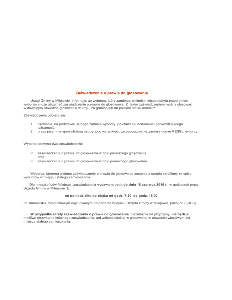 Zaświadczenie o prawie do głosowania Urząd Gminy w Milejewie informuje, że wyborca, który zamierza zmienić miejsce pobytu przed dniem wyborów może otrzymać zaświadczenie o prawie do głosowania. Z takim zaświadczeniem można głosować w dowolnym obwodzie głosowania w kraju, za granicą lub na polskim statku morskim. Zaświadczenia odbiera się: 1. 2. osobiście, na podstawie ustnego żądania wyborcy, po okazaniu dokumentu potwierdzającego tożsamość; przez pisemnie upoważnioną osobę, pod warunkiem, że upoważnienie zawiera numer PESEL wyborcy. Wyborca otrzyma dwa zaświadczenia: • • zaświadczenie o prawie do głosowania w dniu pierwszego głosowania, oraz zaświadczenie o prawie do głosowania w dniu ponownego głosowania. Wyborca, któremu wydano zaświadczenie o prawie do głosowania zostanie z urzędu skreślony ze spisu wyborców w miejscu stałego zamieszkania. Dla mieszkańców Milejewo zaświadczenia wydawane będą do dnia 18 czerwca 2010 r., w godzinach pracy Urzędu Gminy w Milejewie tj.: od poniedziałku do piątku od godz. 7:30 do godz. 15.00. na stanowisku meldunkowym usytuowanym na parterze budynku Urzędu Gminy w MIlejewie pokój nr 2 (USC) . W przypadku utraty zaświadczenia o prawie do głosowania, niezależnie od przyczyny, nie będzie możliwe otrzymanie kolejnego zaświadczenia, ani wzięcie udziału w głosowania w obwodzie właściwym dla miejsca stałego zamieszkania. Pełnomocnictwo do głosowania I. Prawo do ustanowienia pełnomocnika. Prawo do ustanowienia pełnomocnika, który w imieniu wyborcy odda głos w wyborach, ma wyborca ujęty w rejestrze wyborców gminy Milejewo i posiadający: 1. 2. 3. 4. orzeczenie o znacznym lub umiarkowanym stopniu niepełnosprawności; orzeczenie organu rentowego o: • całkowitej niezdolności do pracy i niezdolności do samodzielnej egzystencji; • niezdolności do samodzielnej egzystencji; • całkowitej niezdolności do pracy; • zaliczeniu do I grupy inwalidów; • zaliczeniu do II grupy inwalidów; stałą albo długotrwałą niezdolność do pracy w gospodarstwie rolnym i której przysługuje zasiłek pielęgnacyjny; oraz wyborca, który najpóźniej w dniu głosowania ukończyl 75 lat. II. Pełnomocnik. Pełnomocnikiem może być osoba: 1. 2. wpisana do rejestru wyborców gminy Milejewo; lub posiadająca zaświadczenie o prawie do głosowania. Pełnomocnikiem nie może być: • • • osoba wchodząca w skład obwodowej komisji wyborczej, właściwej dla obwodu głosowania osoby udzielającej pełnomocnictwa do głosowania; mąż zaufania zgłoszony przez komitet; kandydat na Prezydenta Rzeczypospolitej. Pełnomocnictwo do głosowania można przyjąć tylko od jednej osoby lub od dwóch osób, jeżeli co najmniej jedną z tych osób jest: • • • • • • wstępny (ojciec, matka, dziadek, babka, itd.): zstępny (syn, córka, wnuk, wnuczka, itd.); małżonek; brat; siostra; osoba pozostająca w stosunku przysposobienia, opieki lub kurateli w stosunku do pełnomocnika III. Postępowanie w sprawie sporządzenia aktu pełnomocnictwa. Wniosek o sporządzenie aktu pełnomocnictwa do głosowania wnosi się na odpowiednim formularzu (wersja doc, wersja pdf). Do wniosku należy dołączyć: • • • kopię aktualnego orzeczenia właściwego organu orzekającego o ustaleniu stopnia niepełnosprawności, jeżeli wyborca udzielający pełnomocnictwa w dniu głosowania nie będzie miał ukończonych 75 lat; pisemną zgodę osoby mającej być pełnomocnikiem na przyjęcie pełnomocnictwa do głosowania, złożoną na odpowiednim formularzu (wersja doc, wersja pdf); kopię zaświadczenia o prawie do głosowania wydanego osobie mającej być pełnomocnikiem, jeżeli osoba ta nie jest ujęta w rejestrze wyborców gminy Milejewo. Dopisanie do spisu wyborców Urząd Gminy w Milejewie informuje, że: 1. 2. wyborca przebywający czasowo na obszarze gminy Milejewo w okresie obejmującym dzień wyborów; oraz wyborca nigdzie niezamieszkały, przebywający na obszarze gminy Milejewo; na własny wniosek, wniesiony najpóźniej w 10 dniu przed dniem wyborów zostanie dopisany do spisu wyborców. Wyborca dopisany do spisu wyborców gminy Milejewo zostanie skreślony ze spisu wyborców sporządzonego przez urząd gminy właściwy ze względu na jego miejsce stałego zamieszkania. Wnioski o dopisanie do spisu wyborców należy składać do dnia 10 czerwca 2010 r., w godzinach pracy Urzędu Gminy w Milejewie tj.: od poniedziałku do piątku od godz. 7.30 do godz. 15.00 na stanowisku meldunkowym usytuowanym na parterze budynku Urzędu Gminy w Milejewie pokój nr 2. Podstawa prawna: art.:31 ust. 1 i 2, art. 34 pkt. 2 ustawy z dnia 27 września 1990 r. o wyborze Prezydenta Rzeczypospolitej Polskiej (tekst jednolity Dz. U. Nr 72 z 2010 r., poz. 467). Zasady powoływania kandydatów na członków obwodowych komisji wyborczych Zgodnie z kalendarzem wyborczym 28 maja br. upływa termin zgłaszania Prezydentowi Miasta kandydatów do obwodowych komisji wyborczych. • • • Kandydaci zgłaszani są przez komitety, które zarejestrowały kandydatów na Prezydenta RP. Kandydatami mogą być wyłącznie osoby ujęte w stałym rejestrze wyborców Gminy Milejewo Wzór zgłoszenia dostępny jest również w wersji papierowej w Urzędzie Gminy Biuro Rady Gminy (pokój 17 ). Każdy z kandydatów może być zgłoszony tylko do jednej komisji wyborczej. W przypadku zgłoszenia przez komitet wyborczy kilku kandydatów do jednej obwodowej komisji wyborczej, rozpatrywane jest zgłoszenie wcześniejsze, a gdy nie można tego ustalić – zgłoszenie tego kandydata, którego nazwisko zostało wcześniej wpisane do wykazu kandydatów na członków obwodowych komisji wyborczych. W przypadku zgłoszenia tego samego kandydata do kilku komisji rozpatrywane jest tylko zgłoszenie kandydata do komisji o najniższym numerze spośród obwodów, do których kandydat został zgłoszony. Jeśli zgłoszenia dokonuje osoba upoważniona do wykon
