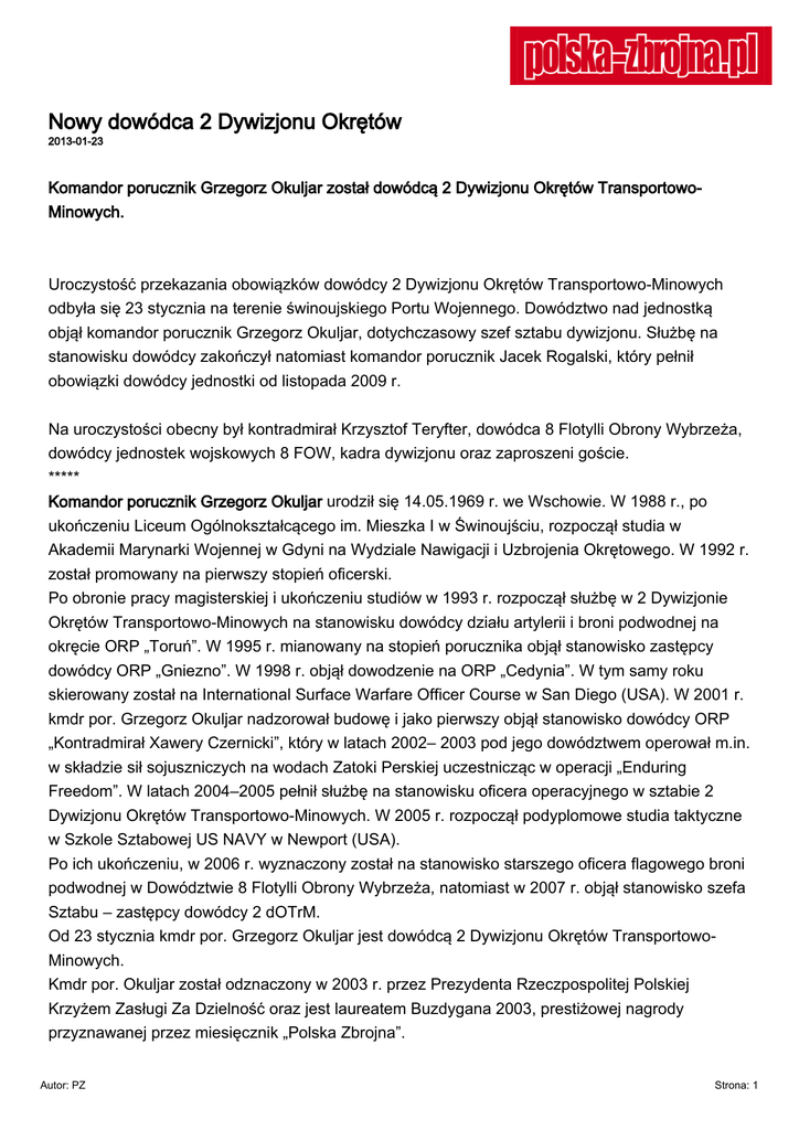 Nowy dowódca 2 Dywizjonu Okrętów 2013-01-23 Komandor porucznik Grzegorz Okuljar został dowódcą 2 Dywizjonu Okrętów TransportowoMinowych. Uroczystość przekazania obowiązków dowódcy 2 Dywizjonu Okrętów Transportowo-Minowych odbyła się 23 stycznia na terenie świnoujskiego Portu Wojennego. Dowództwo nad jednostką objął komandor porucznik Grzegorz Okuljar, dotychczasowy szef sztabu dywizjonu. Służbę na stanowisku dowódcy zakończył natomiast komandor porucznik Jacek Rogalski, który pełnił obowiązki dowódcy jednostki od listopada 2009 r. Na uroczystości obecny był kontradmirał Krzysztof Teryfter, dowódca 8 Flotylli Obrony Wybrzeża, dowódcy jednostek wojskowych 8 FOW, kadra dywizjonu oraz zaproszeni goście. ***** Komandor porucznik Grzegorz Okuljar urodził się 14.05.1969 r. we Wschowie. W 1988 r., po ukończeniu Liceum Ogólnokształcącego im. Mieszka I w Świnoujściu, rozpoczął studia w Akademii Marynarki Wojennej w Gdyni na Wydziale Nawigacji i Uzbrojenia Okrętowego. W 1992 r. został promowany na pierwszy stopień oficerski. Po obronie pracy magisterskiej i ukończeniu studiów w 1993 r. rozpoczął służbę w 2 Dywizjonie Okrętów Transportowo-Minowych na stanowisku dowódcy działu artylerii i broni podwodnej na okręcie ORP „Toruń”. W 1995 r. mianowany na stopień porucznika objął stanowisko zastępcy dowódcy ORP „Gniezno”. W 1998 r. objął dowodzenie na ORP „Cedynia”. W tym samy roku skierowany został na International Surface Warfare Officer Course w San Diego (USA). W 2001 r. kmdr por. Grzegorz Okuljar nadzorował budowę i jako pierwszy objął stanowisko dowódcy ORP „Kontradmirał Xawery Czernicki”, który w latach 2002– 2003 pod jego dowództwem operował m.in. w składzie sił sojuszniczych na wodach Zatoki Perskiej uczestnicząc w operacji „Enduring Freedom”. W latach 2004–2005 pełnił służbę na stanowisku oficera operacyjnego w sztabie 2 Dywizjonu Okrętów Transportowo-Minowych. W 2005 r. rozpoczął podyplomowe studia taktyczne w Szkole Sztabowej US NAVY w Newport (USA). Po ich ukończeniu, w 2006 r. wyznaczony został na stanowisko starszego oficera flagowego broni podwodnej w Dowództwie 8 Flotylli Obrony Wybrzeża, natomiast w 2007 r. objął stanowisko szefa Sztabu – zastępcy dowódcy 2 dOTrM. Od 23 stycznia kmdr por. Grzegorz Okuljar jest dowódcą 2 Dywizjonu Okrętów TransportowoMinowych. Kmdr por. Okuljar został odznaczony w 2003 r. przez Prezydenta Rzeczpospolitej Polskiej Krzyżem Zasługi Za Dzielność oraz jest laureatem Buzdygana 2003, prestiżowej nagrody przyznawanej przez miesięcznik „Polska Zbrojna”. Autor: PZ Strona: 1 Jego pasją jest fotografia i turystyka górska. Komandor porucznik Jacek Rogalski urodził się 19.04.1964 r. w Wałbrzychu. Po ukończeniu Liceum Elektronicznego w Dzierżoniowie postanowił związać się z morskim rodzajem Sił Zbrojnych RP. W 1990 r. zakończył naukę w gdyńskiej Akademii Marynarki Wojennej na Wydziale Nawigacji i Uzbrojenia Okrętowego oraz został skierowany do służby w 8 Flotylli Obrony Wybrzeża. W 14-letniej służbie na okrętach dowodził m.in. działem okrętowym na ORP „Lublin” i ORP „Kraków”, był zastępcą dowódcy okrętu ORP „Gniezno” i ORP „Toruń”. Od 1996 r. dowodził okrętem ORP „Poznań”, a w 2003 r. został dowódcą okrętu ORP „Kontradmirał Xawery Czernicki”. W latach 2004–2007 piastował stanowisko zastępcy dowódcy – szefa Sztabu 2 Dywizjonu Okrętów Transportowo-Minowych, a w latach 2007–2009 dowodził Dywizjonem Pomocniczych Jednostek Pływających. W 2009 r. został dowódcą 2 Dywizjonu Okrętów Transportowo-Minowych. Komandor porucznik Jacek Rogalski jest absolwentem studiów podyplomowych oraz wielu kursów i szkoleń w tym m.in. w Kanadzie. Uczestniczył w działaniach wojennych w państwach byłej Jugosławii oraz w operacji „Iraqi Freedom” na wodach Zatoki Perskiej, gdzie dowodził okrętem ORP „Kontradmirał Xawery Czernicki”. W 2002 r. dowodził grupą okrętów podczas strategicznych ćwiczeń NATO pk. „Strong Resolve” w północnej Norwegii. Źródło: kmdr ppor. Jacek Kwiatkowski/ 8 FOW Autor: PZ Strona: 2
