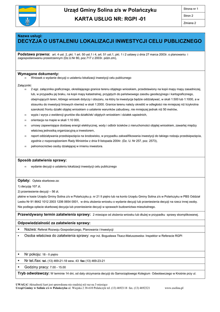 Urząd Gminy Solina z/s w Polańczyku KARTA USŁUG NR: RGPI