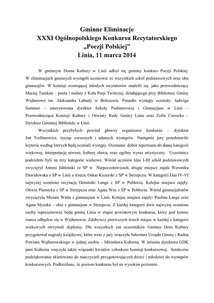 Gminne Eliminacje XXXI Ogólnopolskiego Konkursu Recytatorskiego „Poezji Polskiej” Linia, 11 marca 2014 W gminnym Domu Kultury w Linii odbył się gminny konkurs Poezji Polskiej. W eliminacjach gminnych wystąpili uczniowie ze wszystkich szkół podstawowych oraz obu gimnazjów. W komisji oceniającej młodych recytatorów znaleźli się: jako przewodniczący Maciej Tamkun – poeta i malarz z Koła Pasji Twórczej, działającego przy Bibliotece Gminy Wejherowo im. Aleksandra Labudy w Bolszewie. Ponadto występy oceniały: Jadwiga Sommer – emerytowana dyrektor Szkoły Podstawowej i Gimnazjum w Linii – Przewodnicząca Komisji Kultury i Oświaty Rady Gminy Linia oraz Zofia Cierocka – Dyrektor Gminnej Biblioteki w Linii. Wszystkich przybyłych powitał główny organizator konkursu – dyrektor Jan Trofimowicz, życząc owocnych i udanych występów. Następnie jury przedstawiło kryteria według których będą oceniali występy. Oceniano: dobór repertuaru do danej kategorii wiekowej, interpretację utworu, kulturę słowa, oraz ogólny wyraz artystyczny. Uczestnicy podzieleni byli na trzy kategorie wiekowe. Wśród uczniów klas I-III szkół podstawowych zwyciężył Antoni Jabłoński ze SP w Niepoczołowicach, drugie miejsce zajęła Weronika Dawidowska z SP w Linii a trzecie Oskar Kozerski z SP w Strzepczu. W kategorii klas IV-VI najwyżej oceniono recytację Dominiki Lange z SP w Pobłociu. Kolejne miejsca zajęły: Oliwia Piernicka z SP w Strzepczu oraz Agata Wos z SP w Pobłociu. Wśród gimnazjalistów zwyciężyła Miriam Wetta z gimnazjum w Linii. Kolejne miejsca zajęły: Paulina Lange oraz Agata Myszka – obie z gimnazjum w Strzepczu. Z każdej kategorii dwie najwyżej ocenione osoby reprezentować będą gminę Linia w etapie powiatowym konkursu, który pod koniec marca odbędzie się w Wejherowie. Zdobywcy pierwszych trzech miejsc w każdej z kategorii wiekowych otrzymali dyplomy. Dla wszystkich zaś uczestników Gminny Dom Kultury przygotował nagrody książkowe, które wraz z jury wręczyła Sekretarz Urzędu Gminy i Radna Powiatu Wejherowskiego w jednej osobie – Mirosława Kuberna. W imieniu dyrektora GDK pani Kuberna wręczyła także wiązanki kwiatów członkom komisji konkursowej. Serdeczne podziękowania skierowano do nauczycieli przygotowujących dzieci i młodzież do występów konkursowych. Podkreślano, że poziom konkursu był na wysokim poziomie.