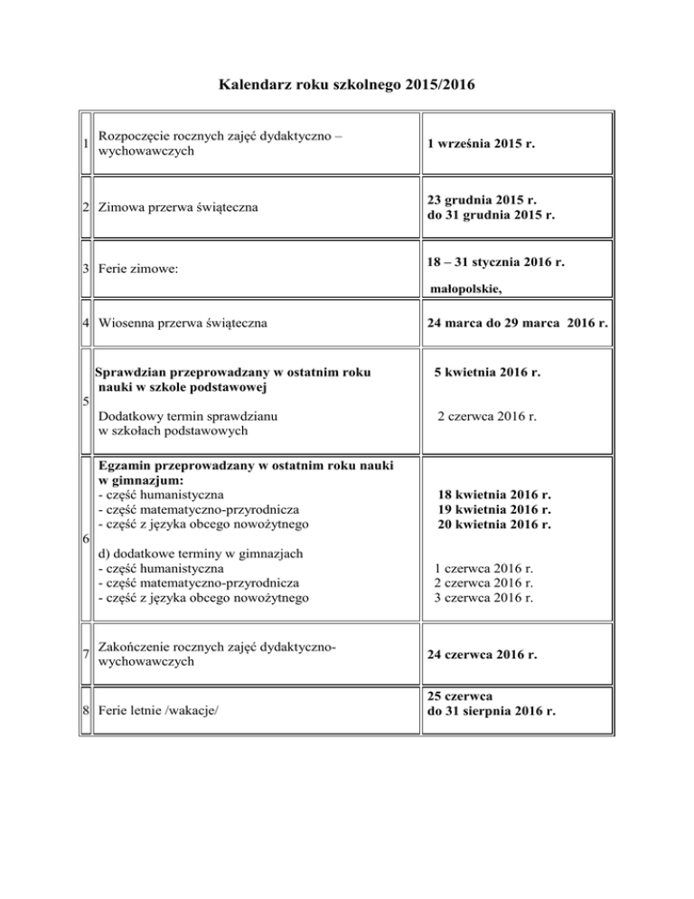 Kalendarz roku szkolnego 2015/2016 1 Rozpoczęcie rocznych zajęć dydaktyczno – wychowawczych 2 Zimowa przerwa świąteczna 3 Ferie zimowe: 1 września 2015 r. 23 grudnia 2015 r. do 31 grudnia 2015 r. 18 – 31 stycznia 2016 r. małopolskie, 4 Wiosenna przerwa świąteczna 24 marca do 29 marca 2016 r. Sprawdzian przeprowadzany w ostatnim roku nauki w szkole podstawowej 5 kwietnia 2016 r. Dodatkowy termin sprawdzianu w szkołach podstawowych 2 czerwca 2016 r. 5 Egzamin przeprowadzany w ostatnim roku nauki w gimnazjum: - część humanistyczna - część matematyczno-przyrodnicza - część z języka obcego nowożytnego 18 kwietnia 2016 r. 19 kwietnia 2016 r. 20 kwietnia 2016 r. d) dodatkowe terminy w gimnazjach - część humanistyczna - część matematyczno-przyrodnicza - część z języka obcego nowożytnego 1 czerwca 2016 r. 2 czerwca 2016 r. 3 czerwca 2016 r. 6 7 Zakończenie rocznych zajęć dydaktycznowychowawczych 8 Ferie letnie /wakacje/ 24 czerwca 2016 r. 25 czerwca do 31 sierpnia 2016 r.