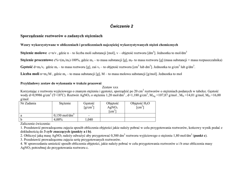 Ćwiczenie 2 Sporządzanie roztworów o zadanych stężeniach