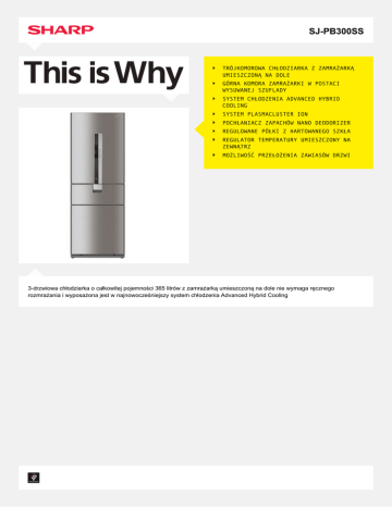 SJ-PB300SS TRÓJKOMOROWA CHŁODZIARKA Z ZAMRAŻARKĄ UMIESZCZONĄ NA DOLE GÓRNA KOMORA ZAMRAŻARKI W POSTACI WYSUWANEJ SZUFLADY SYSTEM CHŁODZENIA ADVANCED HYBRID COOLING SYSTEM PLASMACLUSTER ION POCHŁANIACZ ZAPACHÓW NANO DEODORIZER REGULOWANE PÓŁKI Z HARTOWANEGO SZKŁA REGULATOR TEMPERATURY UMIESZCZONY NA ZEWNĄTRZ MOŻLIWOŚĆ PRZEŁOŻENIA ZAWIASÓW DRZWI 3-drzwiowa chłodziarka o całkowitej pojemności 365 litrów z zamrażarką umieszczoną na dole nie wymaga ręcznego rozmrażania i wyposażona jest w najnowocześniejszy system chłodzenia Advanced Hybrid Cooling POJEMNOŚĆ NAJWAŻNIEJSZE ZALETY Całkowita pojemność brutto (litry): 365 Pojemność brutto zamrażarki (litry): 166 Pojemność brutto lodówki (litry): 199 Całkowita pojemność netto (litry): 300 Pojemność netto zamrażarki (litry): upper: 30 lower: 86 Pojemność netto lodówki (litry): 184 Kolor: Srebro wysokiej próby Klasa sprawności energetycznej: A+ Zużycie energii (kWh/rok): 285 Technologia z inwerterem: Czynnik chłodzący: R600a FUNKCJE LODÓWKI FUNKCJE ZAMRAŻARKI System No Frost: System Hybrid Cooling: System Plasmacluster Ion: Pochłaniacz zapachów Nano: Szuflada na świeże produkty (ok. 3°C): Szuflada mała: Regulowane szklane półki: 3 Półka na warzywa: 1 Pojemnik na owoce i warzywa: 2 Pojemniki w drzwiach: 2 Pojemnik na butelki: 1 Pojemnik na jajka (foremka): 1 Oświetlenie wnętrza (klasyczne/LED): /2 pieces of high intensity lightning System No Frost: Błyskawiczne zamrażanie: Kategoria zamrażarki - gwiazdki (komora/drzwi): 4/ Komory zamrażarki: 2 Szuflada zamrażarki: upper: 1 lower: 3 Foremka do wytwarzania lodu: 1 Pojemnik na lód (wydzielona część): 1 Półka z prętów/szklana: 1/ UŻYTECZNE FUNKCJE Alarm otwartych drzwi: Zabezpieczenie przed dziećmi: Tryb wakacyjny: Komunikat o awarii zasilania: WYŚWIETLACZ I STEROWANIE Elektroniczny wyświetlacz i sterowanie: LED Wyświetlacz do regulacji temperatury: Wyświetlacz w komorze: Wskaźnik temperatury: INNE Liczba drzwi: 3 Typ drzwi: Reversible door Typ uchwytu: Wkomponowany w płaszczyznę drzwi Kod EAN: 4974019606781 DANE TECHNICZNE Napięcie znamionowe (V) / częstotliwość (Hz): 220-240/50 Klasa klimatyczna: T Poziom szumów (dB): 40 Wydajność zamrażąnia (kg/ 24 godz.): 7,5 Czas wzrostu temperatury (godz.): 11 Wymiary bez uchwytu (szer. x wys. x gł.) mm: 600 x 1800 x 655 Wymiary z uchwytem (szer. x wys. x gł.) mm: 600 x 1800 x 655 Ciężar netto (kg): 76 Ciężar brutto (kg): 85 WYPOSAŻENIE OPCJONALNE Zestaw zawiasów: SJ-LB300SD Kod EAN do zestawu zawiasów: 4974019624228 www.sharp.pl Powered by TCPDF (www.tcpdf.org) SHARP ELECTRONICS (EUROPE) GMBH SPółKA Z O. O. ODDZIAł W POLSCE UL. POLECZKI 33 BUDYNEK A2 02-822 WARSZAWA TEL.: +48 22 545 81 00 FAKS: +48 22 545 81 00 FAKS: +48 22 545 81 05 WWW.SHARP.PL