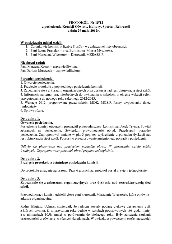 PROTOKÓŁ Nr 15/12 z posiedzenia Komisji Oświaty, Kultury, Sportu i Rekreacji z dnia 29 maja 2012r. W posiedzeniu udział wzięli: 1. Członkowie komisji w liczbie 8 osób - wg załączonej listy obecności. 2. Pani Iwona Franelak – z-ca Burmistrza Miasta Myszkowa. 3. Pani Marzanna Wieczorek – Kierownik MZEASZiP. Nieobecni radni: Pani Marzena Kozak – usprawiedliwiona. Pan Dariusz Muszczak – usprawiedliwiony. Porządek posiedzenia: 1. Otwarcie posiedzenia. 2. Przyjęcie protokołu z poprzedniego posiedzenia komisji. 3. Zapoznanie się z arkuszami organizacyjnych oraz dyskusja nad restrukturyzacją sieci szkół. 4. Informacja na temat prac niezbędnych do wykonania w szkołach w okresie wakacji celem przygotowania do nowego roku szkolnego 2012/2013. 5. Wakacje 2012- proponowane przez szkoły, MDK, MOSiR formy wypoczynku dzieci i młodzieży. 6. Sprawy różne. Do punktu 1. Otwarcie posiedzenia. Posiedzenie komisji otworzył i prowadził przewodniczący komisji pan Jacek Trynda. Powitał zebranych na posiedzeniu. Stwierdził prawomocność obrad. Przedstawił porządek posiedzenia. Zaproponował zmianę w pkt 3 poprzez wykreślenie z porządku dyskusji nad restrukturyzacją sieci szkół. Poprosił o przegłosowanie zmienionego porządku posiedzenia. Odbyło się głosowanie nad przyjęciem porządku obrad. W głosowaniu wzięło udział 6 radnych. Zaproponowany porządek obrad przyjęto jednogłośnie. Do punktu 2. Przyjęcie protokołu z ostatniego posiedzenia komisji. Do protokołu uwag nie zgłoszono. Przy 6 głosach za, protokół został przyjęty jednogłośnie. Do punktu 3. Zapoznanie się z arkuszami organizacyjnych oraz dyskusja nad restrukturyzacją sieci szkół. Przewodniczący komisji udzielił głosu pani kierownik Marzannie Wieczorek, która omówiła arkusze organizacyjne. Radny Eligiusz Uchnast stwierdził, że radnym zostały podane ciekawe zestawienia cyfr, z których wynika, iż w przyszłym roku będzie w szkołach podstawowych 168 godz. mniej, a w gimnazjach 105h. mniej w porównaniu do bieżącego roku. Były założenia szukania oszczędności w oświacie w różnych dziedzinach. W związku z powyższym część nauczycieli 1 odejdzie na emeryturę, część będzie miała ograniczone etaty. Zapytał czy w związku z oszczędnościami są zwolnienia nauczycieli? Jakie są na dzień dzisiejszy przybliżone kwoty oszczędności? Pani Marzanna Wieczorek odpowiedziała, że były dwa przypadki wygaśnięcia umów o pracę i zwolnień w trybie art.20 Karty nauczyciela, ale wyłącznie nauczycieli posiadających uprawnienia emerytalne. Z odpowiedzią na drugie pytanie pani kierownik powiedziała, że się wstrzyma do pierwszych dni czerwca, bowiem nie wie jaka będzie ostateczna decyzja nauczycieli czy przejdą na emeryturę, czy zgodzą się na ograniczenie etatów? Jeśli zostaną wypłacone dla 7 osób 9-miesięczne odprawy, to będzie dość duży koszt, ale on się przełoży na dopłaty do godzin. Przewodniczący komisji zapytał o liczbę osób objętych uprawnieniami emerytalnymi oraz ograniczenia wymiaru godzin. Pani kierownik odpowiedziała, że w całym Myszkowie jest 25 osób z uprawnieniami emerytalnymi, z czego być może 7 odejdzie. W kwestii ograniczenia wymiaru w każdej szkole jest inna sytuacja, przeważnie jest to o 2h – taka jest średnia. Zwróciła uwagę na fakt, że po raz pierwszy nie ma zapowiedzi urlopów zdrowotnych. Radny Eligiusz Uchnast poprosił panią kierownik o sprecyzowanie przybliżonej kwoty oszczędności, by radni mogli się zapoznać jaką kwotę oszczędności pociągną wprowadzone reformy. Komisja sformułowała wniosek: Komisja wnioskuje o przygotowanie i podanie w terminie do 4 lipca 2012r. kwoty oszczędności wynikających z tytułu przeprowadzonych do tej pory działań zmierzających do uzdrowienia oświaty w Myszkowie. Odbyło się głosowanie. W głosowaniu uczestniczyło 7 radnych, przy 7 głosach za, wniosek został przyjęty – jednomyślnie. Pani kierownik poinformowała radnych o sytuacji w przedszkolach. Przedstawiła tabelaryczne zestawienie dzieci przyjętych do przedszkoli (materiał stanowi załącznik do protokołu). Radny Andrzej Giewon odniósł się do przedstawionych danych mówiąc, że brak miejsc dla dzieci w przedszkolach to efekt nieprzewidywania przyszłości i zlikwidowania kiedyś dwóch przedszkoli. Radny Eligiusz Uchnast odczytał z danych przedstawionych w tabeli, iż następuje wzrost deklarowanych godzin, rodzice podpisują umowy na dłuższy czas pobytu dziecka w przedszkolu. Pani Marzanna Wieczorek powiedziała, że widać wyraźnie w skali miasta wzrost liczby dzieci zapisywanych na liczbę godzin większą niż 5. Tym samym nastąpił wzrost liczby godzin pobytu dziecka na placówce, co jest z korzyścią zarówno dla dzieci jak i gminy. Pani kierownik poinformowała, że trzem dyrektorom skończyła się kadencja jednak będą one przedłużone, w przedszkolu nr 1 będzie prawdopodobnie wakat na stanowisku dyrektora, gdyż pani dyrektor odchodzi na emeryturę. 2 Przewodniczący komisji zapytał ile sześciolatków jest w szkołach podstawowych i ile ma zamiar w przyszłym roku szkolnym pójść do szkoły? Pani kierownik powiedziała, że w ubiegłym roku powstała cała klasa ponieważ było 42sześciolatków, w tym roku w szkołach 3 i 5 mamy po kilkoro, łącznie ok. 12 zostaną rozparcelowani. Osobnej klasy nie będzie. Radny Eligiusz Uchnast poprosił w przybliżeniu o liczbę osób, które skorzystały z ulgi przyznanej uchwałą rady w sprawie obniżenia opłaty na drugie i trzecie dziecko w rodzinie uczęszczające do przedszkola. Czy w przedszkolach jest preferowane postępowanie konkursowe na stanowisko dyrektora? Pani kierownik odpowiedziała, że 35 dzieci niepełnosprawnych i 55 rodzeństwa, w sumie około 100 dzieci. Więcej niż planowała gmina. W kwestii konkursów odpowiedziała, że dla przedszkoli i szkół jest ta sama ustawa. Radna Elżbieta Kościow s