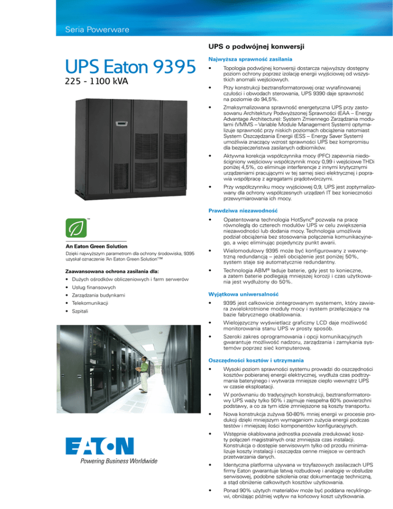 Seria Powerware UPS o podwójnej konwersji UPS Eaton 9395 225 - 1100 kVA Najwyższa sprawność zasilania • Topologia podwójnej konwersji dostarcza najwyższy dostępny poziom ochrony poprzez izolację energii wyjściowej od wszystkich anomalii wejściowych. • Przy konstrukcji beztransformatorowej oraz wyrafinowanej czułości i obwodach sterowania, UPS 9390 daje sprawność na poziomie do 94,5%. • Zmaksymalizowana sprawność energetyczna UPS przy zastosowanu Architektury Podwyższonej Sprawności (EAA – Energy Advantage Architecture): System Zmiennego Zarządzania modułami (VMMS – Variable Module Management System) optymalizuje sprawność przy niskich poziomach obciążenia natomiast System Oszczędzania Energii (ESS – Energy Saver System) umożliwia znaczący wzrost sprawności UPS bez kompromisu dla bezpieczeństwa zasilanych odbiorników. • Aktywna korekcja współczynnika mocy (PFC) zapewnia niedościgniony wejściowy współczynnik mocy 0,99 i wejściowe THDi poniżej 4,5%, co eliminuje interferencje z innymi krytycznymi urządzeniami pracującymi w tej samej sieci elektrycznej i poprawia współpracę z agregatami prądotwórczymi. • Przy współczynniku mocy wyjściowej 0,9, UPS jest zoptymalizowany dla ochrony współczesnych urządzeń IT bez konieczności przewymiarowania ich mocy. Prawdziwa niezawodność ™ Dzięki najwyższym parametrom dla ochrony środowiska, 9395 uzyskał oznaczenie ‘An Eaton Green Solution’™ Zaawansowana ochrona zasilania dla: • Opatentowana technologia HotSync® pozwala na pracę równoległą do czterech modułów UPS w celu zwiększenia niezawodności lub dodania mocy. Technologia umożliwia podział obciążenia bez stosowania połączenia komunikacyjnego, a więc eliminując pojedynczy punkt awarii. • Wielomodułowy 9395 może być konfigurowany z wewnętrzną redundancją – jeżeli obciążenie jest poniżej 50%, system staje się automatycznie redundantny. • Technologia ABM® ładuje baterie, gdy jest to konieczne, a zatem baterie podlegają mniejszej korozji i czas użytkowania jest wydłużony do 50%. • Dużych ośrodków obliczeniowych i farm serwerów • Usług finansowych • Zarządzania budynkami Wyjątkowa uniwersalność • Telekomunikacji • 9395 jest całkowicie zintegrowanym systemem, który zawiera zwielokrotnione moduły mocy i system przełączający na bazie fabrycznego okablowania. • Wielojęzyczny wyświetlacz graficzny LCD daje możliwość monitorowania stanu UPS w prosty sposób. • Szeroki zakres oprogramowania i opcji komunikacyjnych gwarantuje możliwość nadzoru, zarządzania i zamykania systemów poprzez sieć komputerową. • Szpitali Oszczędności kosztów i utrzymania • Wysoki poziom sprawności systemu prowadzi do oszczędności kosztów pobieranej energii elektrycznej, wydłuża czas podtrzymania bateryjnego i wytwarza mniejsze ciepło wewnątrz UPS w czasie eksploatacji. • W porównaniu do tradycyjnych konstrukcji, beztransformatorowy UPS waży tylko 50% i zajmuje niespełna 60% powierzchni podstawy, a co za tym idzie zmniejszone są koszty transportu. • Nowa konstrukcja zużywa 50-80% mniej energii w procesie produkcji dzięki mniejszym wymaganiom zużycia energii podczas testów i mniejszej ilości komponentów konfiguracyjnych. • Wstępnie okablowana jednostka pozwala zredukować koszty połączeń magistralnych oraz zmniejsza czas instalacji. Konstrukcja o dostępie serwisowym tylko od przodu minimalizuje koszty instalacji i oszczędza cenne miejsce w centrach przetwarzania danych. • Identyczna platforma używana w trzyfazowych zasilaczach UPS firmy Eaton gwarantuje łatwą rozbudowę i analogię w obsłudze serwisowej, podobne szkolenia oraz dokumentację techniczną, a stąd obniżenie całkowitych kosztów użytkowania. • Ponad 90% użytych materiałów może być poddana recyklingowi, obniżając później wpływ na końcowy koszt użytkowania. UPS Eaton 9395 225- 1100 kVA Specyfikacja techniczna Wyjściowe moce znamionowe UPS (wsp. mocy 0,9) kVA 225 275 450 550 675 825 900 1100 kW 204 250 408 500 612 750 816 1000 Przeciążenie falownika 10 min. 100-110%; 30 s 110-125%; 10 s 125-150%; 300 ms > 150% Przeciążenie przy dostępnym bypassie Ciągle < 115%; 20 ms 1000%; Uwaga. Zabezpieczenia toru obejściowego mogą ograniczać możliwości przeciążeniowe Ogólne Baterie akumulatorów Sprawność w trybie podwójnej konwersji (pełne obciążenie) >94% Sprawność w trybie podwójnej konwersji (połowa obciążenia) >93% Typ baterii Baterie bezobsługowe VRLA, AGM, NiCd, żelowe (z kołem zamachowym - na zapytanie) Metoda ładowania Technologia ABM lub ładowanie konserwacyjne Kompensacja temperatury z EMP Nominalne napięcie baterii (ołowiowo-kwasowych) 480 V (40 x 12 V, 240 ogniw) Prąd ładowania / Model Domyślnie, A Maksymalnie*, A 275 38 83 VMMS (podwójna konwersja) zdecydowany wzrost wydajności przy niskich obciążeniach Sprawność w trybie oszczędzania energii (ESM) Do 99% Jednostki systemu równoległego z technologią HotSync 5+1 Możliwość wewnętrznej redundancji N+1 dla 550 ; 275 kVA dla 825 : 550 kVA dla 1100 : 825 kVA Rozbudowa w miejscu instalacji Tak Technologia prostownika/ falownika Beztransformatorowa, IGBT z PWM Poziom hałasu < 76 dB; < 81 dB (825 i 1100 kVA) Wysokość n.p.m. 1000 m bez przewymiarowania (maks. 2000 m) Moduł do rozbudowy w miejscu instalacji 225 lub 275 kVA 740 x 880 x 1880 mm 600 kg Wejście 675, 825 kVA 3710 x 880 x 1880 mm 2520 kg Typ instalacji wejściowej 3-faz. + N +PE 4450 x 880 x 1880 mm 3120 kg Napięcie znamionowe (konfigurowalne) 675, 825 kVA + 1 redundancyjny 220/380, 230/400, 240/415 V 50/60 Hz 1100 kVA 4450 x 880 x 1880 mm 3120 kg Zakres napięcia wejściowego + 15% / -15%, +10% / -10% dla bypass Zakres częstotliwości 45 - 65 Hz Współczynnik mocy wejściowej 0,99 Wejściowe THDi < 3,5% przy normalnym obciążeniu w zależności od VTHD Funkcja ‘miękkiego startu’ Tak Wewnętrzne zab