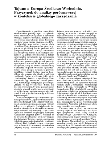 Tajwan a Europa ¥rodkowo-Wschodnia. Przyczynek do analizy porównawczej w kontekĂcie globalnego zarzÈdzania Opublikowanie w polskim czasopiĂmie akademickim poĂwiÚconym zarzÈdzaniu bloku materiaïów zwiÈzanych z Tajwanem wymaga usprawiedliwienia. Rzecz dotyczy przecieĝ niewielkiego kraju dosïownie i metaforycznie bardzo oddalonego od Polski. Zupeïnie inna byïaby sytuacja, gdyby chodziïo o Chiny kontynentalne, potÚĝnego gracza na globalnej arenie, podmiot ekspansywnej ekonomii i kultury, które trzeba jak najszybciej poznaÊ i jak najlepiej zrozumieÊ. A jednak przedstawiciele takich subdyscyplin zarzÈdzania jak zarzÈdzanie róĝnorodnoĂciÈ oraz zarzÈdzanie miÚdzykulturowe przestrzegajÈ przed pochopnymi uproszczeniami. DoĂwiadczeni przez relatywizm, który na dobre zadomowiï siÚ w obszarze ich pracy wyczuleni sÈ na trudnoĂci i wrÚcz puïapki zwiÈzane z próbami przekïadu róĝnych kultur. Sprawa komplikuje siÚ jeszcze, gdy chodzi o odrÚbne cywilizacje. Sedno problemów, jakie niesie „barbarzyñcy” kontakt z cywilizacjÈ Chin, lapidarnie ujÈï Theodore Zeldin (1998: 497) formuïujÈc nastÚpujÈcÈ przestrogÚ: „Trzeba by ĝyÊ wielokrotnie dïuĝej, niĝ ĝyje siÚ przeciÚtnie, by móc poznaÊ nawet niewielki uïamek myĂli, którÈ pozostawili po sobie chiñscy mÚdrcy, uczeni, aforyĂci i poeci, i która byïaby interesujÈca dla nas, wspóïczesnych.” W tej sytuacji pozostaje korzystanie z pomocy poĂredników, „agentów kulturowych”, czyli pojedynczych ludzi i szerszych zbiorowoĂci, usytuowanych na pograniczu róĝnych kultur czy cywilizacji. DoĂwiadczenie tajwañskie okazuje siÚ tu niezwykle uĝyteczne. Juĝ przed wielu laty istotÚ tego kraju trafnie opisaï dla Polaków emigracyjny publicysta Aleksander Bregman (1968). Wskazaï on na dwa (nadal aktualne) elementy niejako konstytuujÈce Tajwan: sukces gospodarczy i dbaïoĂÊ o zapewnienie ciÈgïoĂci cywilizacji chiñskiej. DziĂ dochodzi jeszcze reinterpretacja toĝsamoĂci kulturowej mieszkañców „PiÚknej wyspy” (Formozy, jak nazwali 96 Tajwan szesnastowieczni koloniĂci portugalscy) w oparciu o wïasne tradycje ze zdystansowaniem siÚ do roli „duchowego” reprezentowania Chin kontynentalnych. Wspomniany wczeĂniej relatywizm sïusznie przestrzega jednak przed zbytnim przywiÈzaniem do etykiet, nawet tak pojemnych jak kategoria „poĂrednictwo kulturowe”. Tajwan, mimo niewielkiego obszaru i nieduĝej liczby ludnoĂci, jest takĝe istotnym graczem globalnej gry. Wystarczy przypomnieÊ, iĝ na poczÈtku lat 90. ubiegïego stulecia, gdy rozwój gospodarczy „azjatyckich tygrysów” osiÈgaï apogeum, „PiÚkna Wyspa” miaïa takie same obroty w handlu zagranicznym jak Chiny kontynentalne, posiadajÈc 2% ich ludnoĂci i 0,4% powierzchni (Polit 1997). DziĂ przepaĂÊ miÚdzy dwoma chiñskim pañstwami nie jest juĝ tak duĝa, ale Tajwan nadal naleĝy do gospodarczych potÚg i aktualnie szuka partnerów miÚdzy innymi w Europie ¥rodkowo-Wschodniej. DziÚki patronatowi prof. Alojzego Z. Nowaka, dziekana Wydziaïu ZarzÈdzania UW, oraz dr Ming-Yich Lin, dyrektora Wydziaïu Kultury Biura Gospodarczo- Kulturalnego Tajpej w Polsce, rozpoczÚïo na Wydziale ZarzÈdzania UW dziaïalnoĂÊ niewielkie seminarium poĂwiÚcone wybranym aspektom doĂwiadczeñ tajwañskich i Ărodkowoeuropejskich w kontekĂcie komunikacji miÚdzykulturowej. Prezentowany wybór artykuïów stanowi pokïosie sympozjum, które 4 lipca 2007 zainaugurowaïo prace wspomnianego seminarium. Wszystkie publikowane teksty majÈ charakter wprowadzajÈcy. Pierwsze trzy artykuïy sÈ autorstwa badaczy tajwañskich, obecnych na lipcowym sympozjum. Prof. Hung Mei-Lan z Narodowego Uniwersytetu Chengchi, specjalizujÈca siÚ miÚdzy innymi w ekonomii spoïecznej oraz w problematyce Wspólnoty Pañstw Niepodlegïych, przedstawia aktualnÈ sytuacjÚ gospodarki Tajwanu z jej priorytetowym traktowaniem handlu zagranicznego jako gïównego instrumentu wobec Studia i Materiaïy – Wydziaï ZarzÈdzania UW wyzwañ globalizacji. Prof. Kwo Wa-Ping, dyrektor Instytutu Studiów Europejskich na Uniwersytecie Nanhua, obszernie realizuje zadania „agenta kulturowego”, omawiajÈc – w sposób nakierowany na odbiorcÚ z Europy – uwarunkowania obecnej sytuacji Tajwanu w kontekĂcie stosunków tego pañstwa z ChRL. Ting-You Lee, doktorantka Instytutu Socjologii Uniwersytetu Warszawskiego, prezentuje badania dotyczÈce wartoĂci konfucjañskich deklarowanych przez menedĝerów z Tajwanu pracujÈcych na terenie Polski w porównaniu z deklaracjami polskich pracowników. Ostatni tekst prezentowanego wyboru powstaï na Wydziale ZarzÈdzania UW. Artykuï Mirosïawa Przygody oraz niĝej podpisanego jest propozycjÈ katalogu problemów, które mogÈ staÊ siÚ przedmiotem dyskusji, a nastÚpnie badañ porównawczych wybranych doĂwiadczeñ Tajwanu i krajów 2/2007 Europy ¥rodkowo-Wschodniej (przede wszystkim na przykïadzie Polski). Tekst ten stanowi zaproszenie do wspóïudziaïu we wspomnianych przedsiÚwziÚciach. ChÚtnych proszÚ o kontakt pod podanym poniĝej adresem e-mailowym. Tomasz Ochinowski e-mail: [email protected]. Bibliografia Bregman, A. 1968. Rubieĝe wolnoĂci. Reportaĝe z pogranicza Ăwiata komunistycznego w Europie i Azji, Londyn: Oficyna Poetów i Malarzy. Polit, J. 1997. Daleki Wschód. w: Patek, A., Rydel, J. i WÚc, J. (red.). Najnowsza historia Ăwiata 1945–1995, t. III, s. 156–166. Kraków: Wydawnictwo Literackie. Zeldin, Th. 1998. Intymna historia ludzkoĂci, tïum. Stokïosa, B., Warszawa: WAB. 97